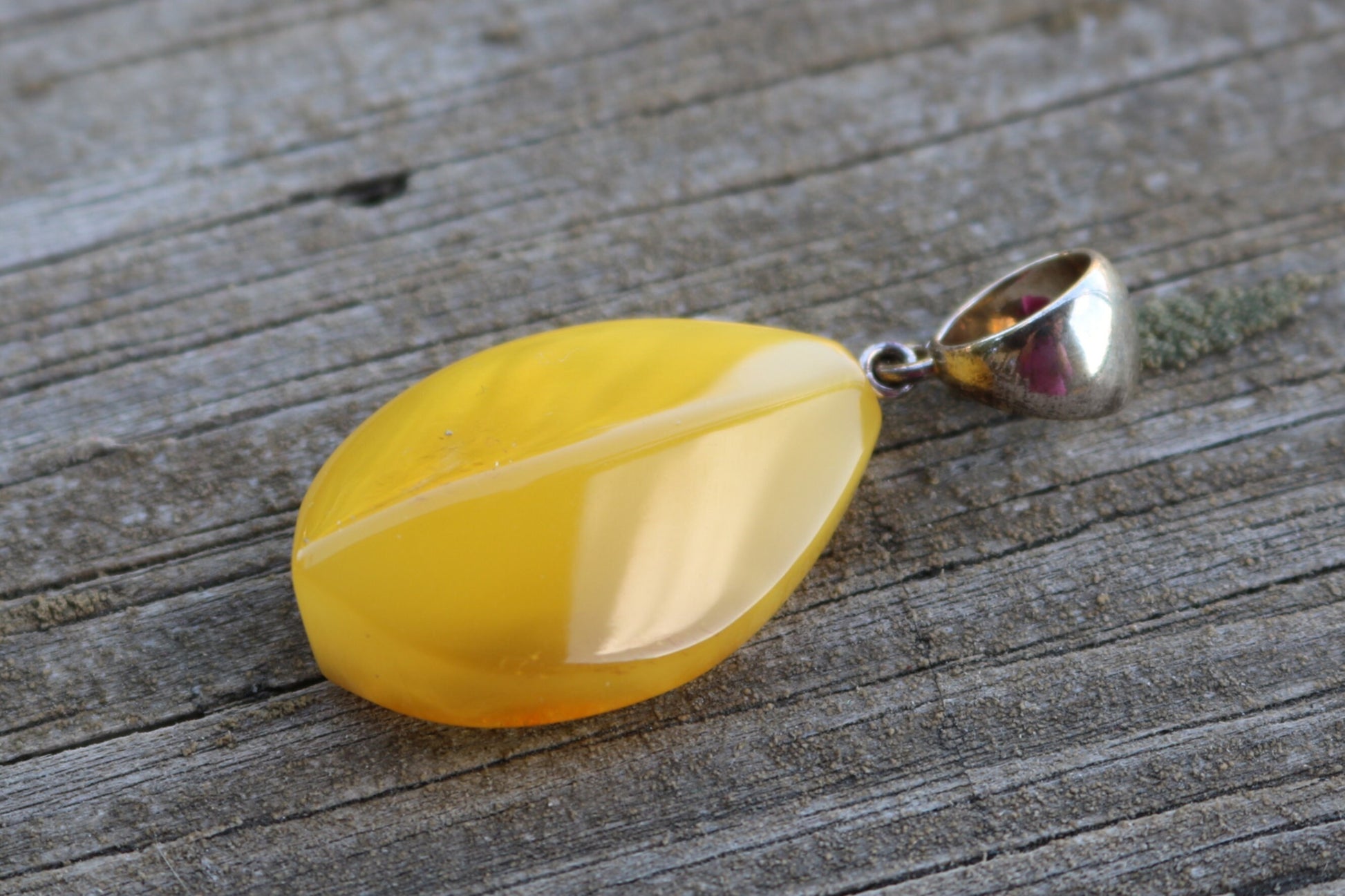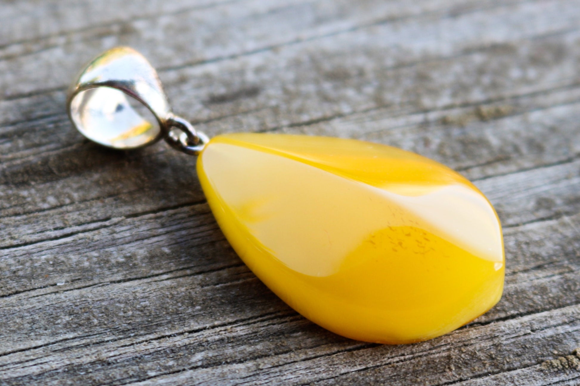 Baltic Amber hand carved and faceted pendant in untreated yellow color, cloudy on one side. Natural solid untreated stone. Set in 925 sterling silver.