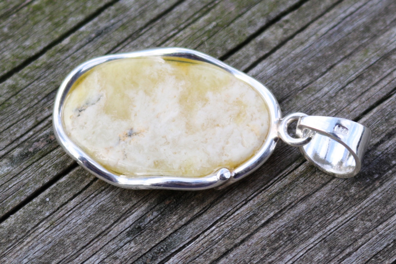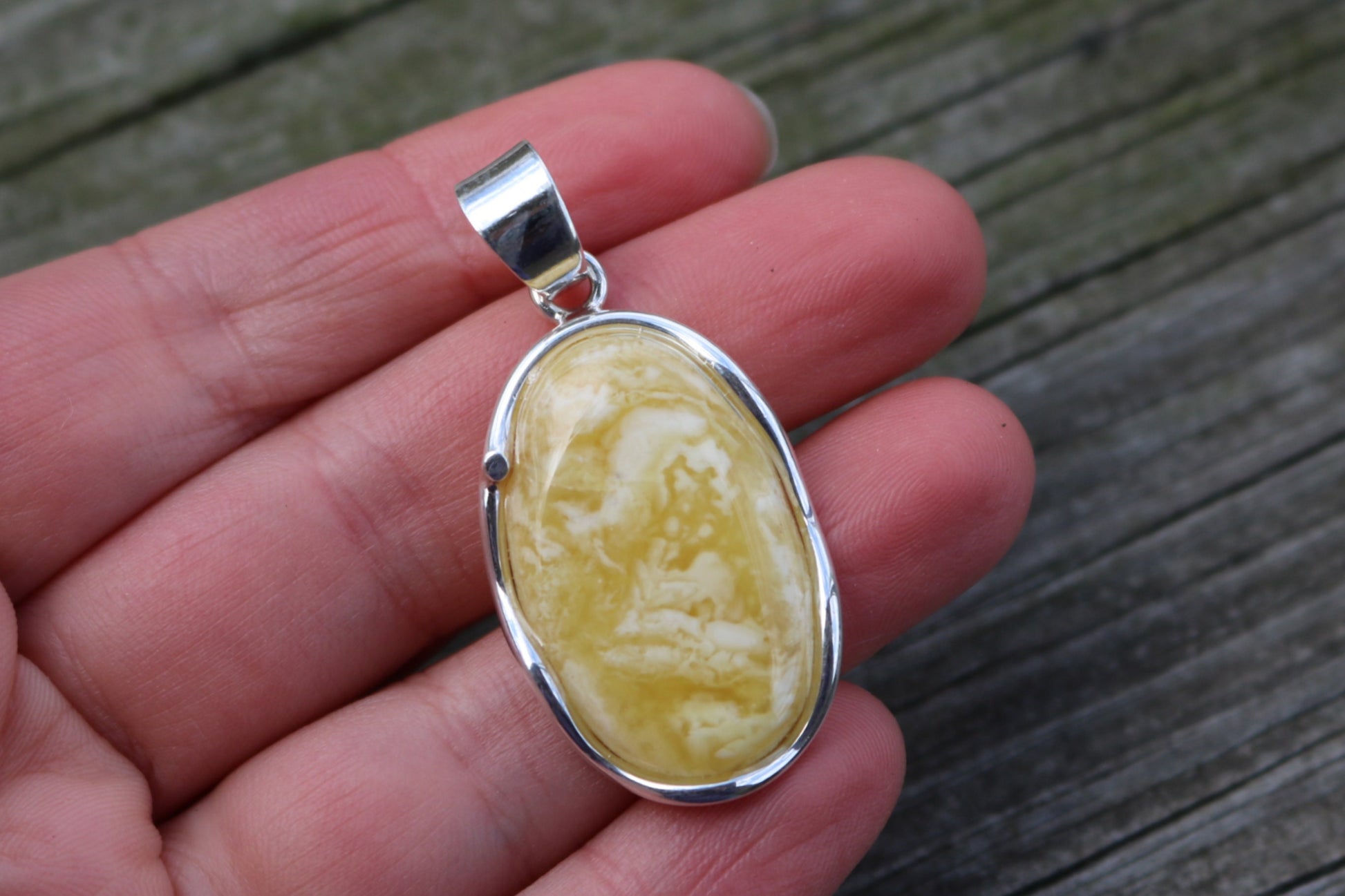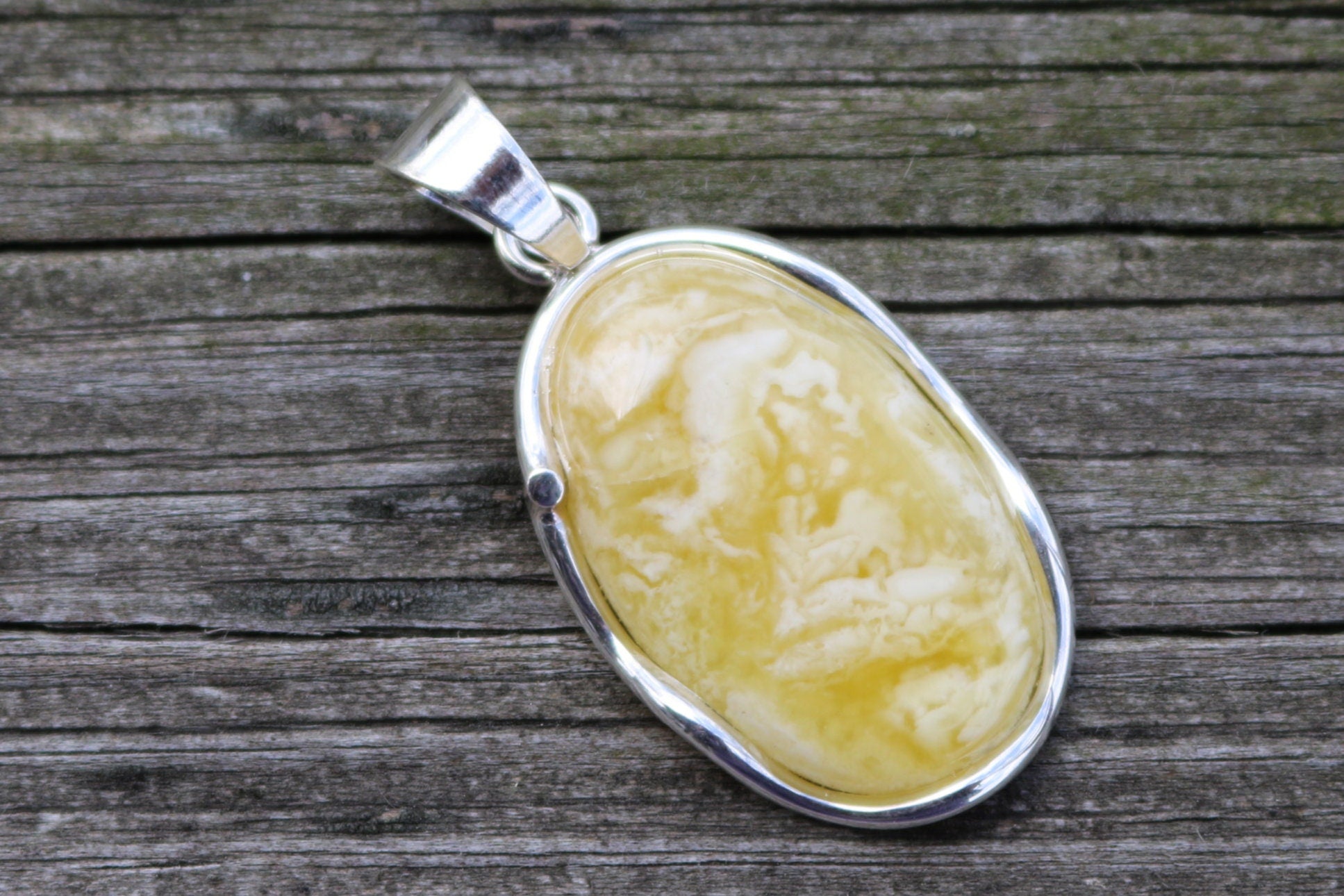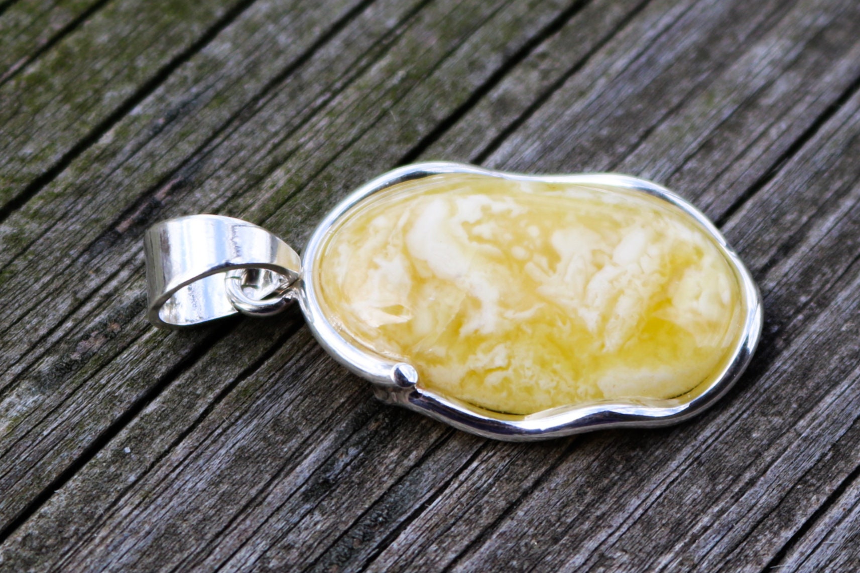 Baltic Amber pendant in natural untreated butterscotch color with milky swirls. Set in 925 sterling silver.