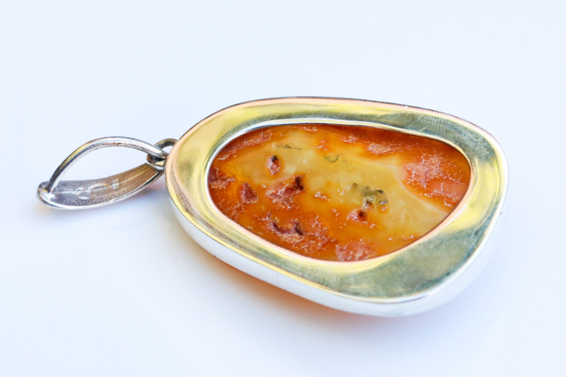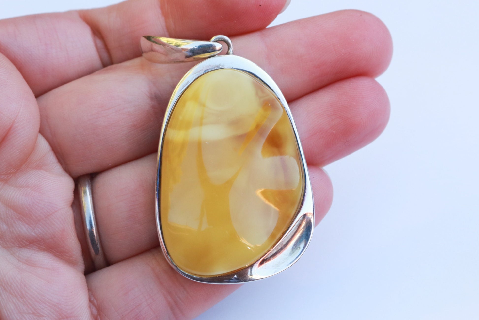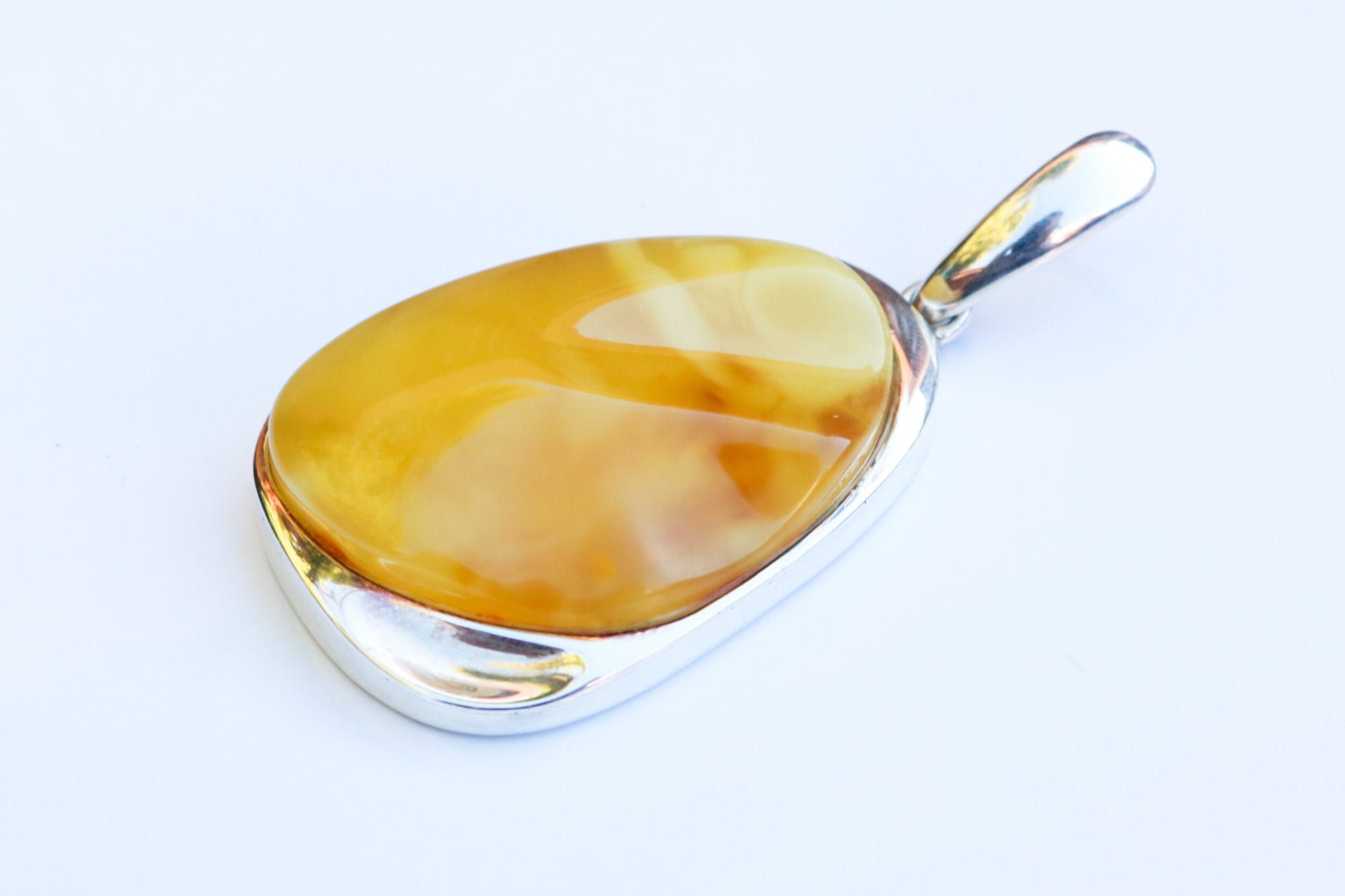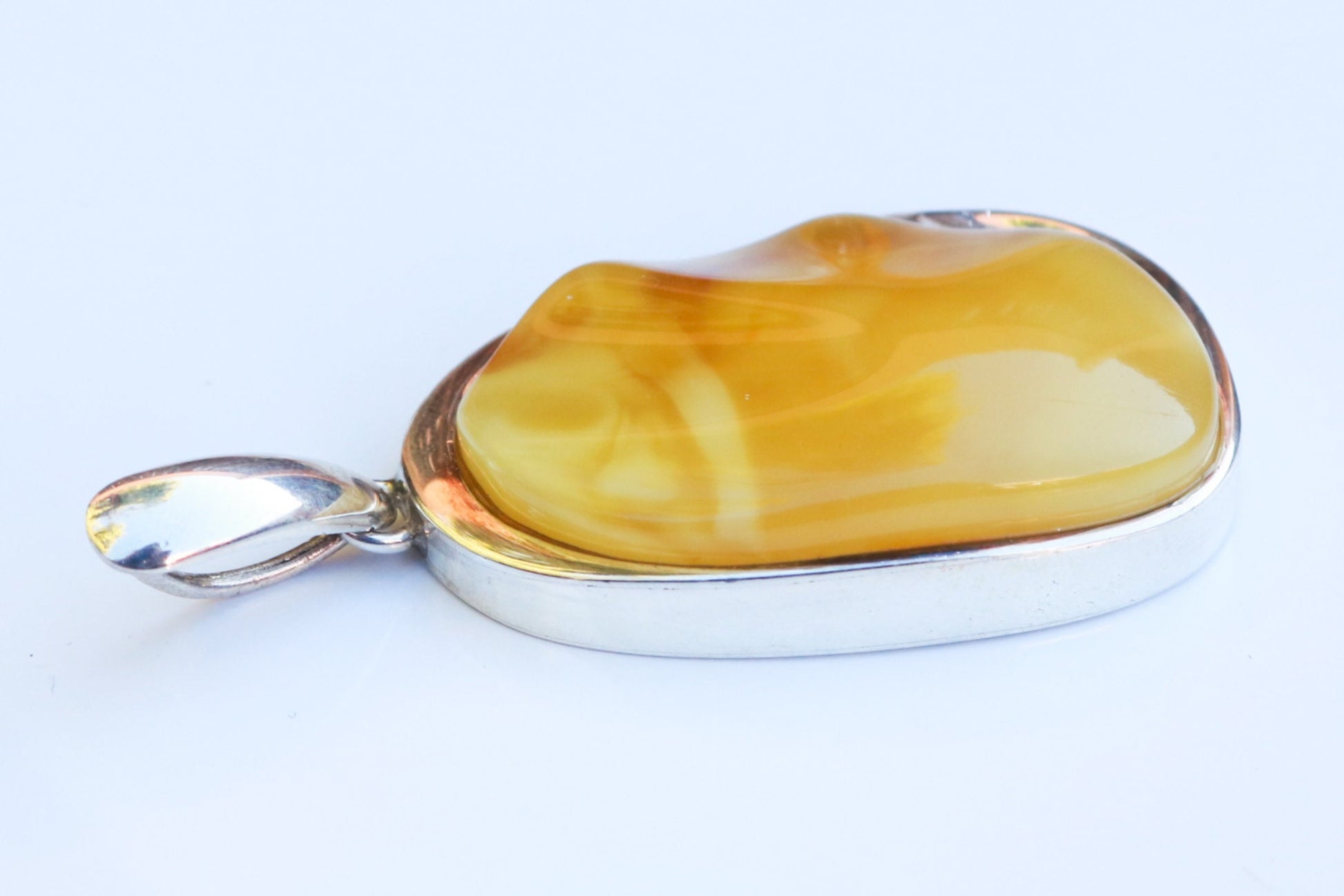 Gorgeous Baltic Amber pendant in natural untreated butterscotch color with milky swirls and cloudiness. Set in 925 sterling silver.