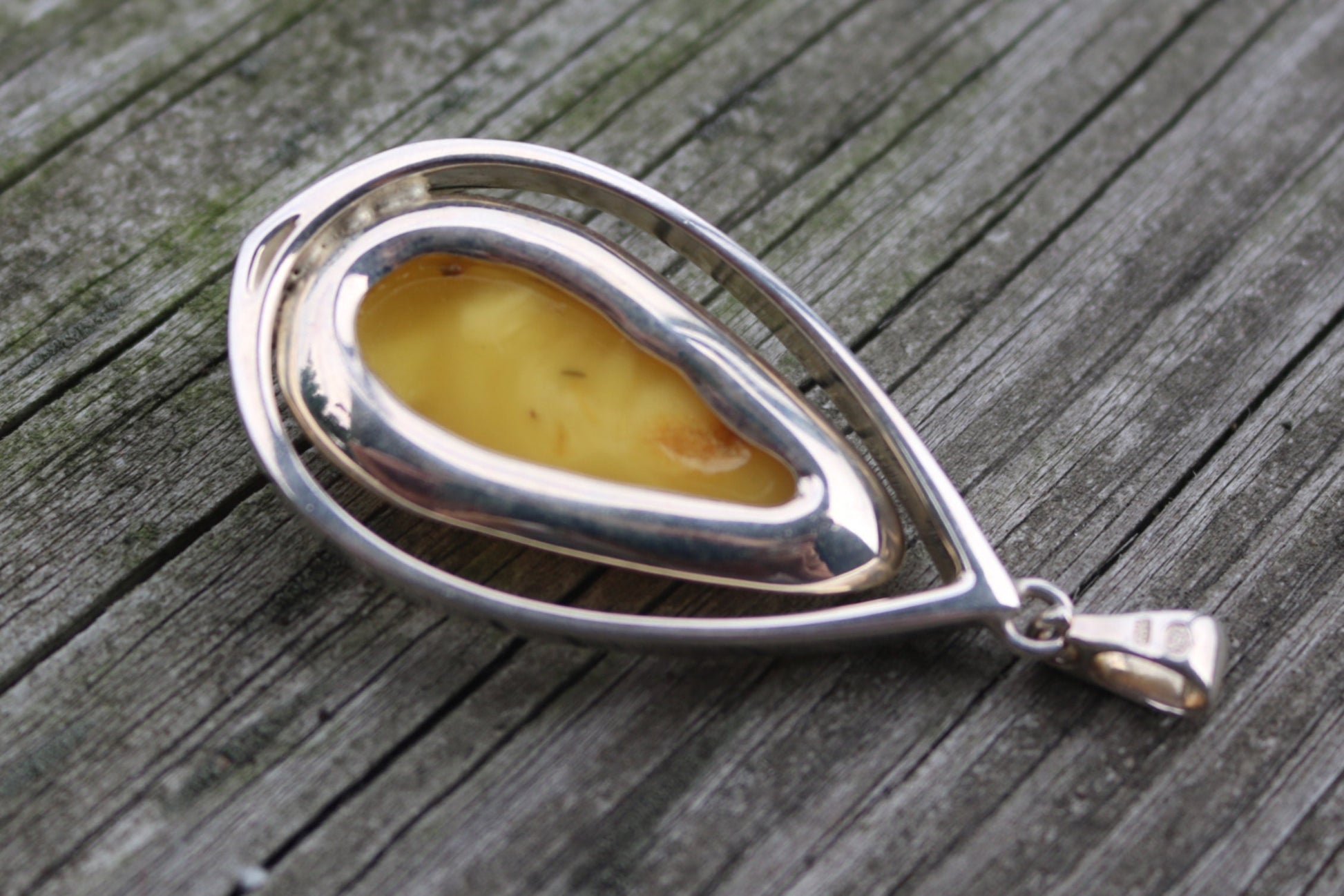 Baltic amber drop pendant in natural untreated butterscotch color. Set in 925 sterling silver.