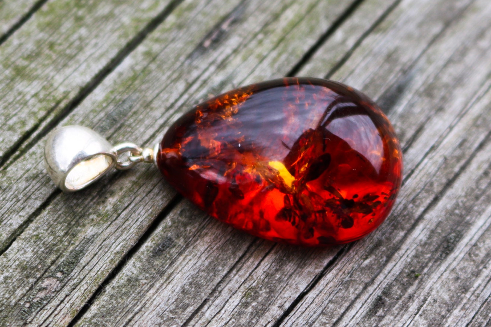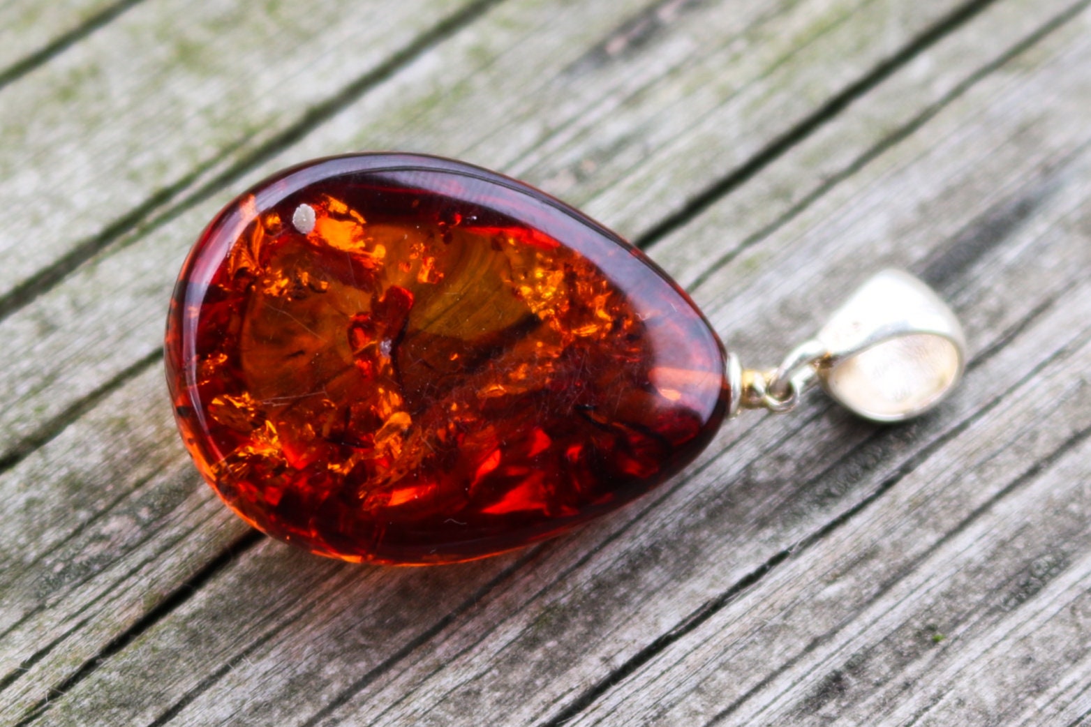 It is probably the most popular, recognizable and one of the most common color, cognac (or whisky) amber comes mainly in treated form (initially transparent yellow), but can be also natural. Slow heating deepens the color, makes it more shimmering and bright than natural. Cognac amber is often autoclaved (treated with high pressure saturated steam at about 120°C/248°F) which results in inner cracking. The steam penetrates the amber’s structure and alter its color. That’s how decorative bubbles (or so-called “scales”) and shiny discs are created. Heating is a very cold technique that has been in use for hundreds of years to enhance amber’s natural color while autoclaving has been developed in the second half of the 20th century. There are several shades of cognac amber, varying from light honey to dark cognac, almost cherry shade.