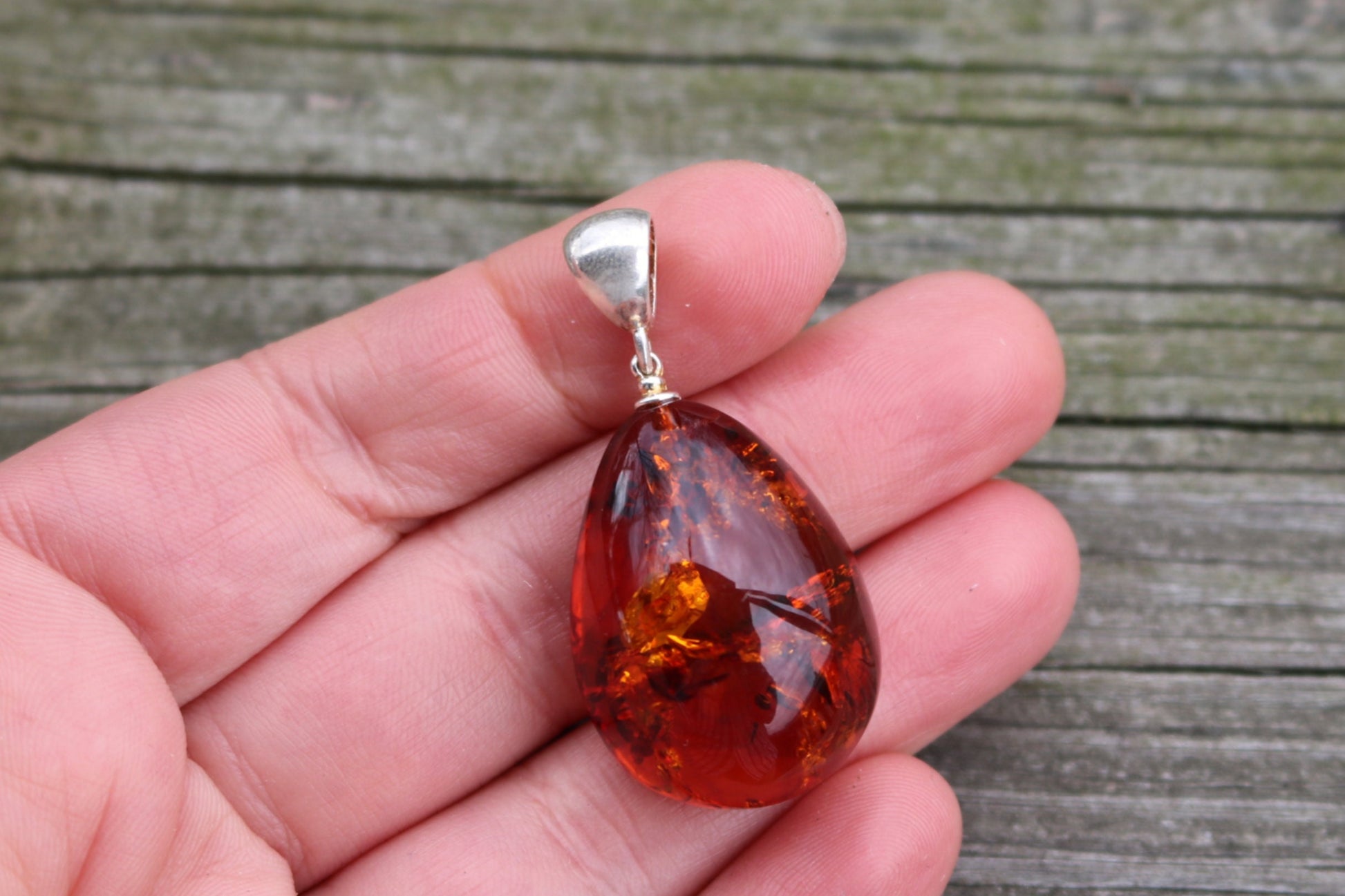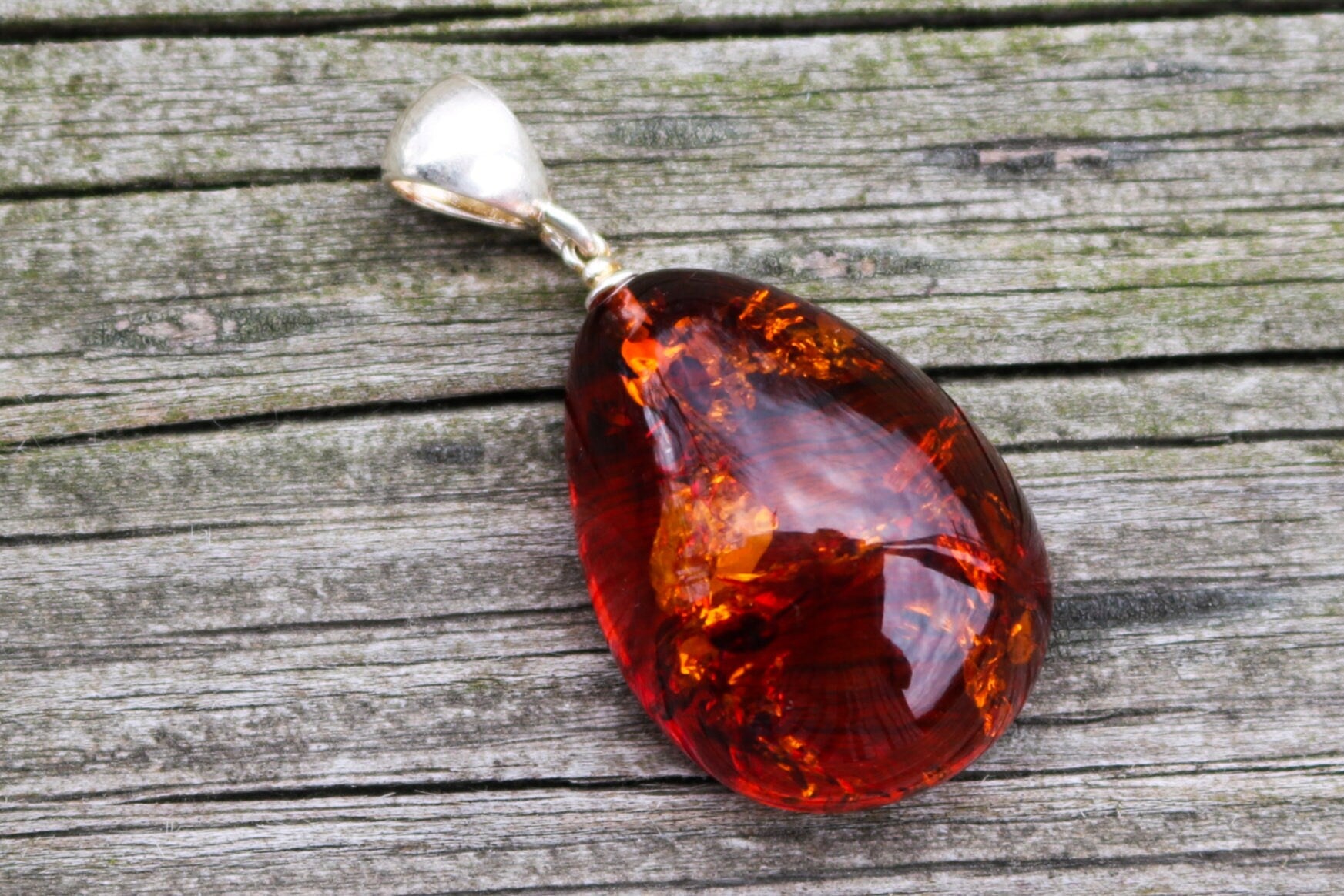 Baltic Amber Pendant Cognac Drop Sparkling Jewelry Unisex 1.72" 6 gram 925 Silver