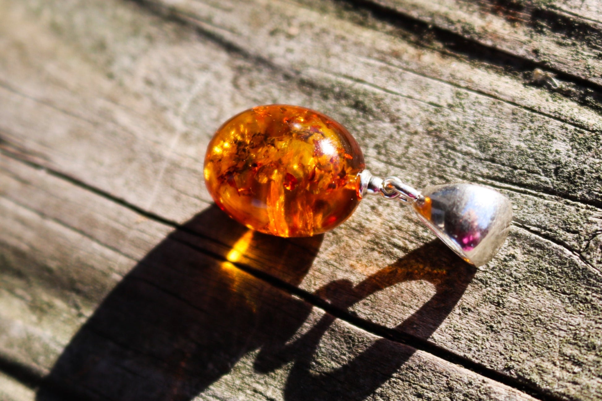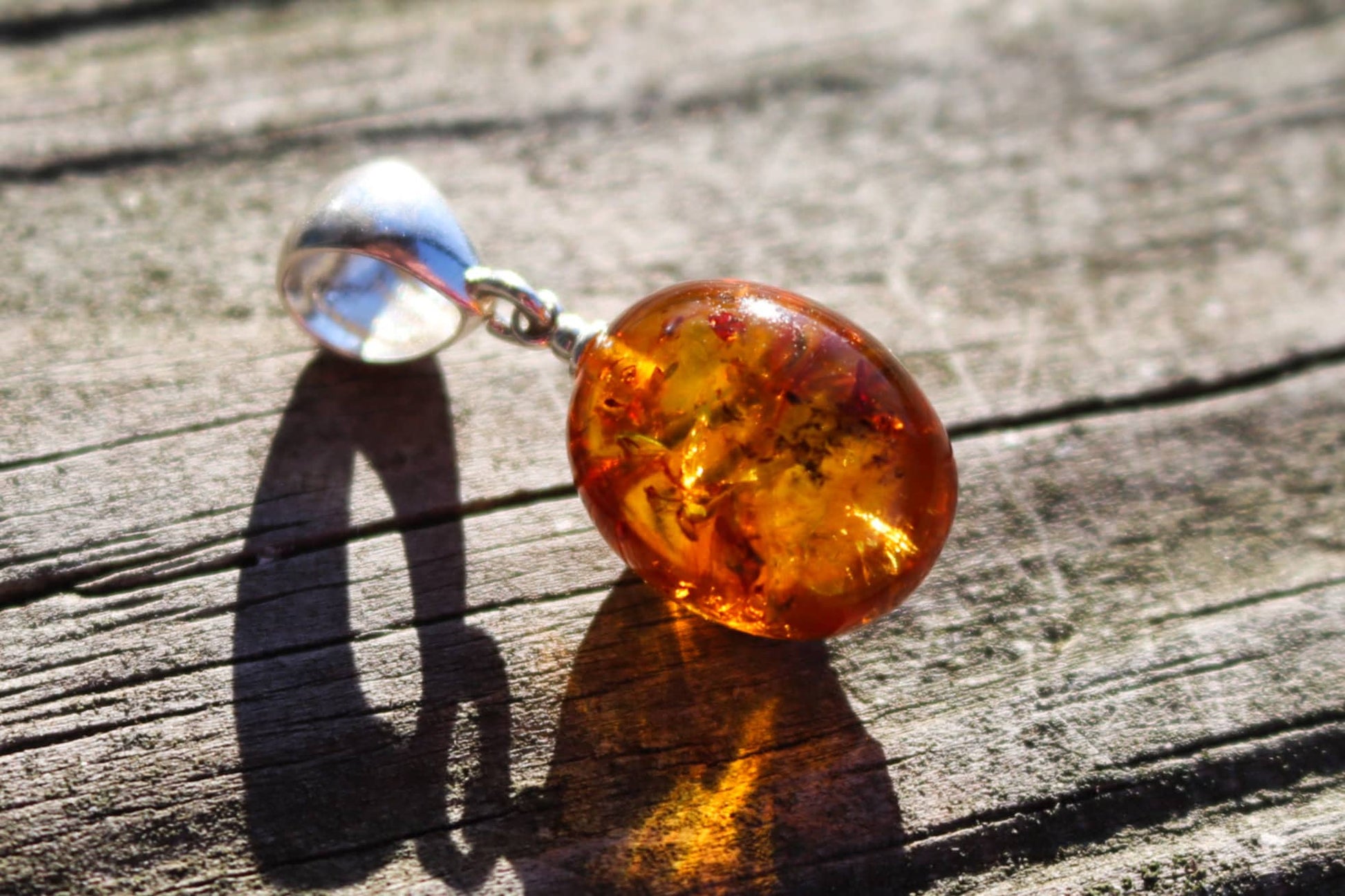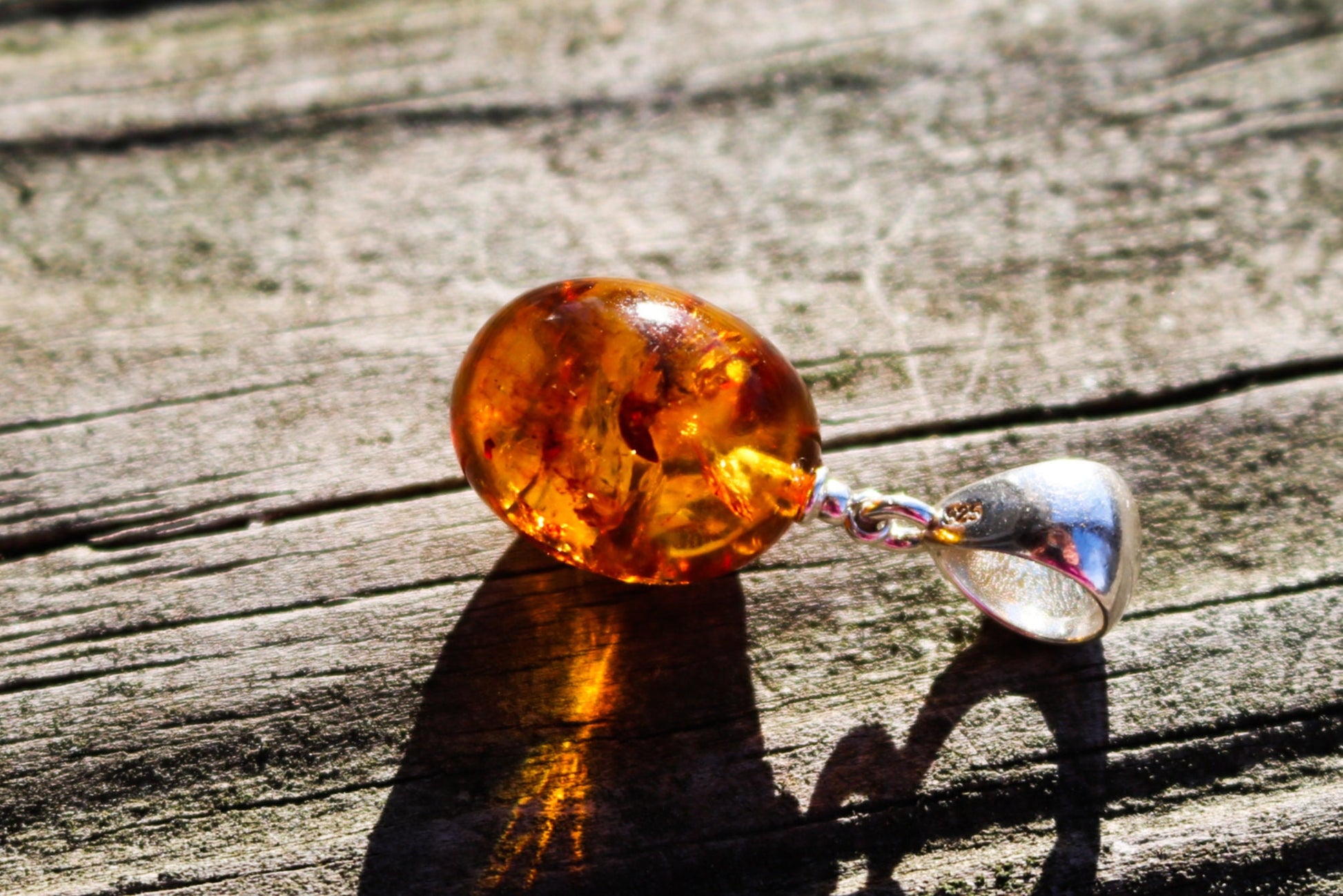 Baltic Amber egg pendant in sparkling cognac color. Set in 925 sterling silver.