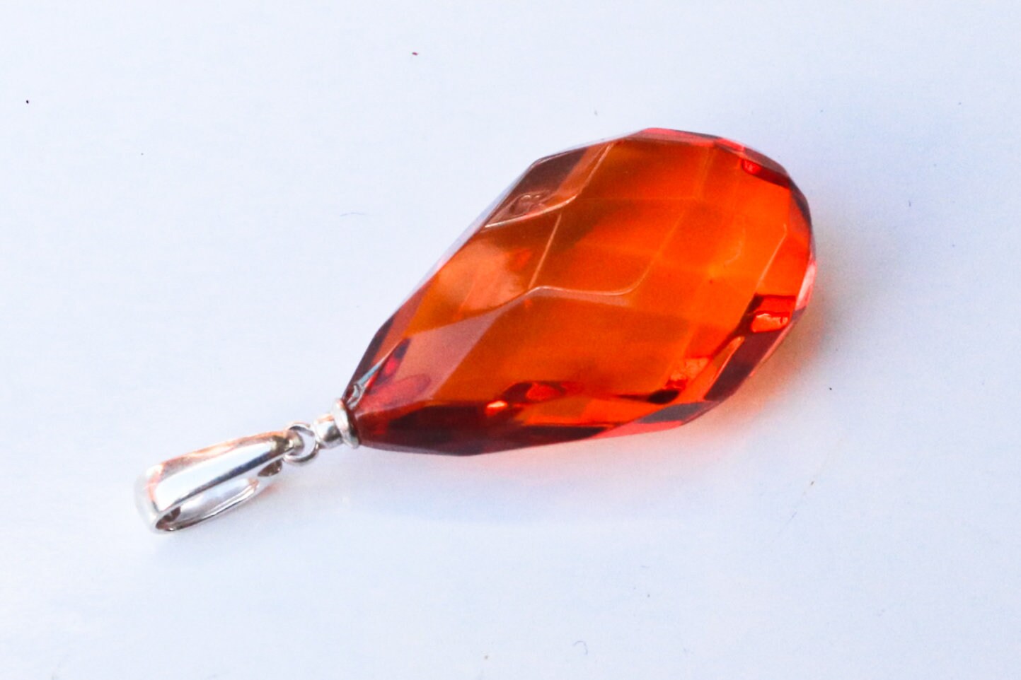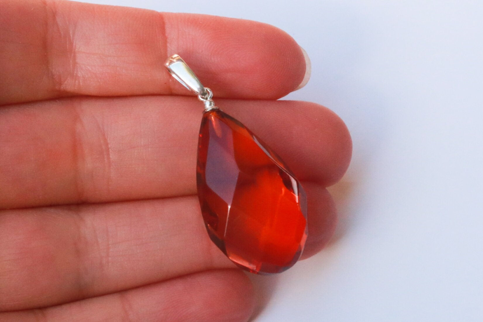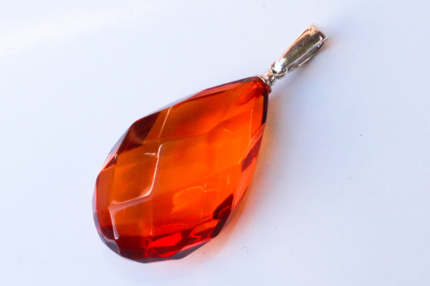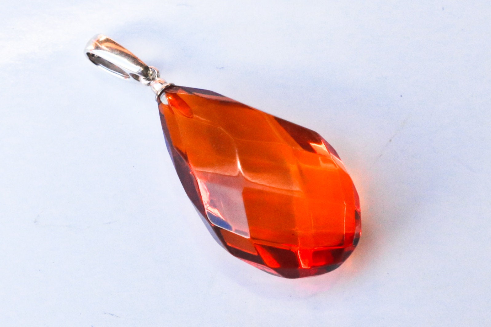 Baltic Amber Pendant Cognac Faceted Drop Jewelry Unisex 1.59" 3 gram 925 Silver