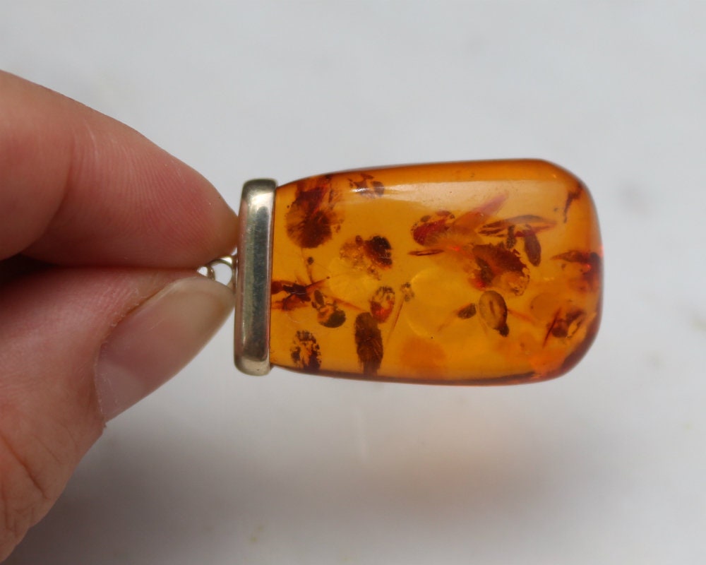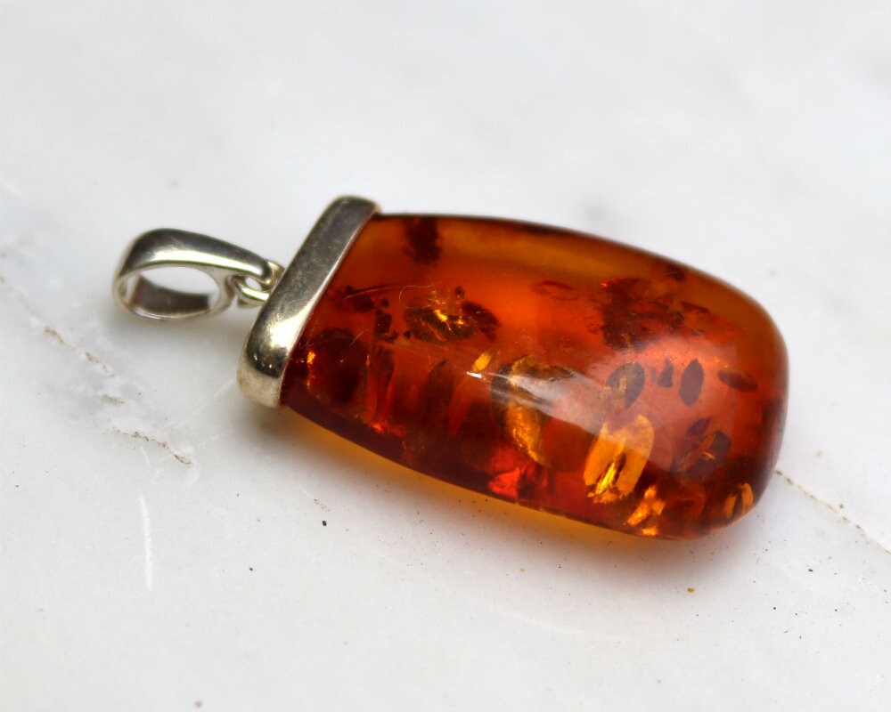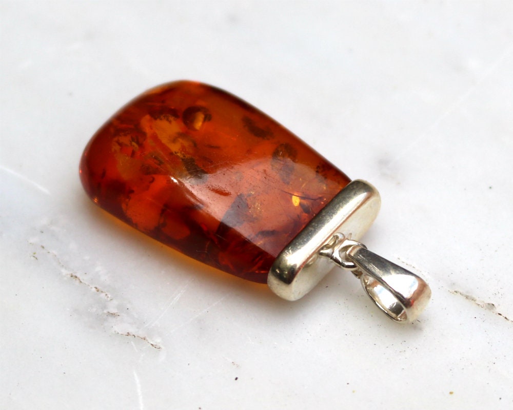 Hand carved Baltic Amber pendant in natural untreated cognac color. Set in 925 sterling silver.