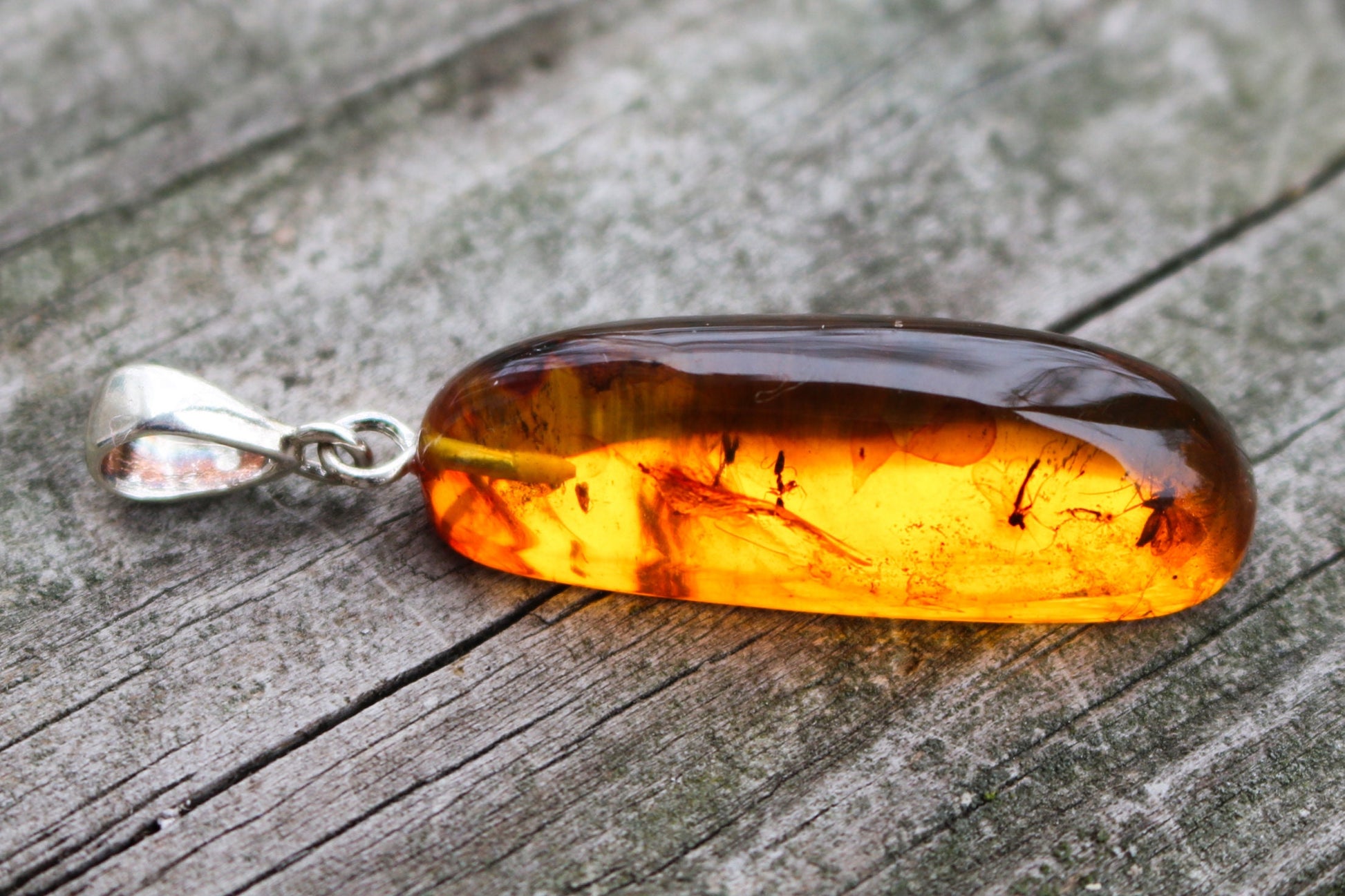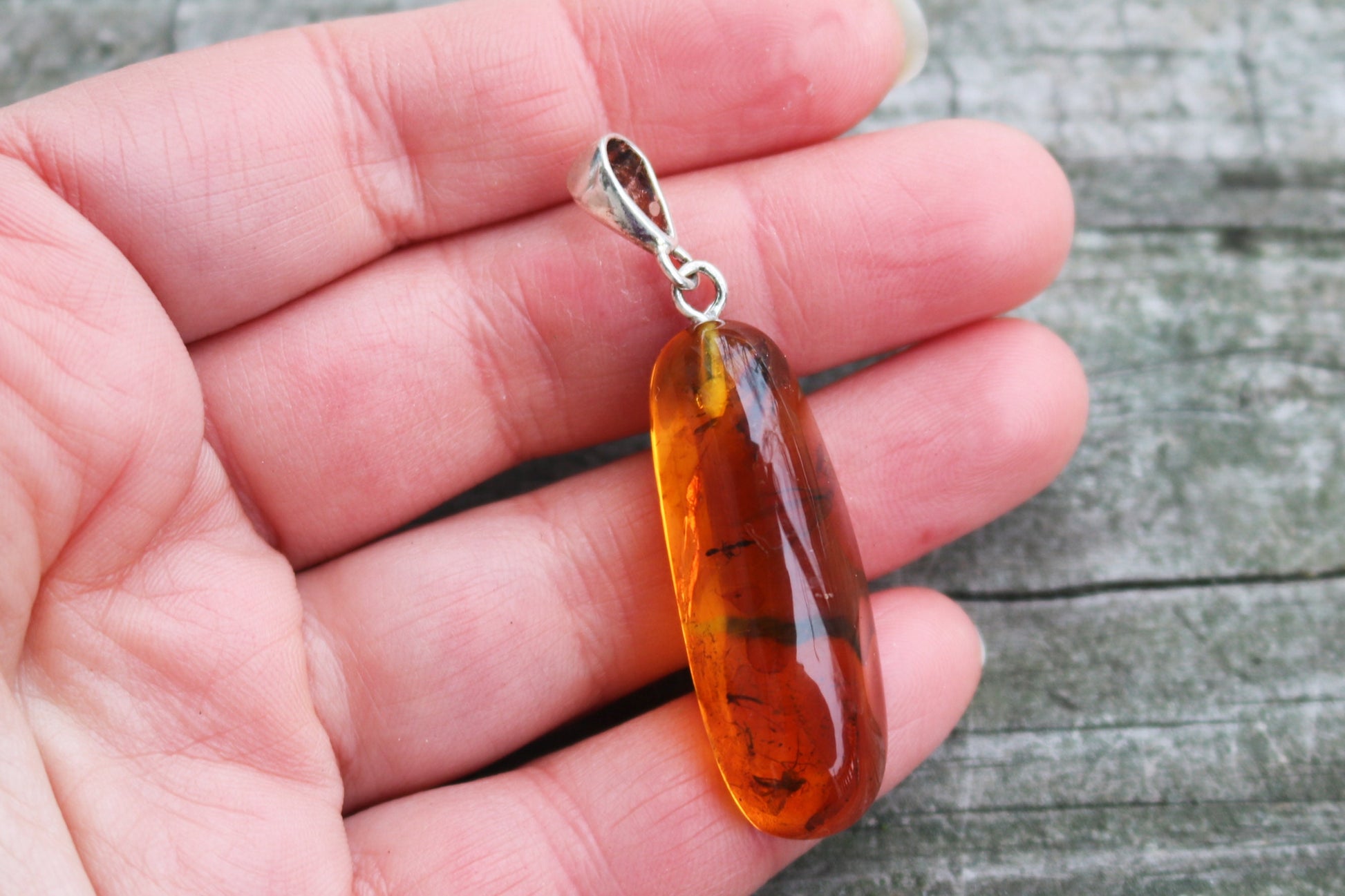 The pendant is made out of natural untreated fully transparent honey amber.