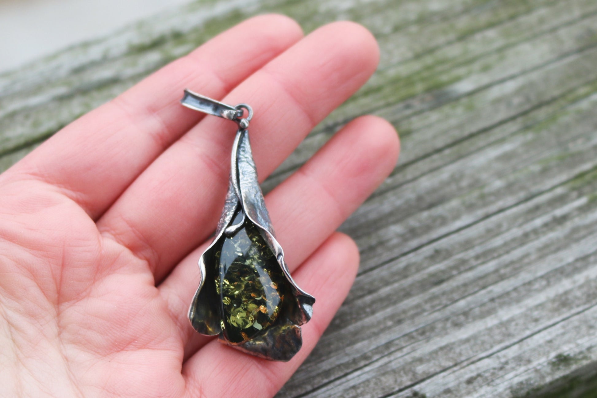 Baltic Amber Pendant Green Oxidized Embossed Jewelry 2.7" 8.5 gram 925 Silver