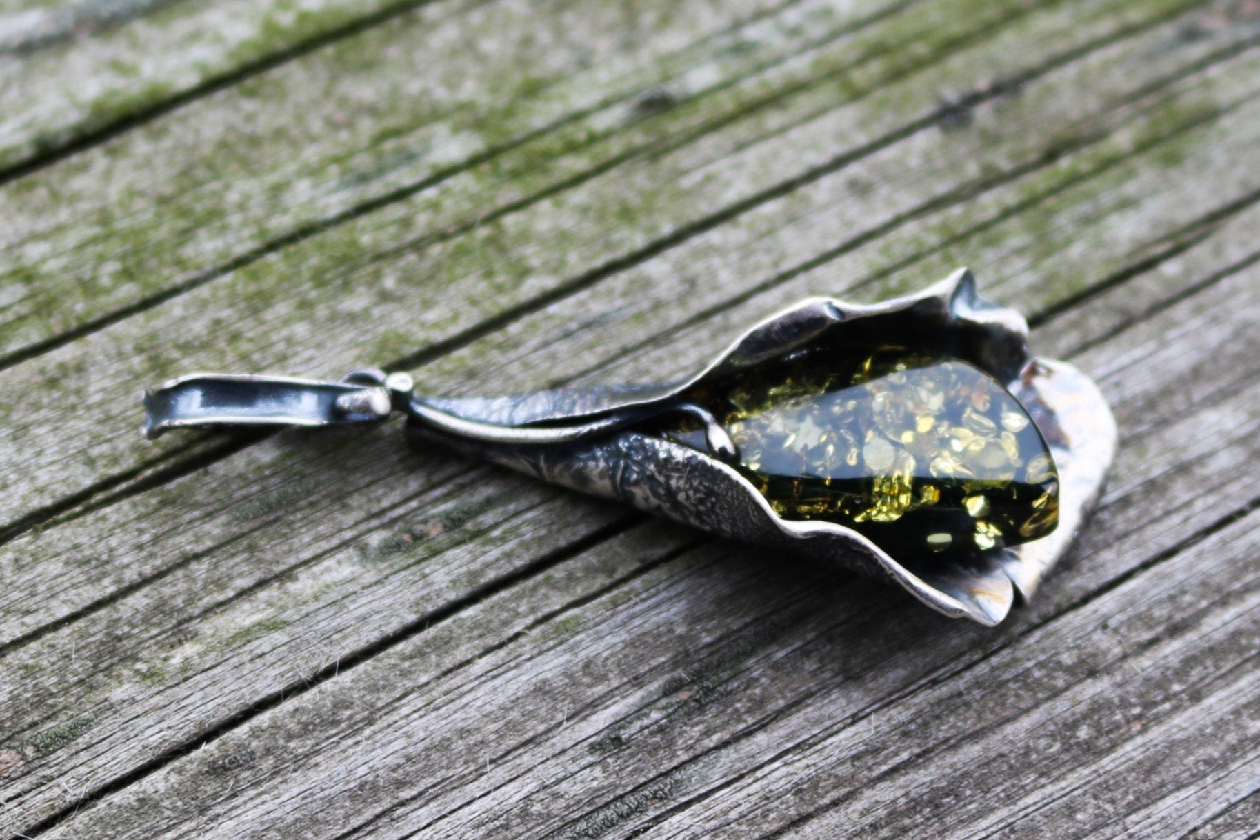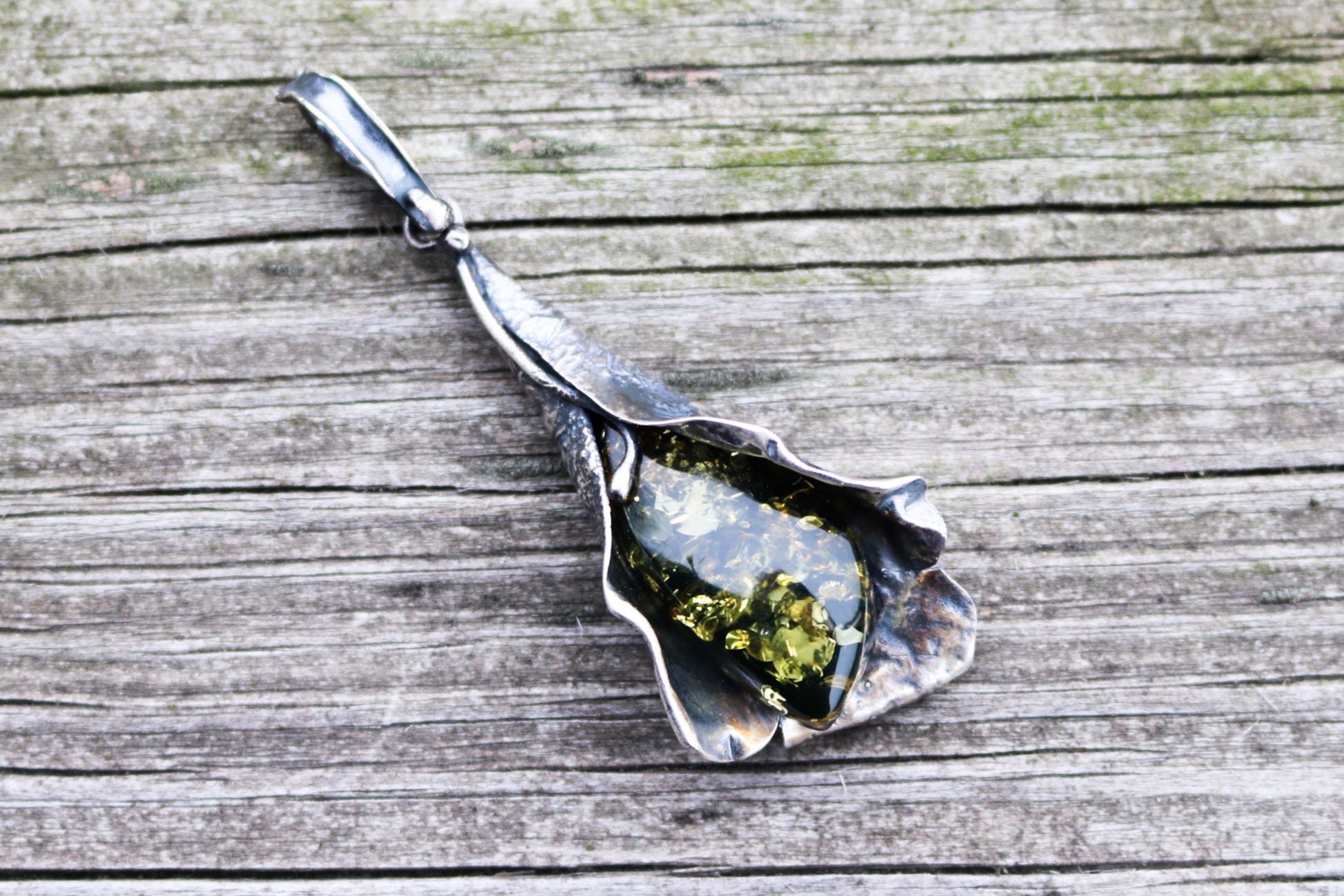 Unique Baltic amber pendant in sparkling green color. Set in oxidised and embossed 925 sterling silver.