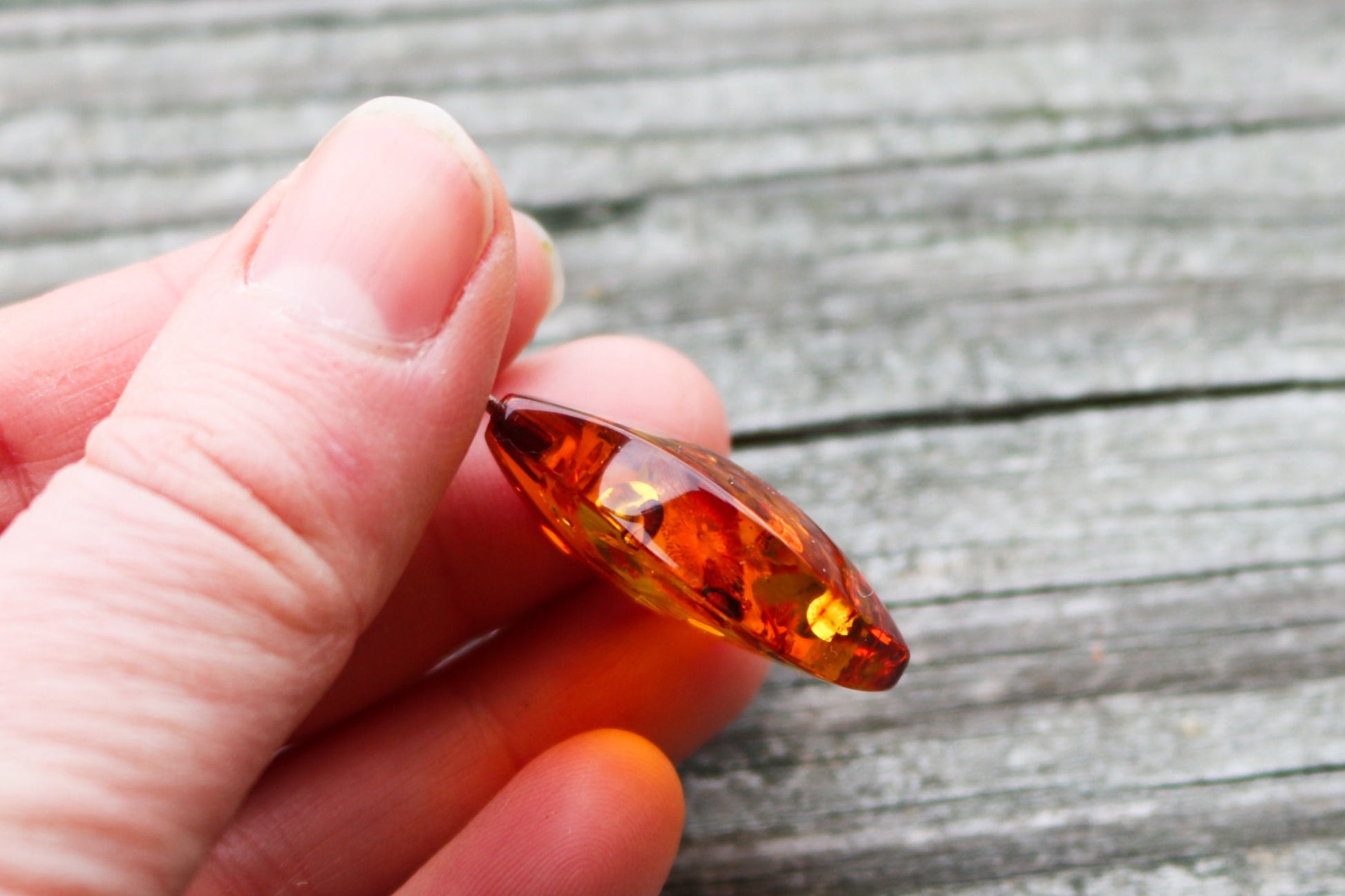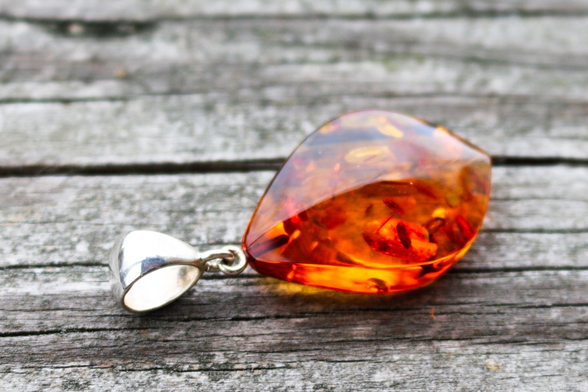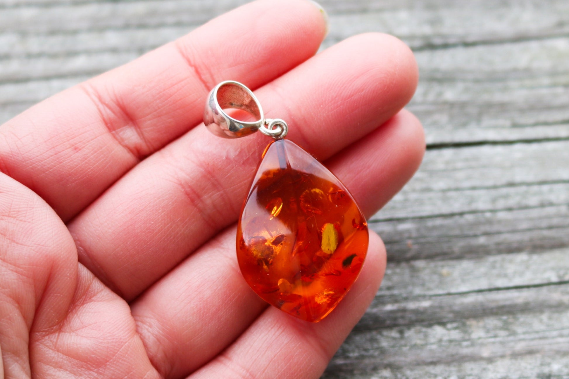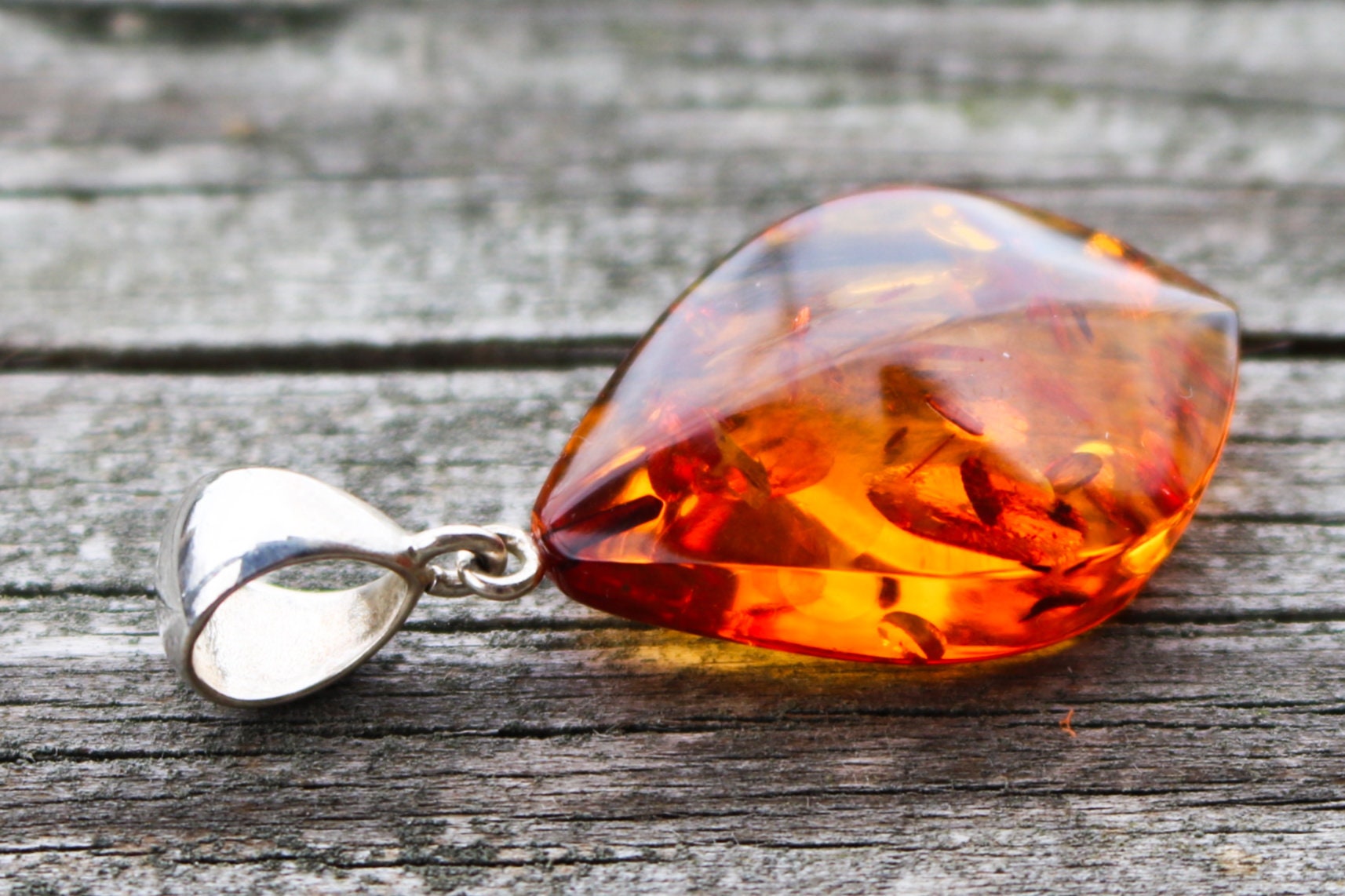 It is probably the most popular, recognizable and one of the most common color, cognac (or whisky) amber comes mainly in treated form (initially transparent yellow), but can be also natural. Slow heating deepens the color, makes it more shimmering and bright than natural. Cognac amber is often autoclaved (treated with high pressure saturated steam at about 120°C/248°F) which results in inner cracking. The steam penetrates the amber’s structure and alter its color. That’s how decorative bubbles (or so-called “scales”) and shiny discs are created. Heating is a very cold technique that has been in use for hundreds of years to enhance amber’s natural color while autoclaving has been developed in the second half of the 20th century. There are several shades of cognac amber, varying from light honey to dark cognac, almost cherry shade.