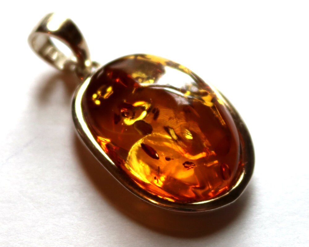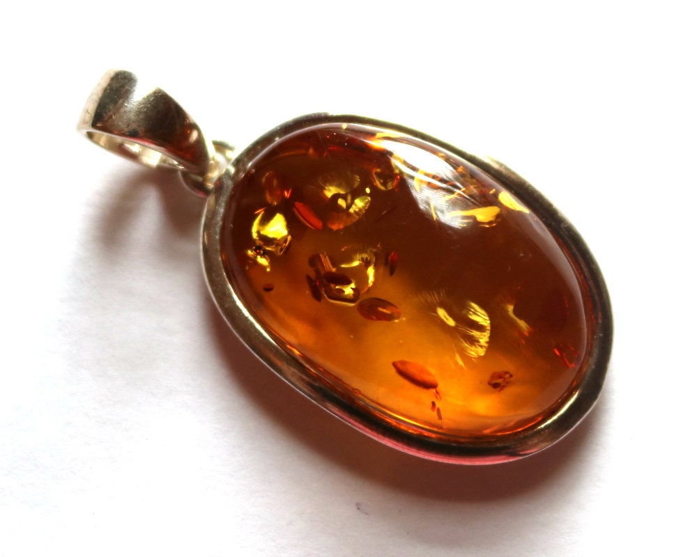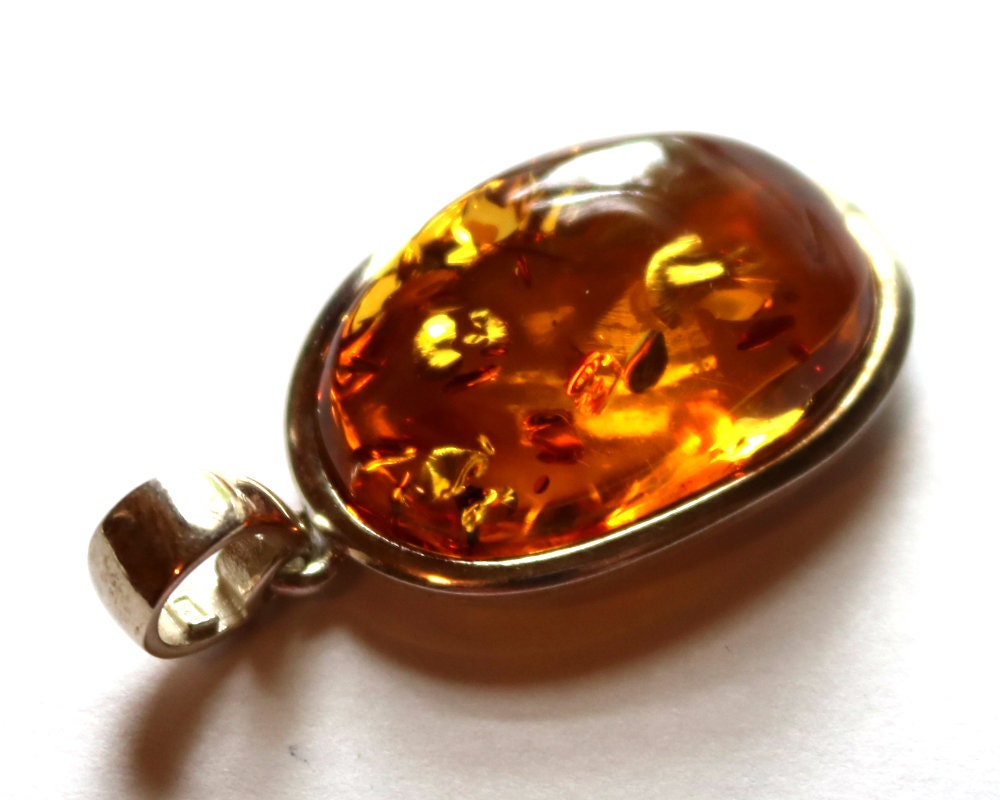 Baltic Amber hand carved oval unisex style pendant in sparkling honey color. Set in 925 sterling silver.