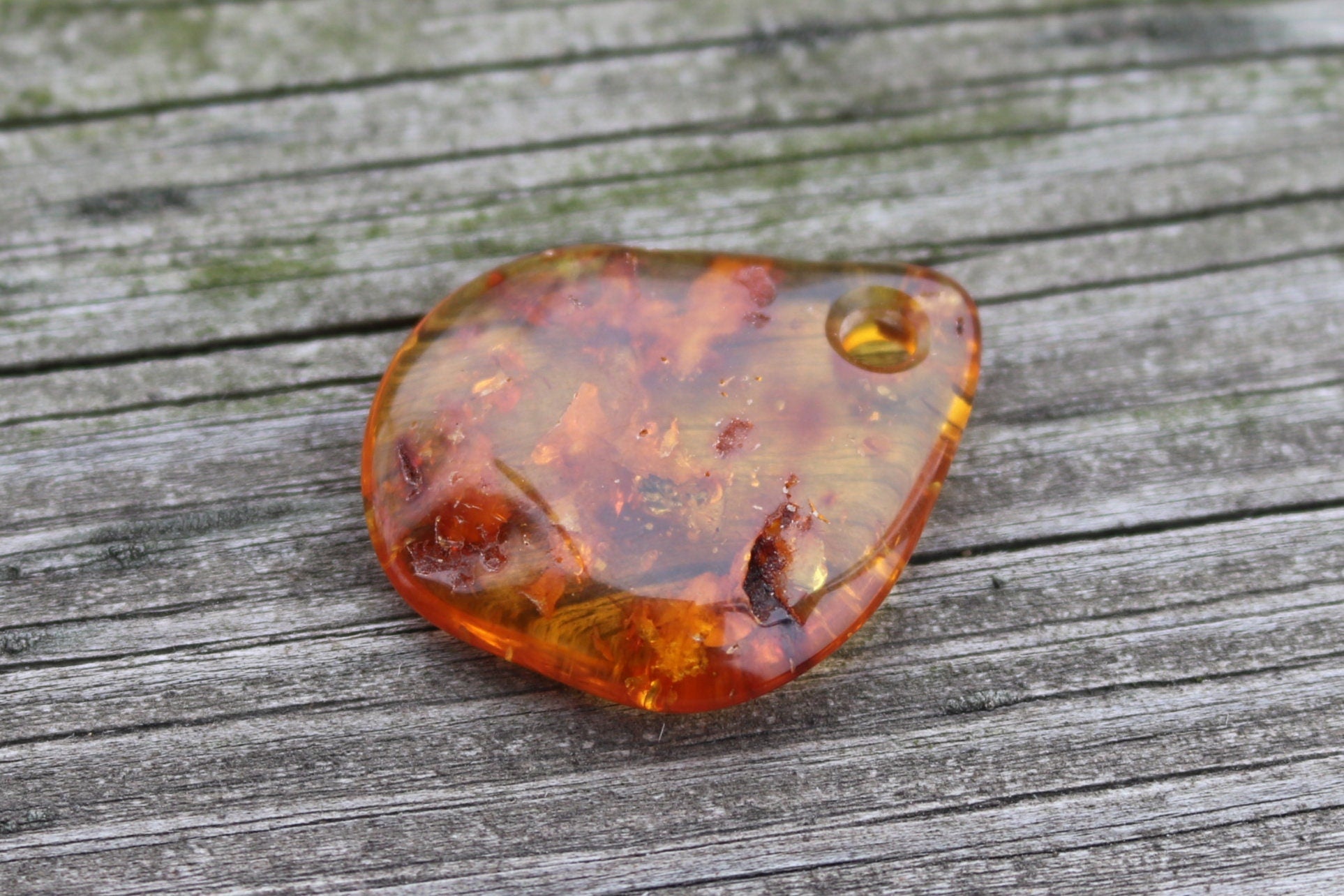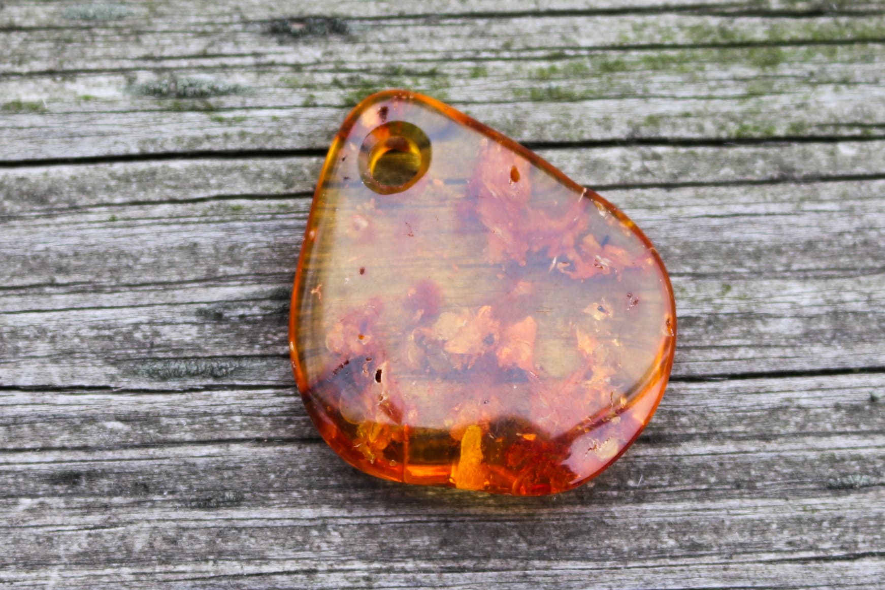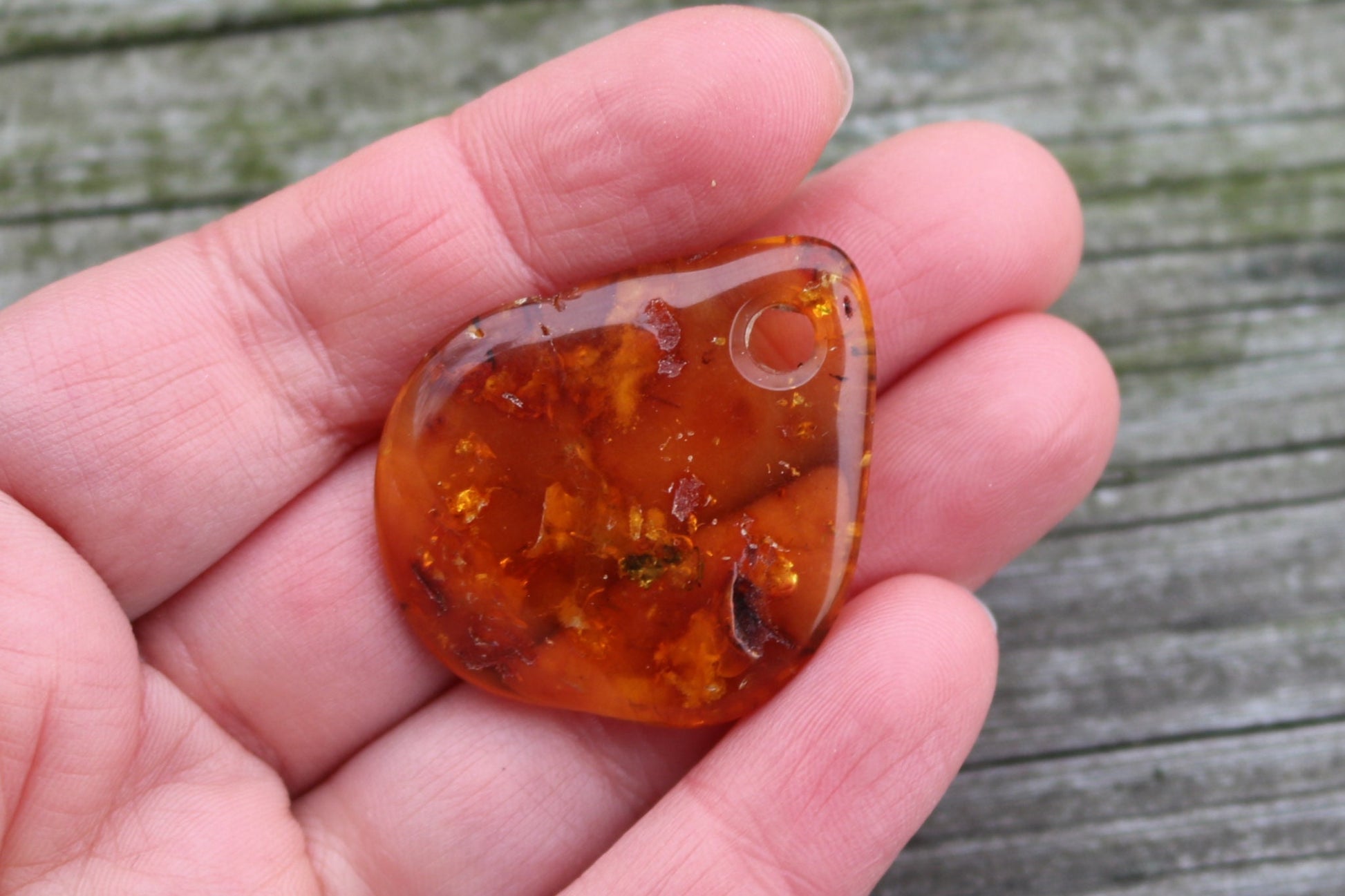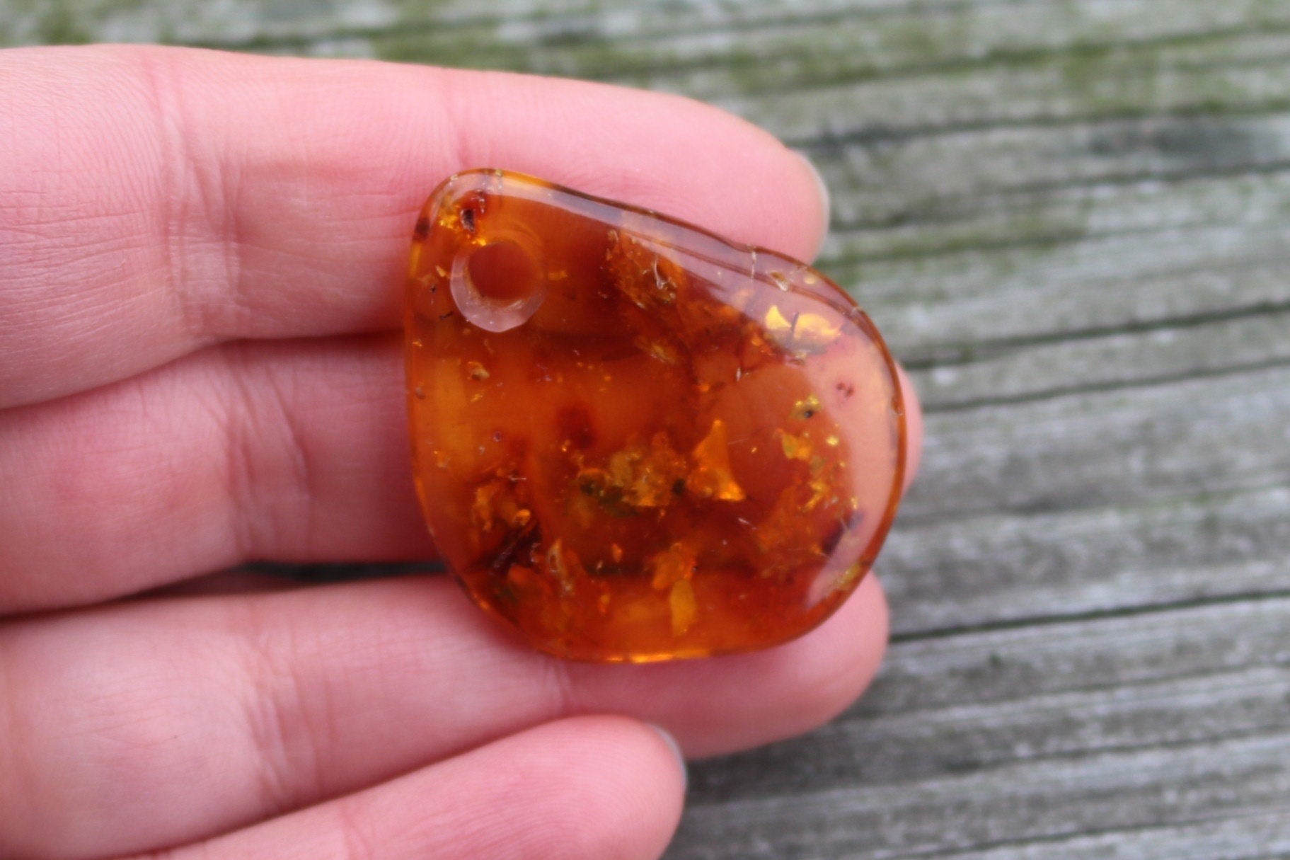 Baltic amber pendant in natural honey color with imperfections and includions. Polished and shiny piece of stone.