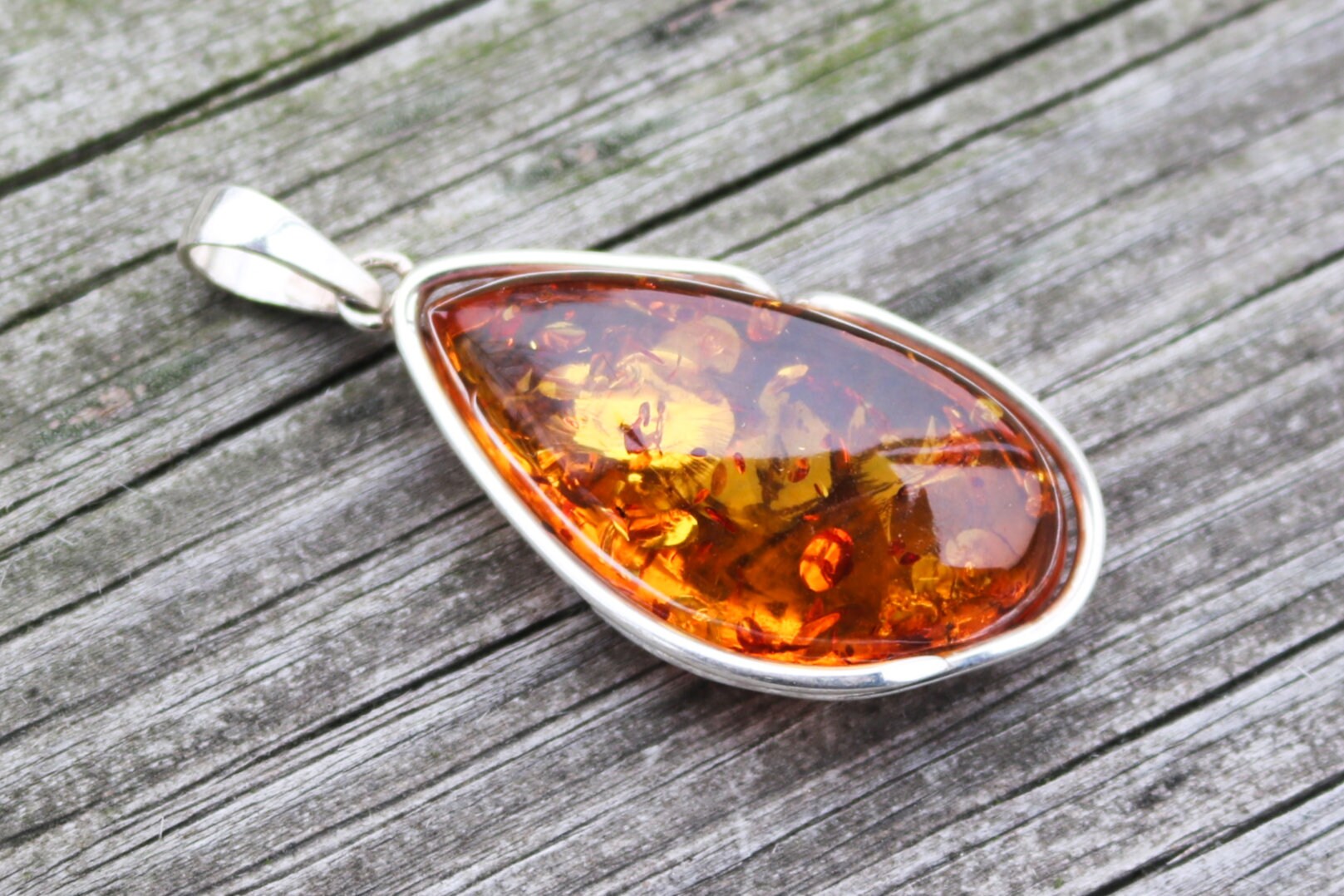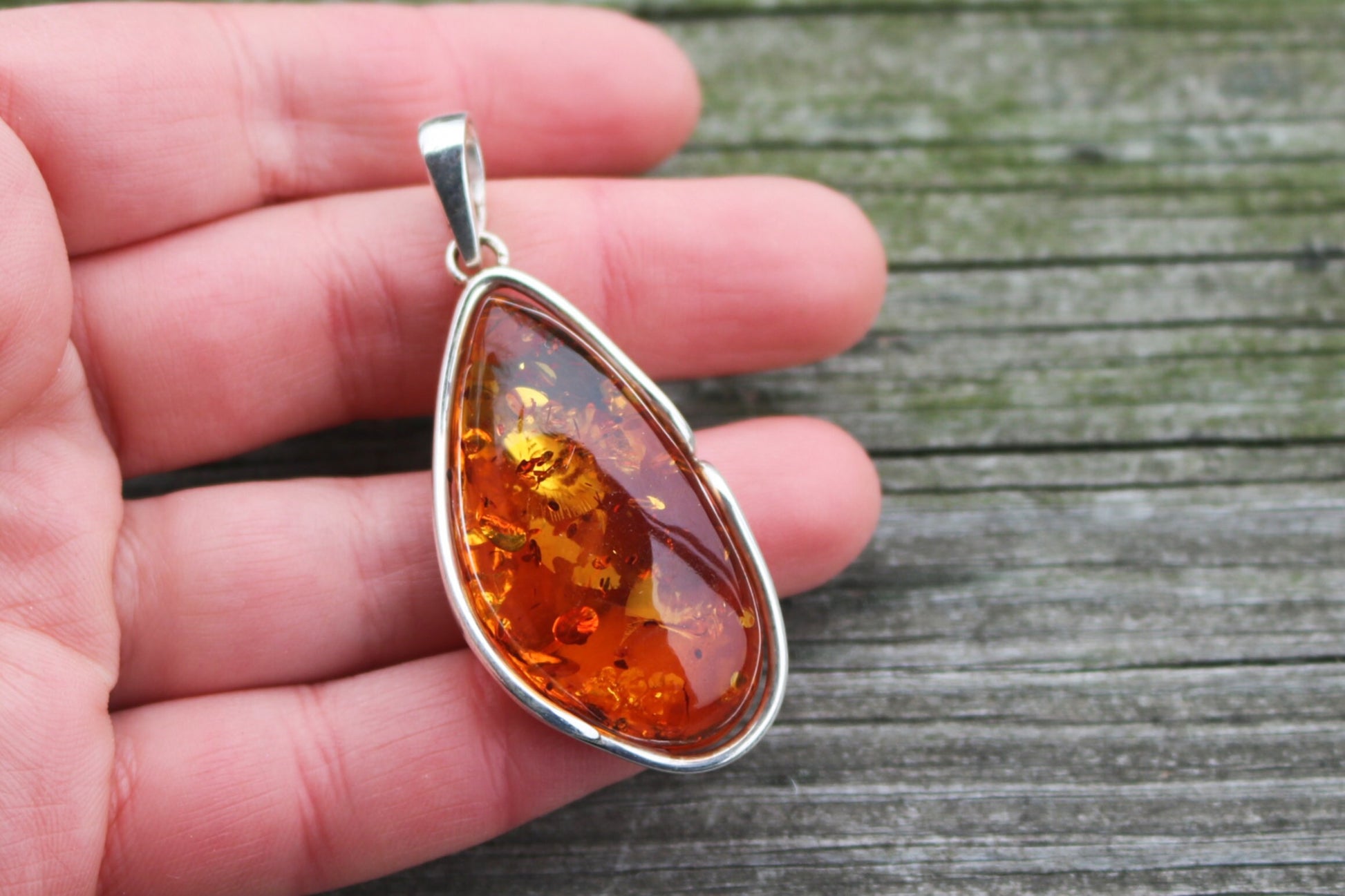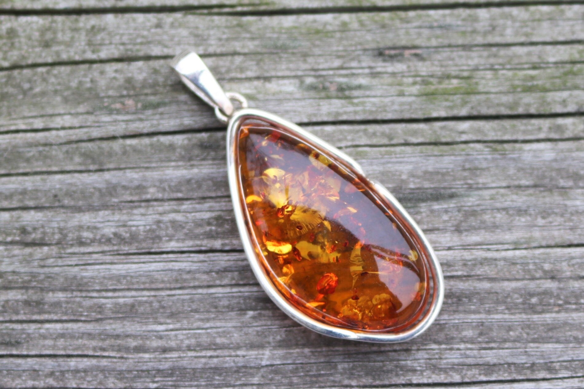 Baltic Amber Pendant Honey Sparkling Unisex 2.26" 13.1 gram 925 Silver