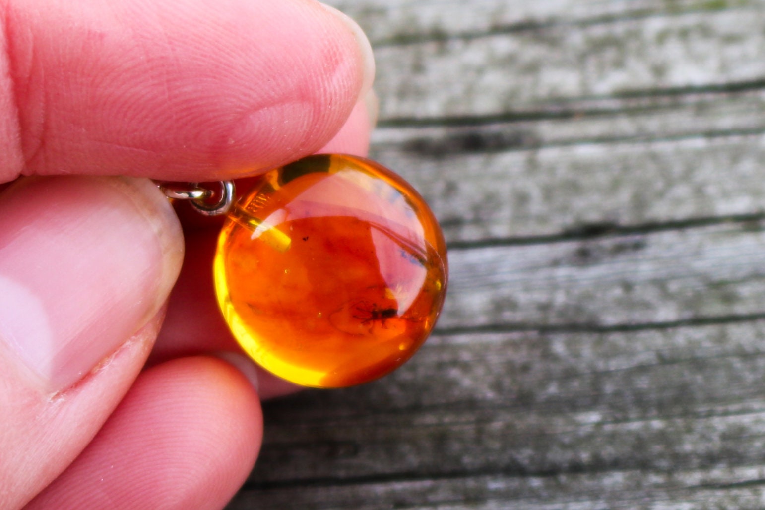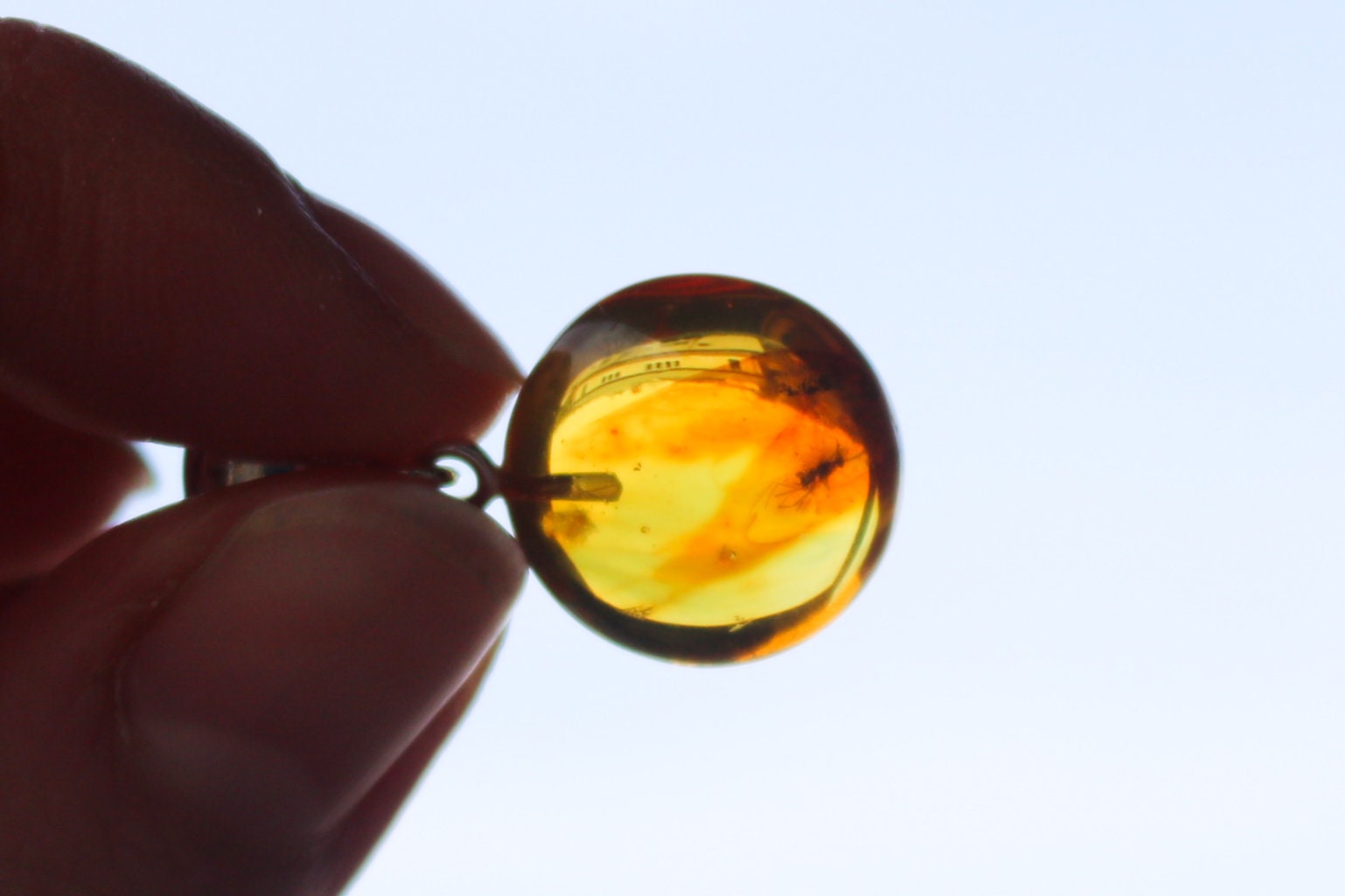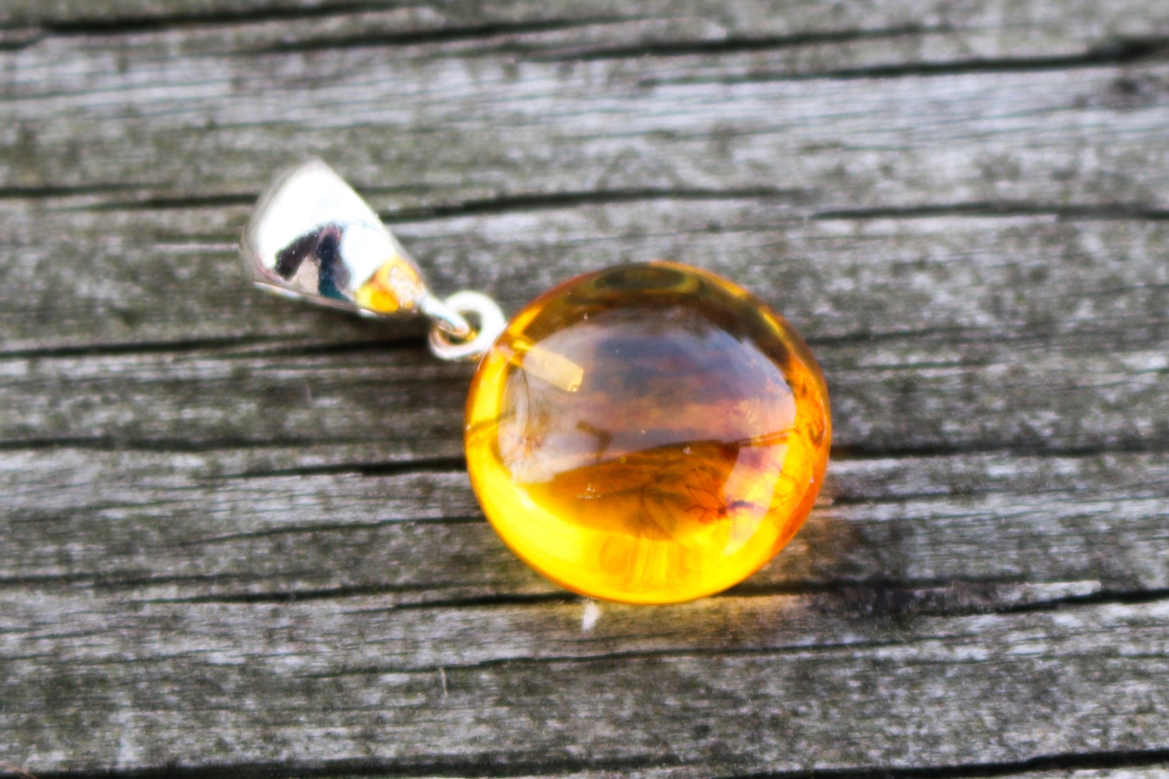 Baltic Amber Pendant Round with Fossil Insect Natural Honey 1.2" 2.5 gram 925 Silver