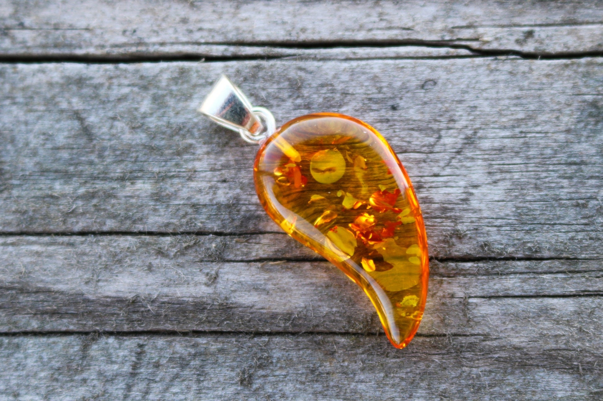 It is probably the most popular, recognizable and one of the most common color, cognac (or whisky) amber comes mainly in treated form (initially transparent yellow), but can be also natural. Slow heating deepens the color, makes it more shimmering and bright than natural. Cognac amber is often autoclaved (treated with high pressure saturated steam at about 120°C/248°F) which results in inner cracking. The steam penetrates the amber’s structure and alter its color. That’s how decorative bubbles (or so-called “scales”) and shiny discs are created. Heating is a very cold technique that has been in use for hundreds of years to enhance amber’s natural color while autoclaving has been developed in the second half of the 20th century. There are several shades of cognac amber, varying from light honey to dark cognac, almost cherry shade.