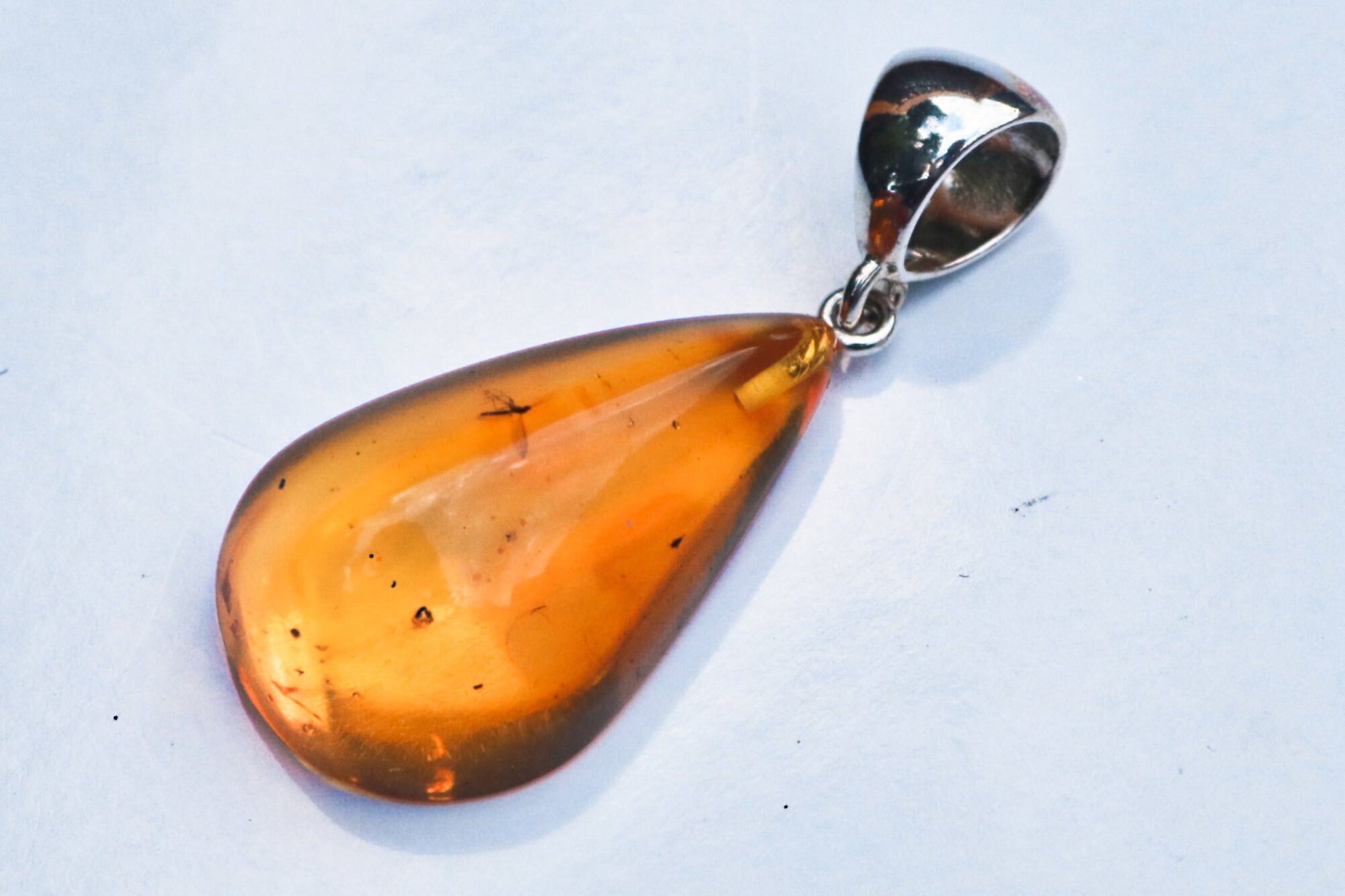 Baltic amber pendant in natural untreated light honey color with an intact fossil insect. Set in 925 sterling silver.