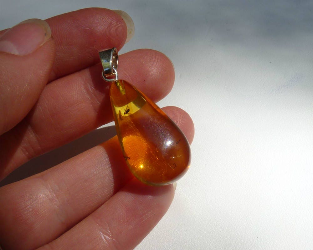 Baltic amber hand carved drop pendant with two fossil insect. The pendant is made out of natural translucent honey color untreated amber. Set in 925 sterling silver.