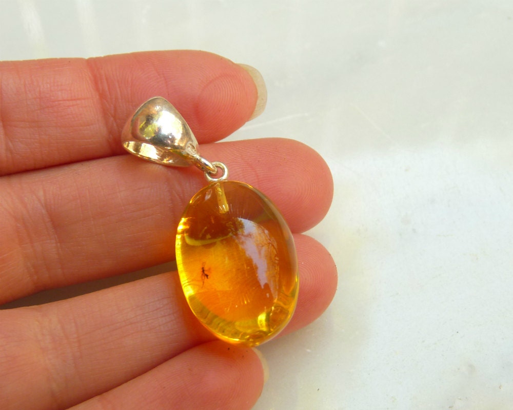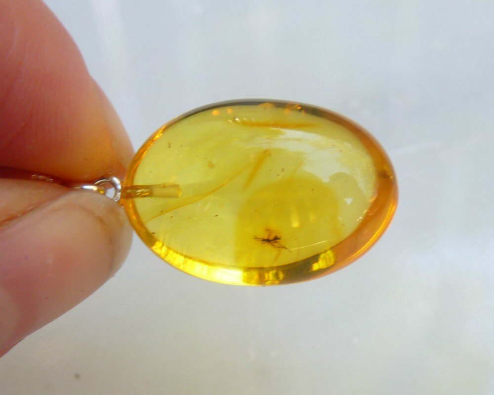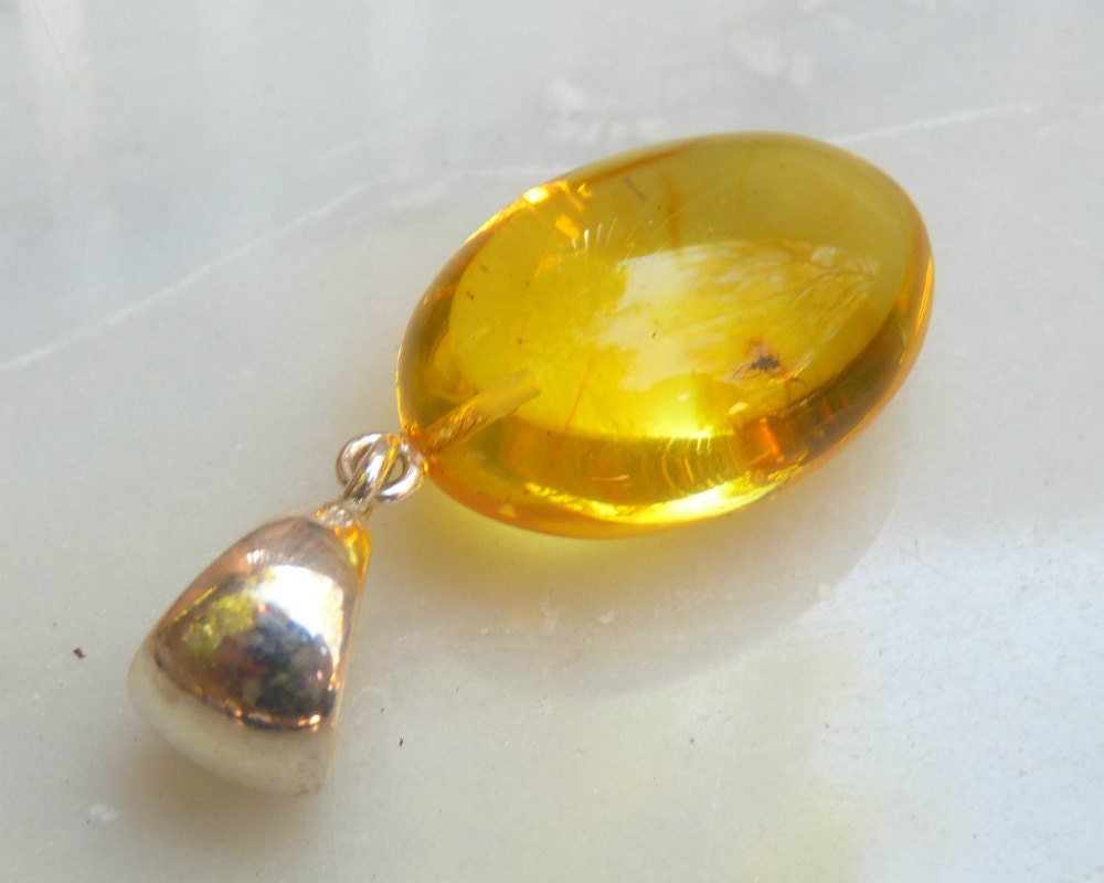 Baltic amber hand carved egg shape pendant with a fossil insect. The pendant is made out of natural translucent honey color untreated amber. Set in 925 sterling silver.