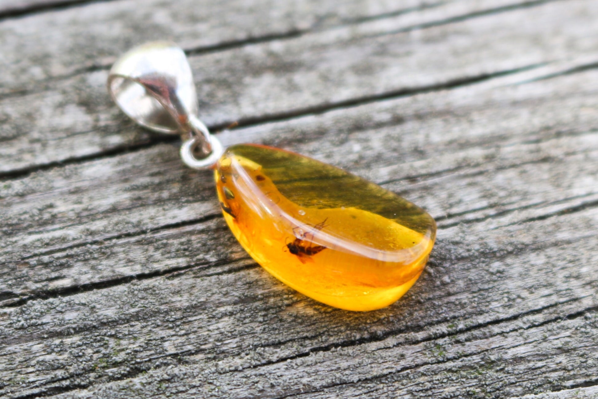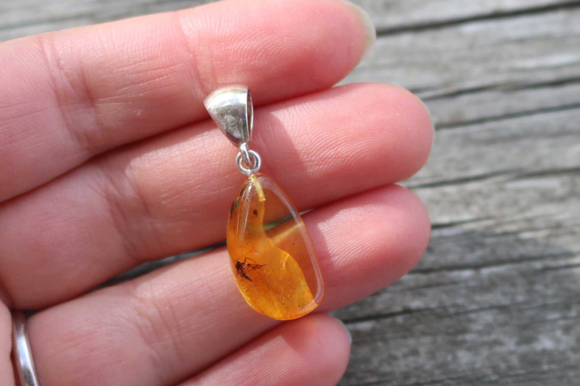 Baltic amber small hand carved pendant with a fossil fly. The pendant is made out of natural translucent honey color untreated amber. Set in 925 sterling silver.