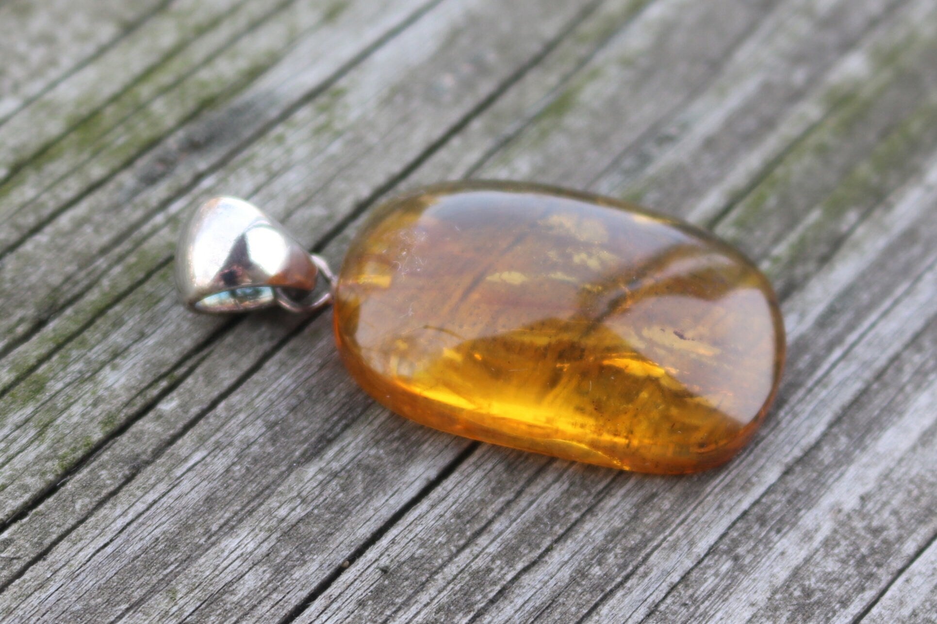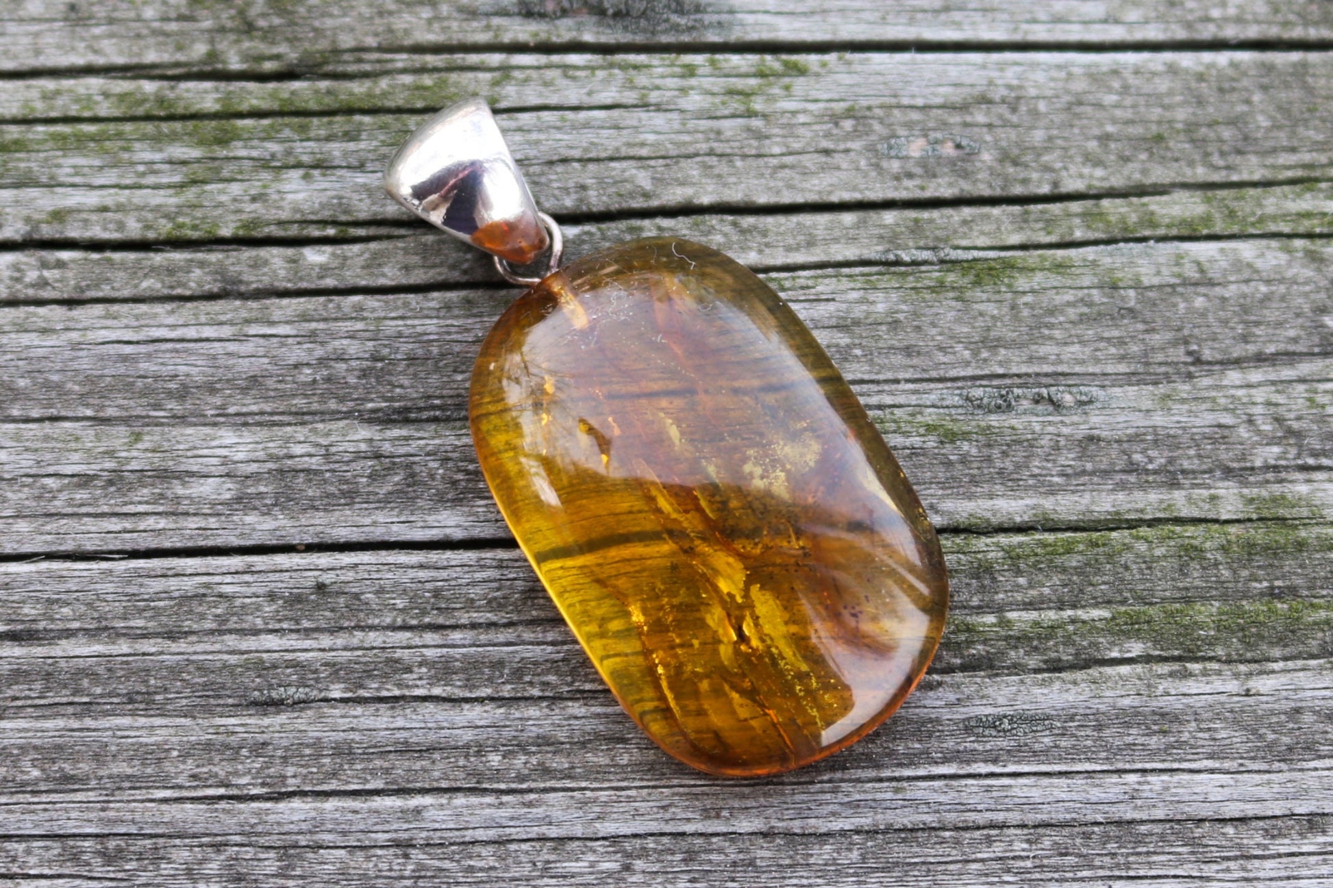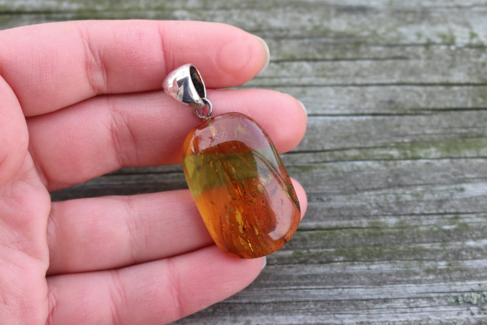 Baltic Amber Pendant with Fossil Insect Natural Untreated Honey 1.93" 7.2 gram 925 Silver