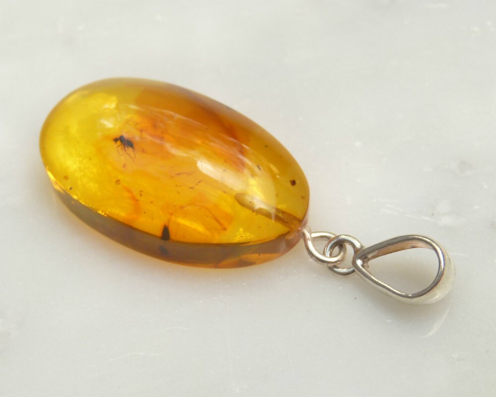 Baltic amber hand carved oval pendant with an intact fossil insect. The pendant is made out of natural translucent honey color untreated amber. Set in 925 sterling silver.
