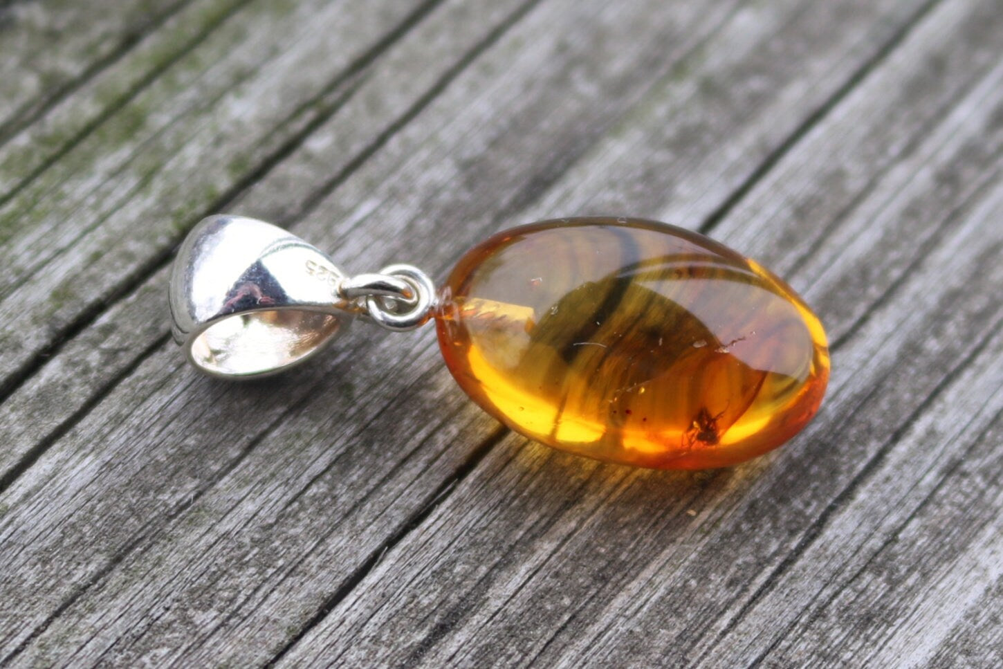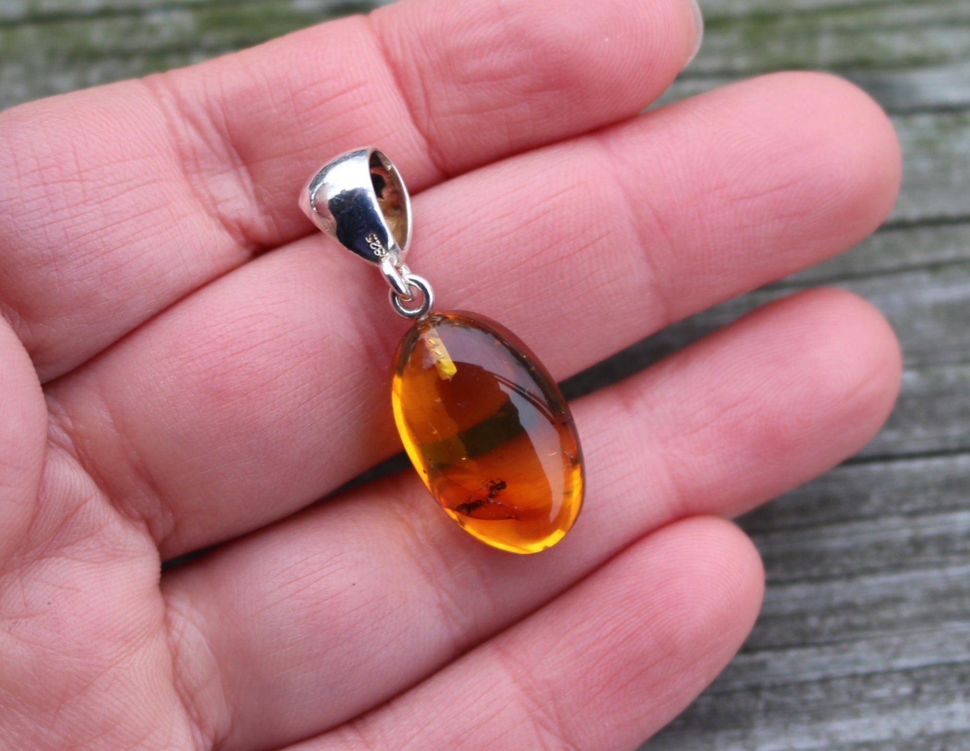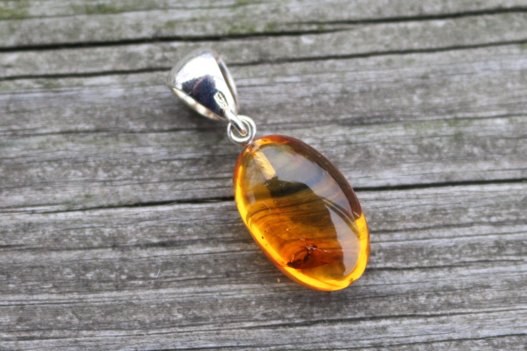 Baltic Amber Pendant With Fossil Insect Oval Honey Natural 1.62" 2.6 gram 925 Silver
