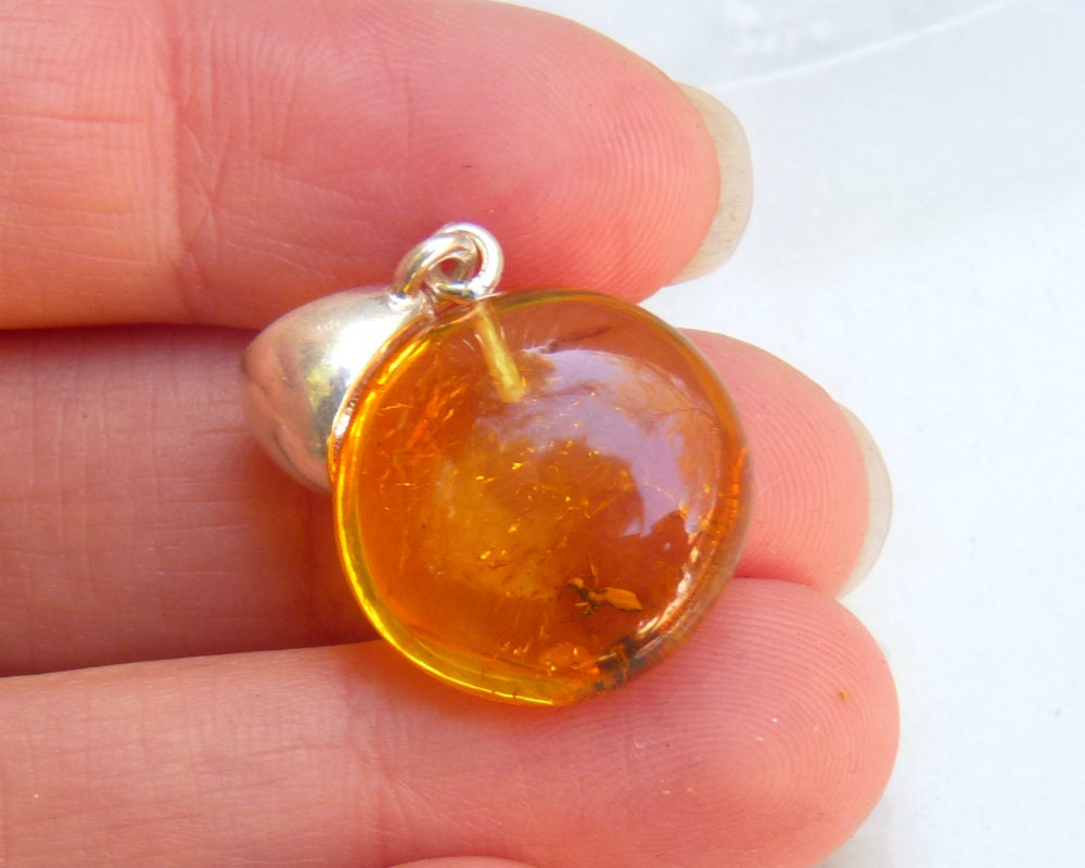 Baltic amber hand carved round pendant with an intact fossil. The pendant is made out of natural translucent honey color untreated amber. Set in 925 sterling silver.
