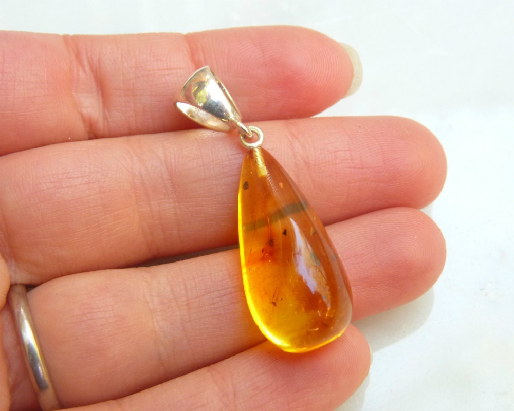 Baltic amber hand carved pendant with a few fossil insects. The pendant is made out of natural translucent honey color untreated amber. Set in 925 sterling silver.