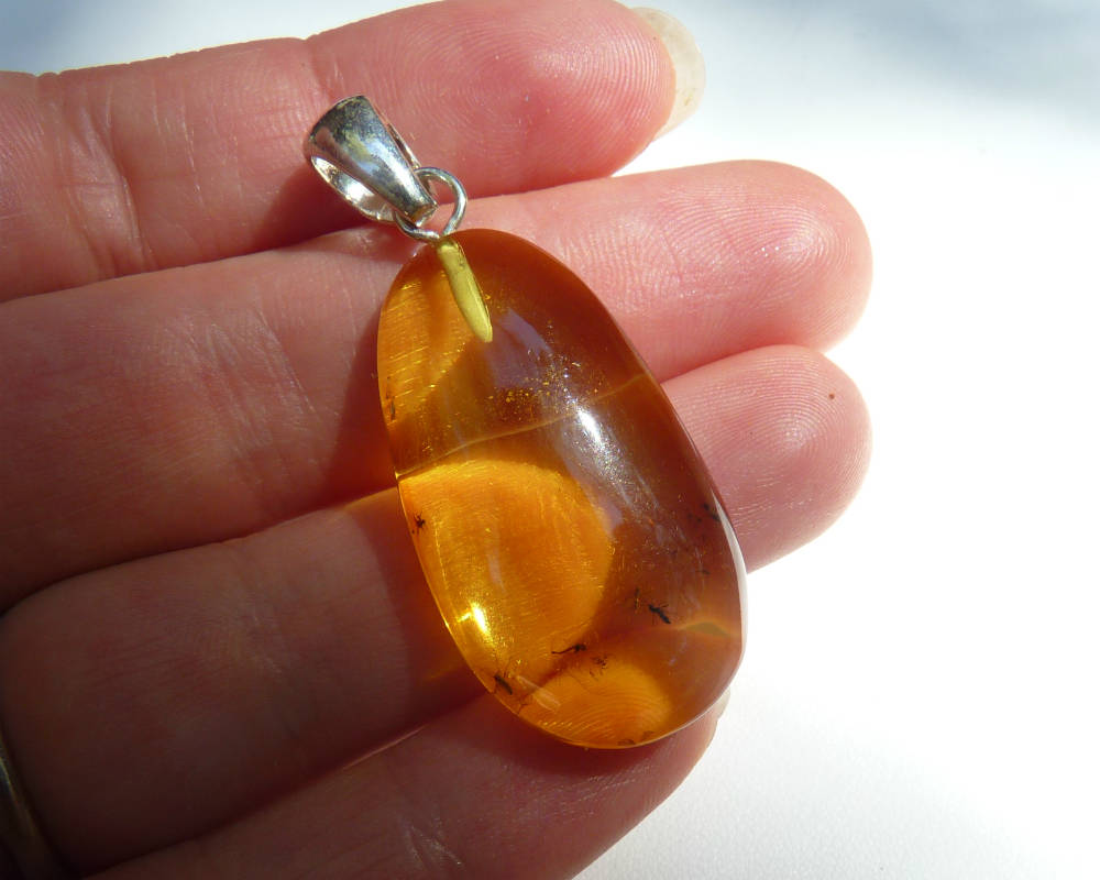 Baltic amber hand carved drop pendant with a few small fossil insects. The pendant is made out of natural yellow untreated amber. Set in 925 sterling silver.