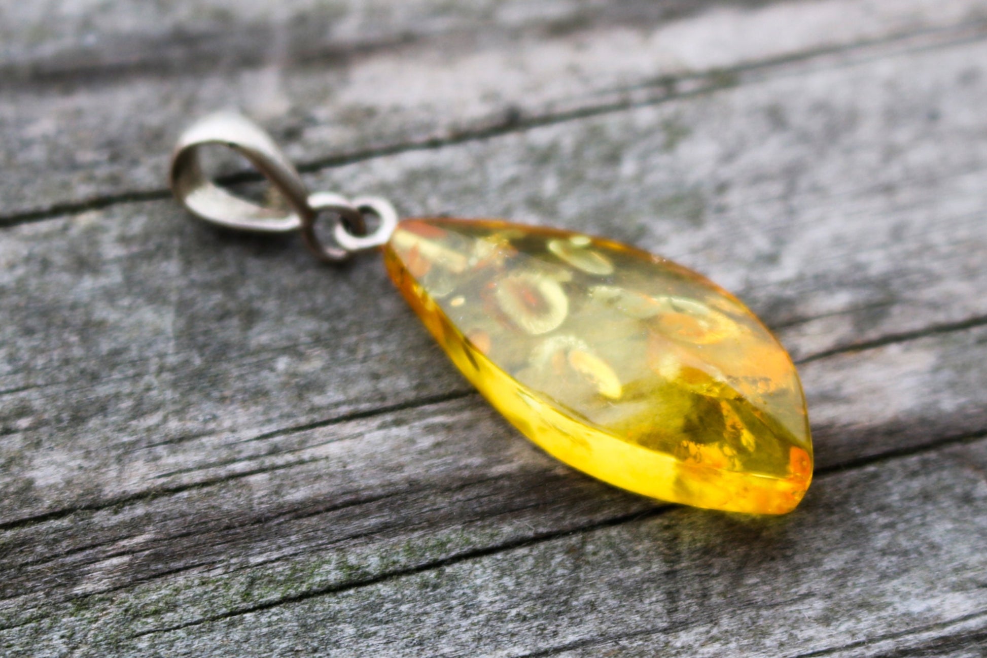 Baltic Amber hand faceted pendant in sparkling yellow color with natural cloudiness.
