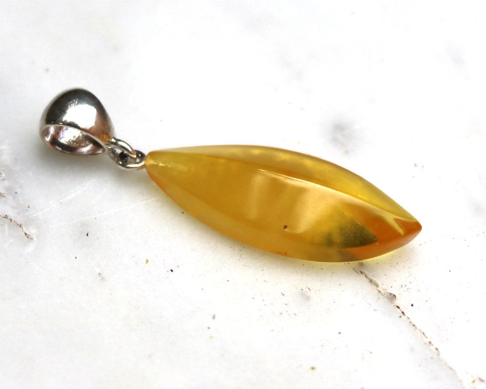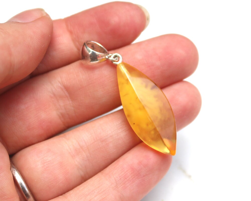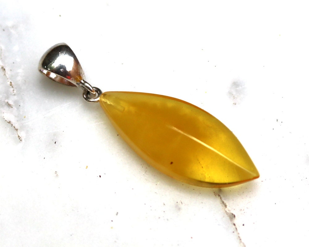 Baltic Amber hand carved and faceted pendant in untreated yellow color with rare natural cloudiness. Set in 925 sterling silver.