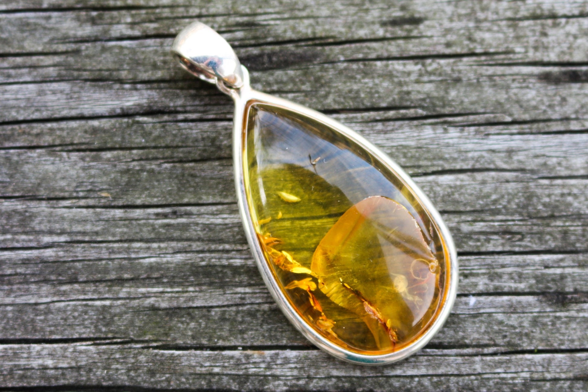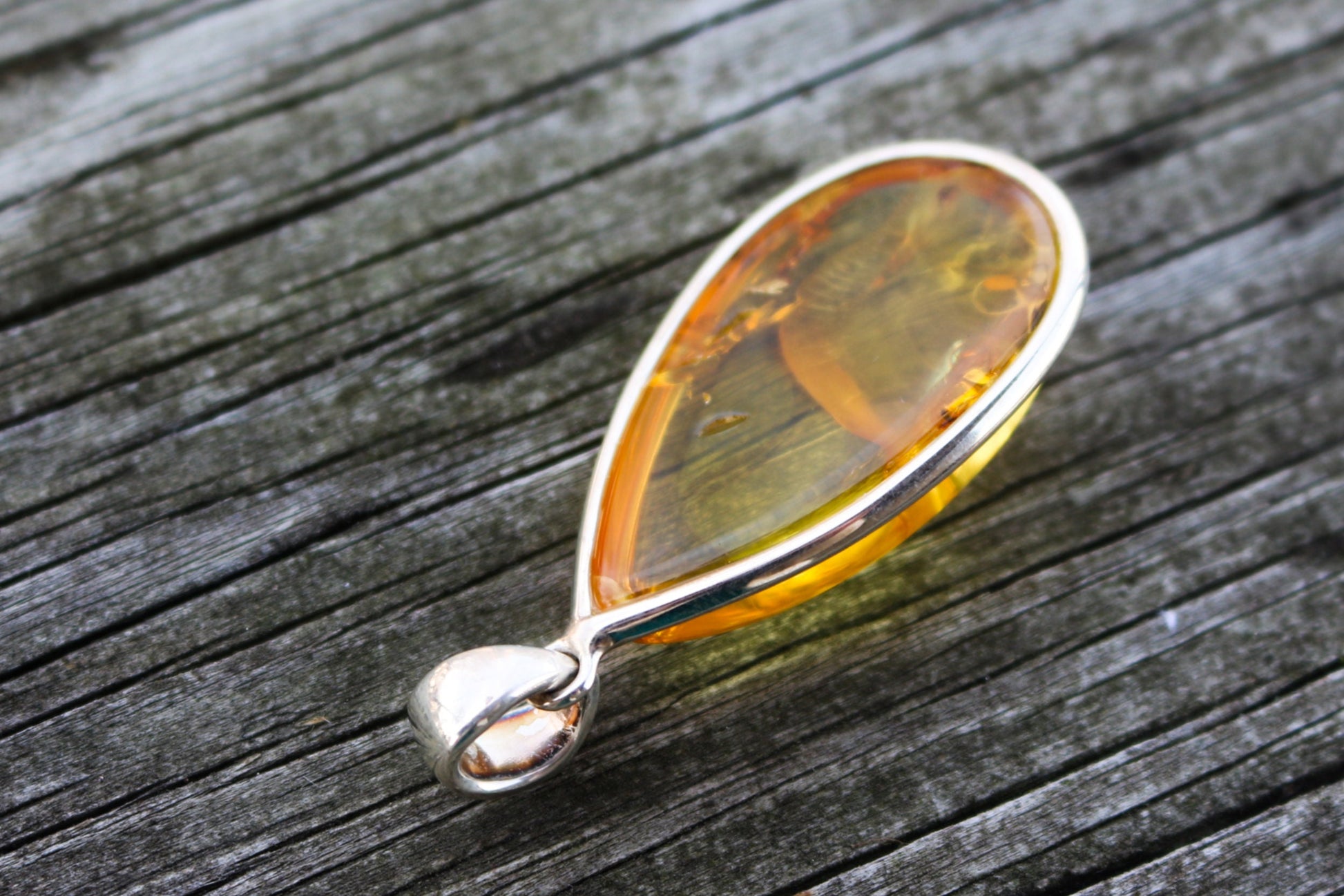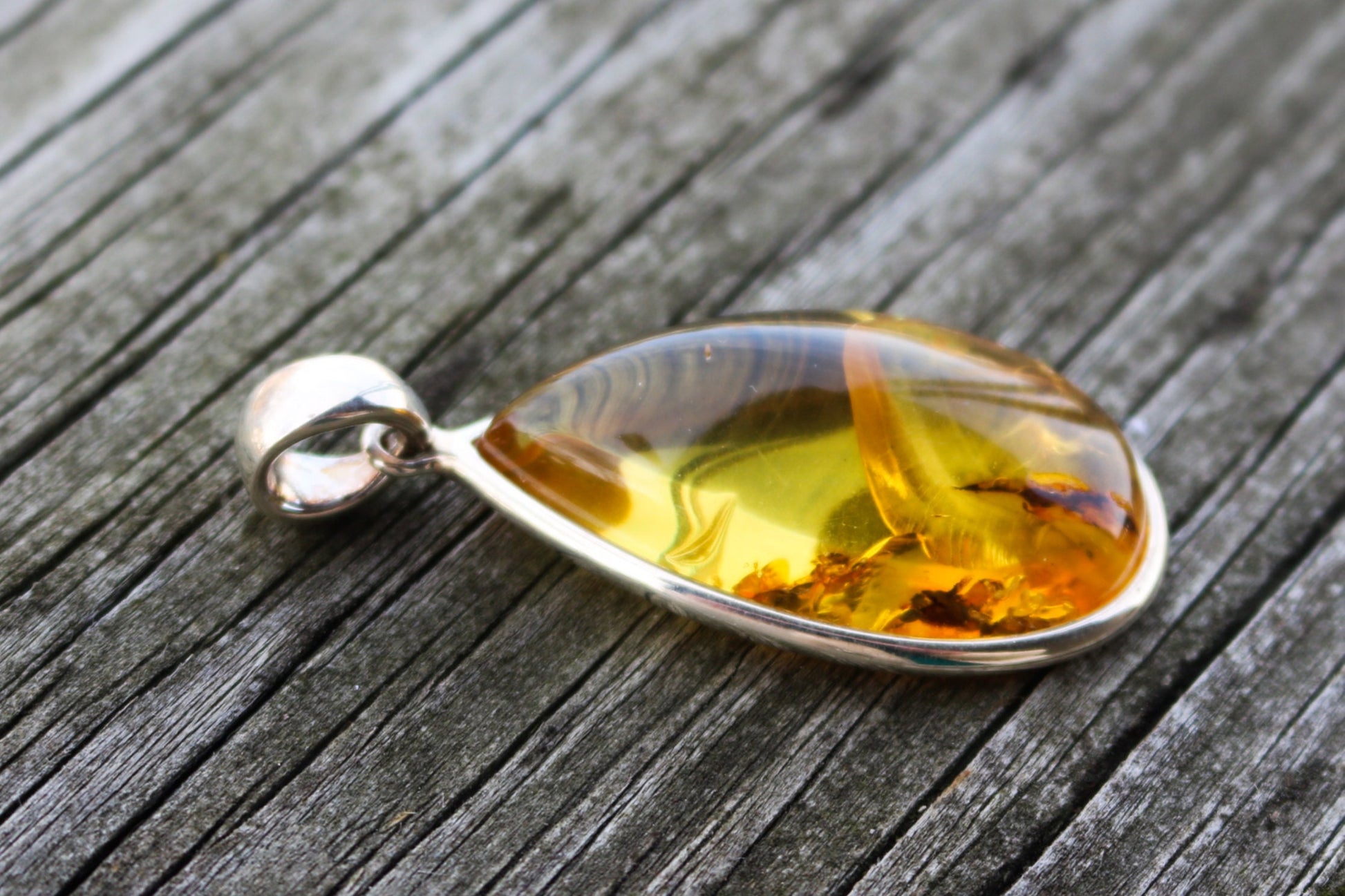 Baltic Amber drop pendant in natural untreated transparent yellow pendant with reflexes.