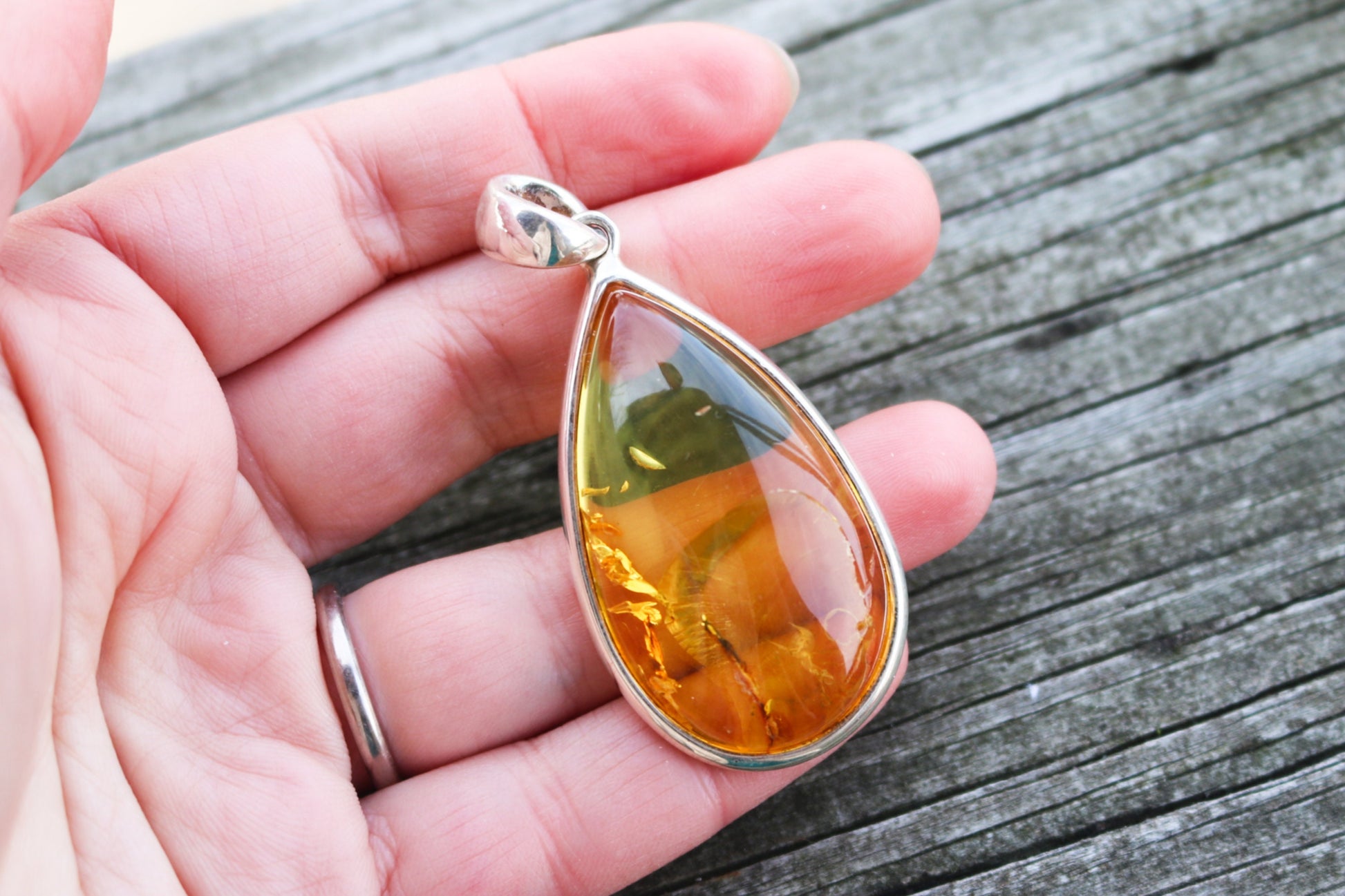 Baltic Amber Pendant Yellow Transparent Drop Raw Natural Unisex Jewelry 2.7" 14.7 gram 925 Silver