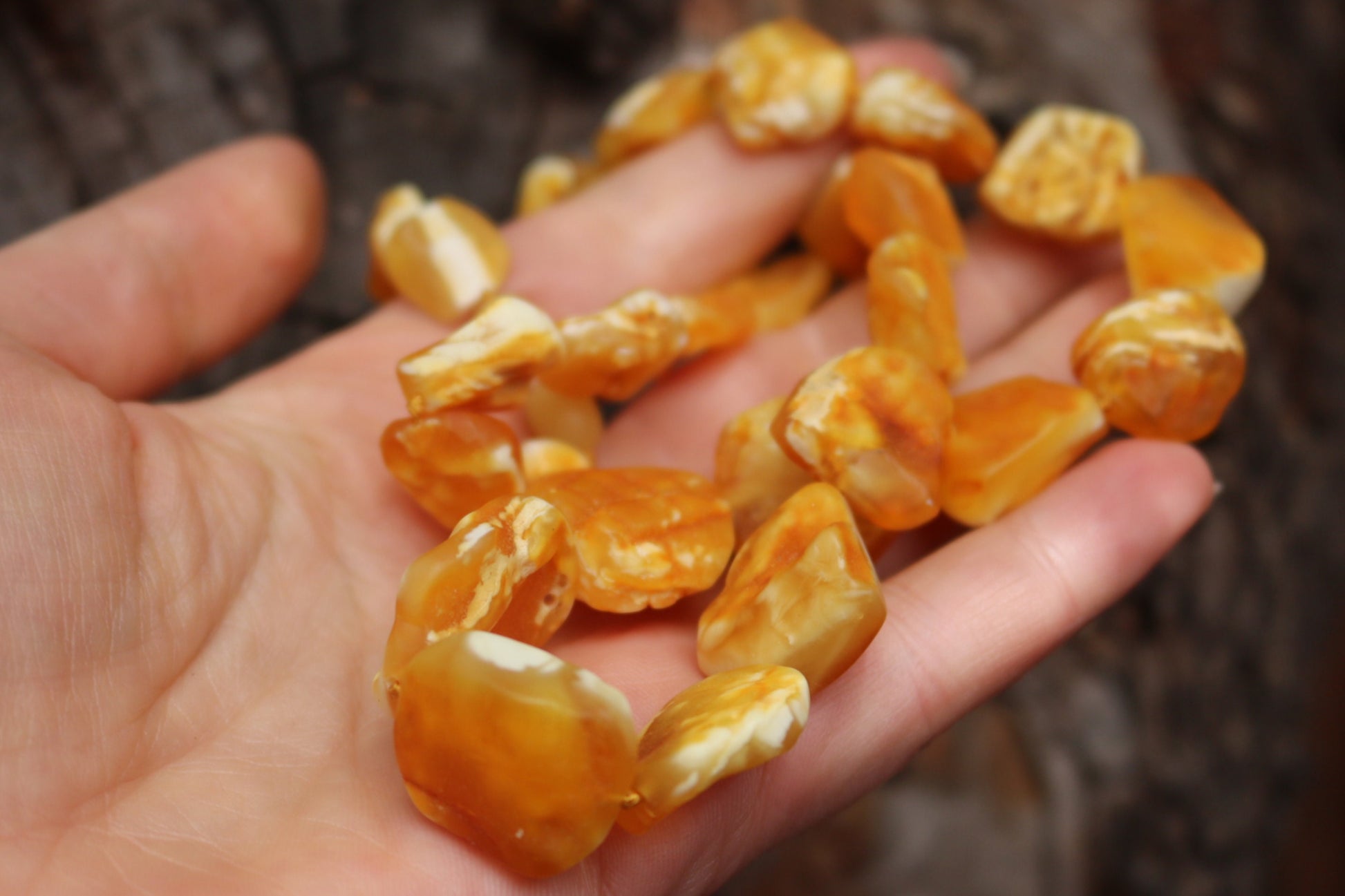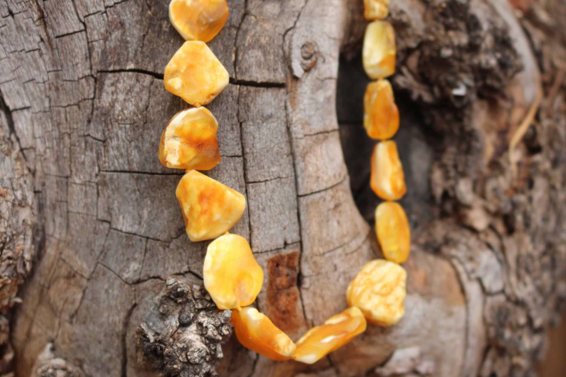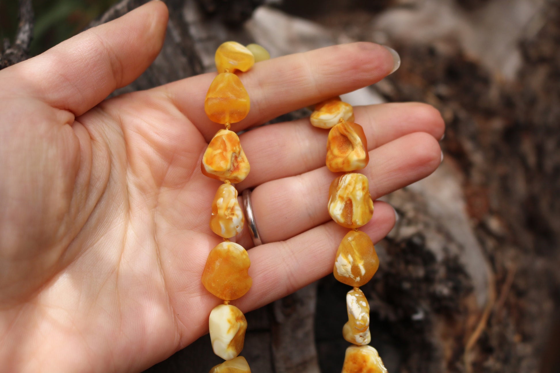 Baltic Amber necklace made out of untreated unpolished butterscotch beads with natural crust. Each bead measures between 0.48 – 0.94 inch in length (1.2 – 2.4 cm).