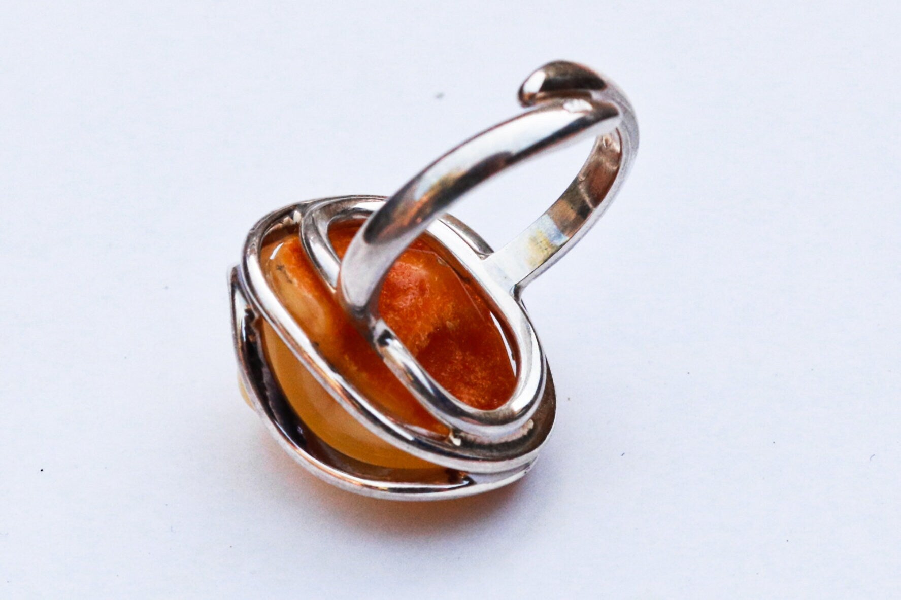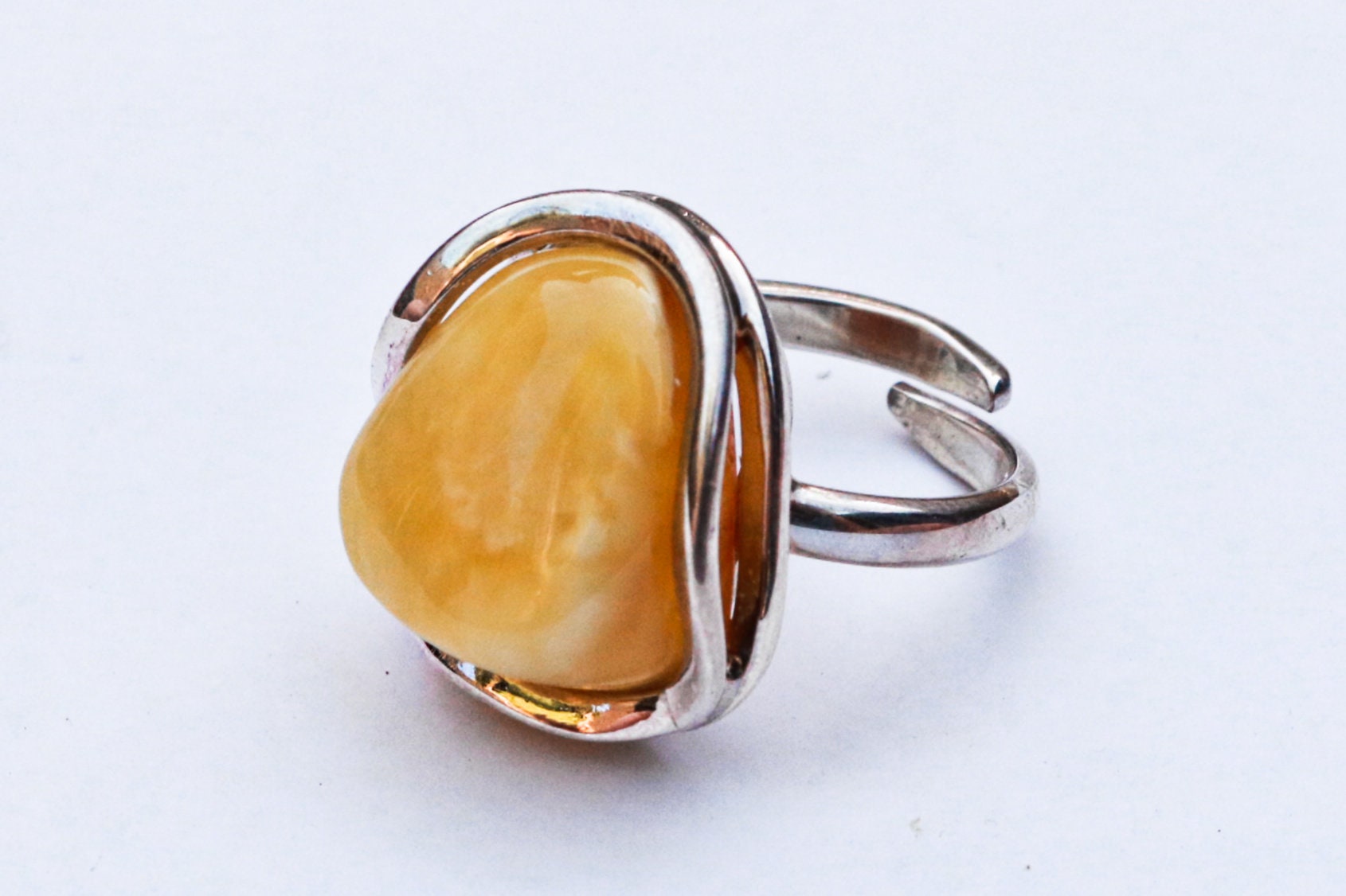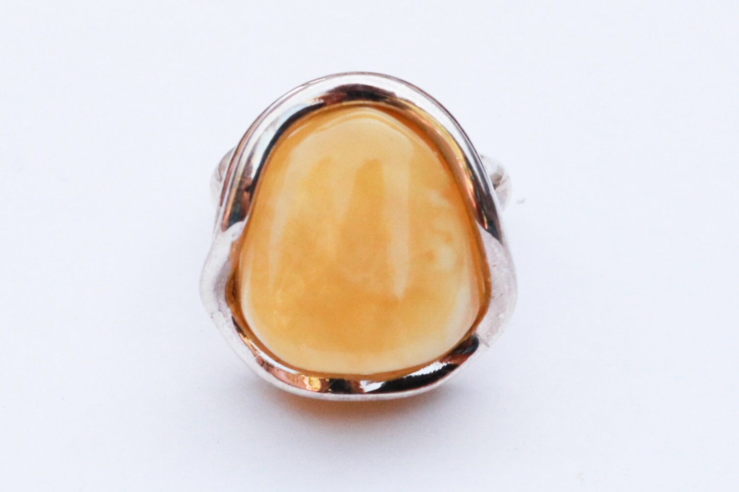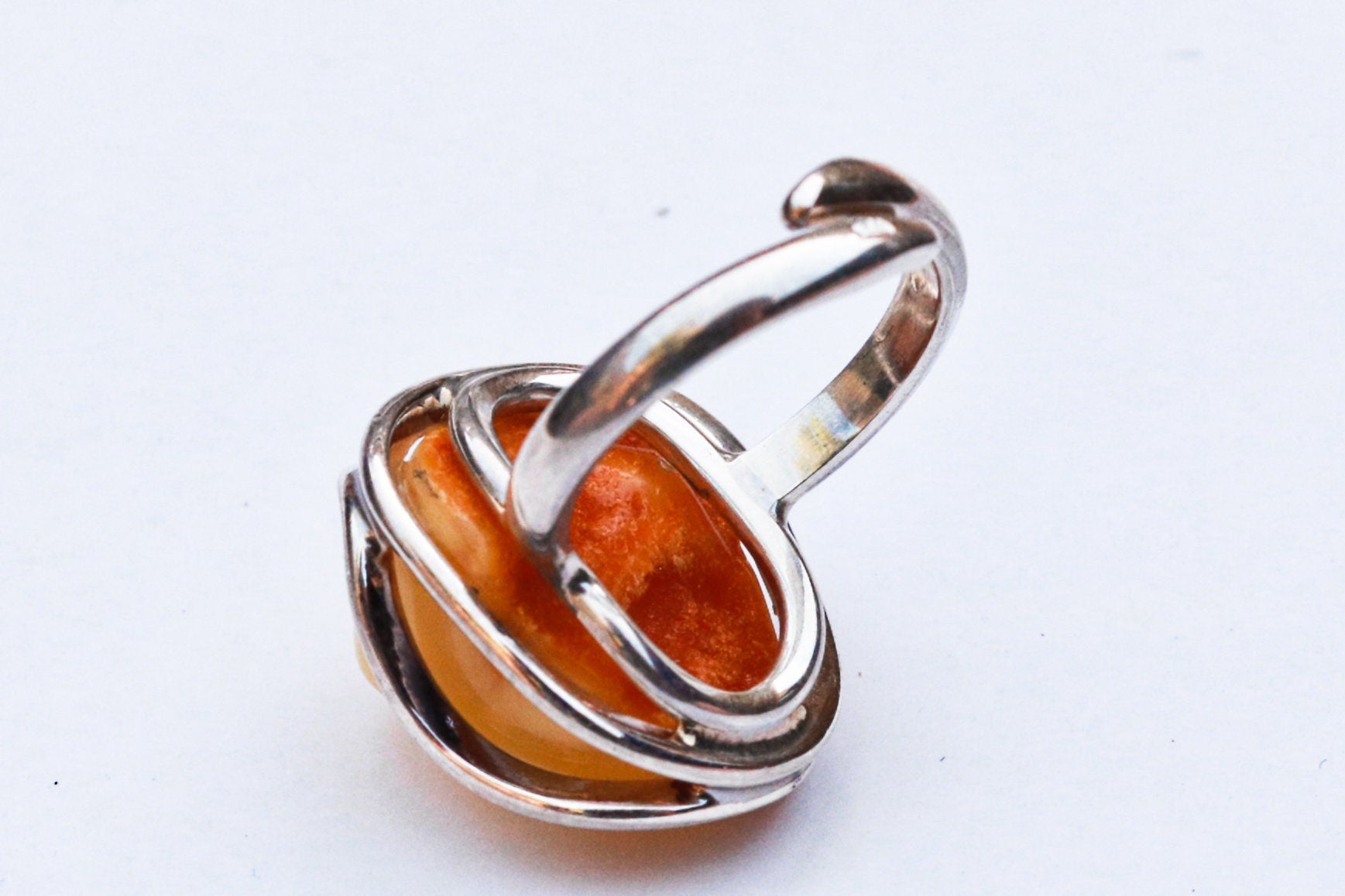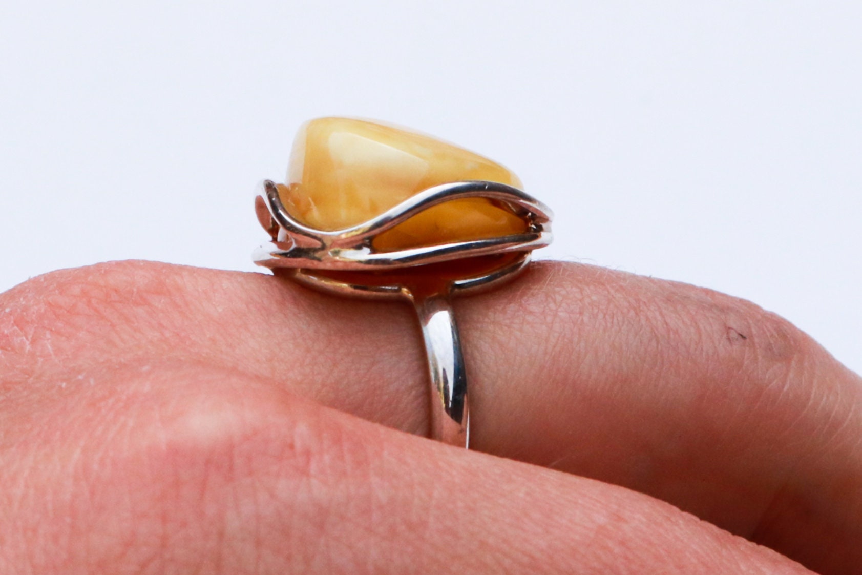Baltic Amber ring in natural untreated butterscotch color with some milky swirls. Set in 925 sterling silver.