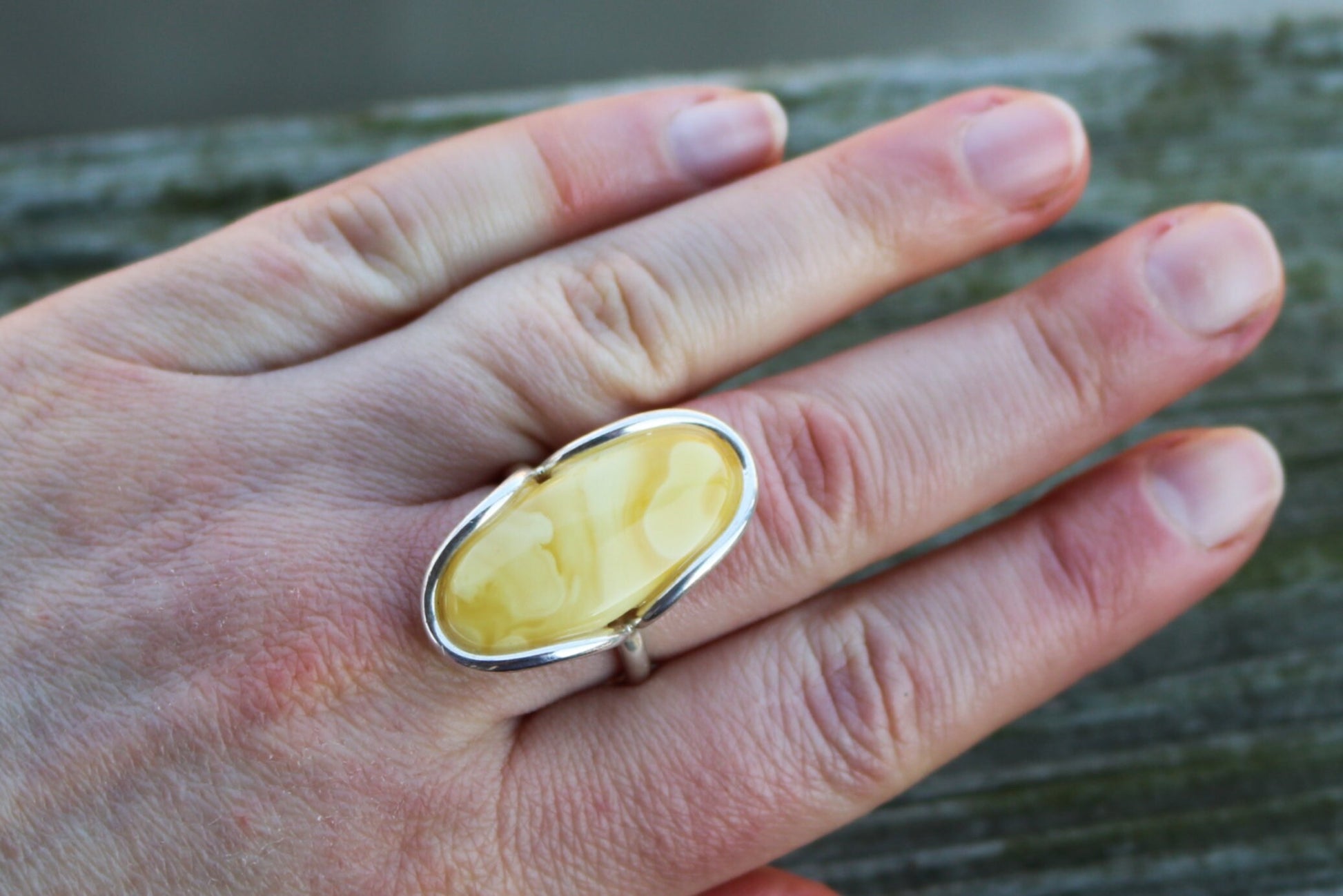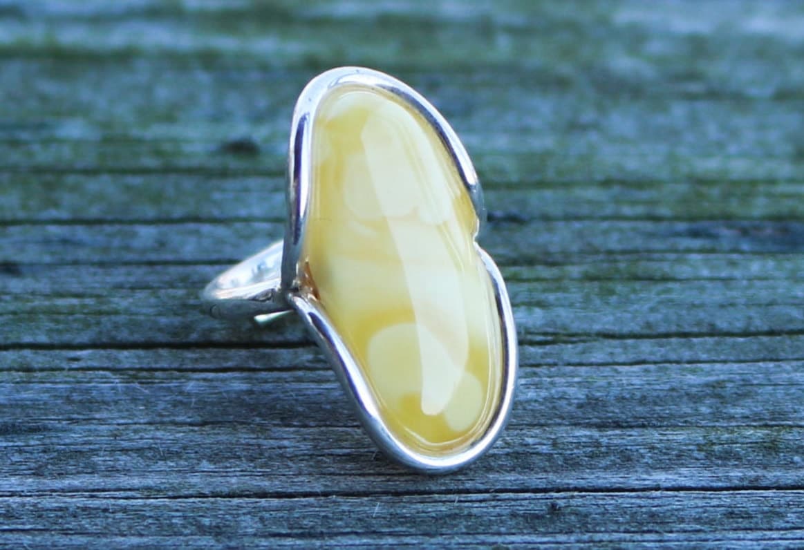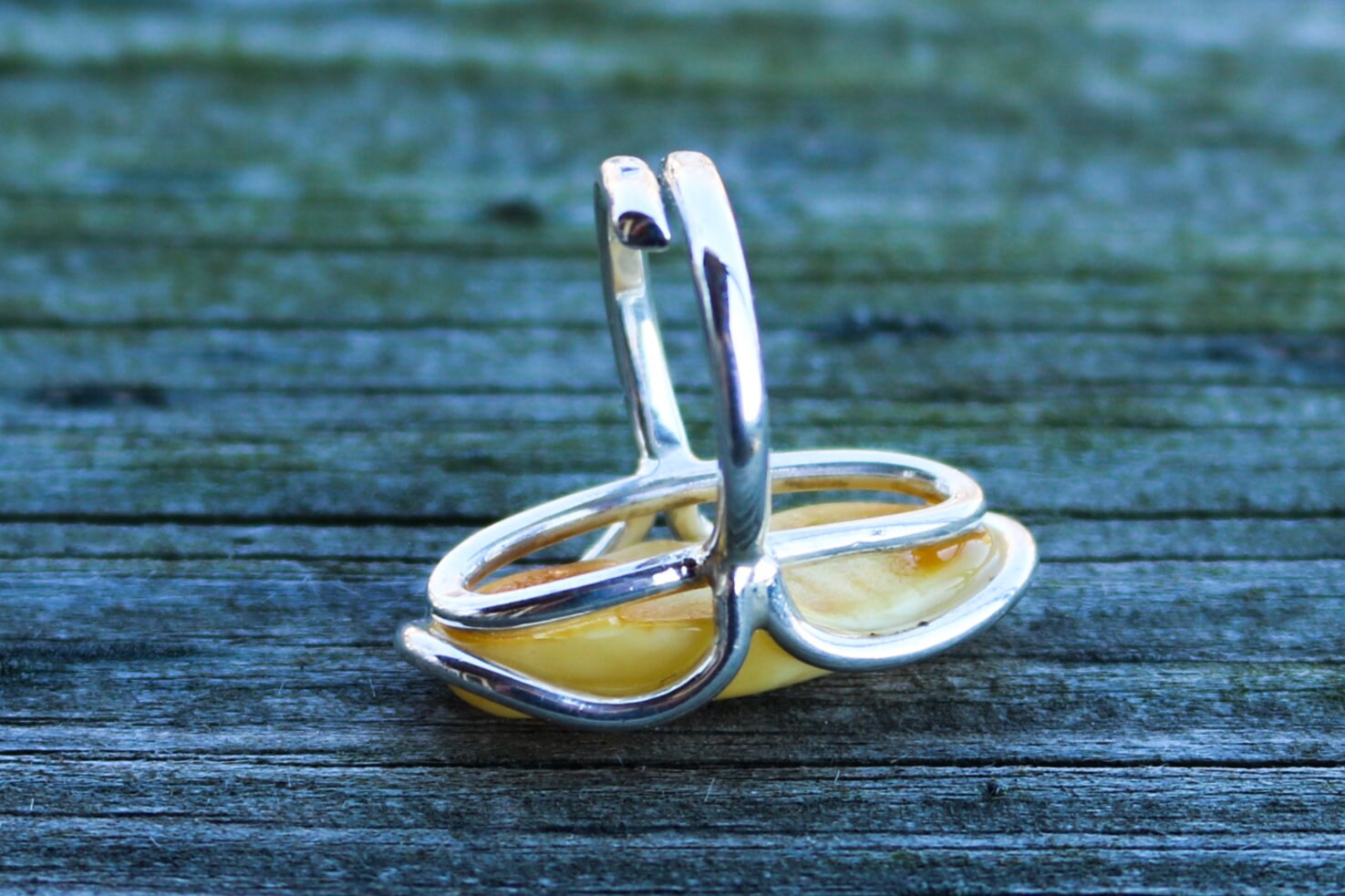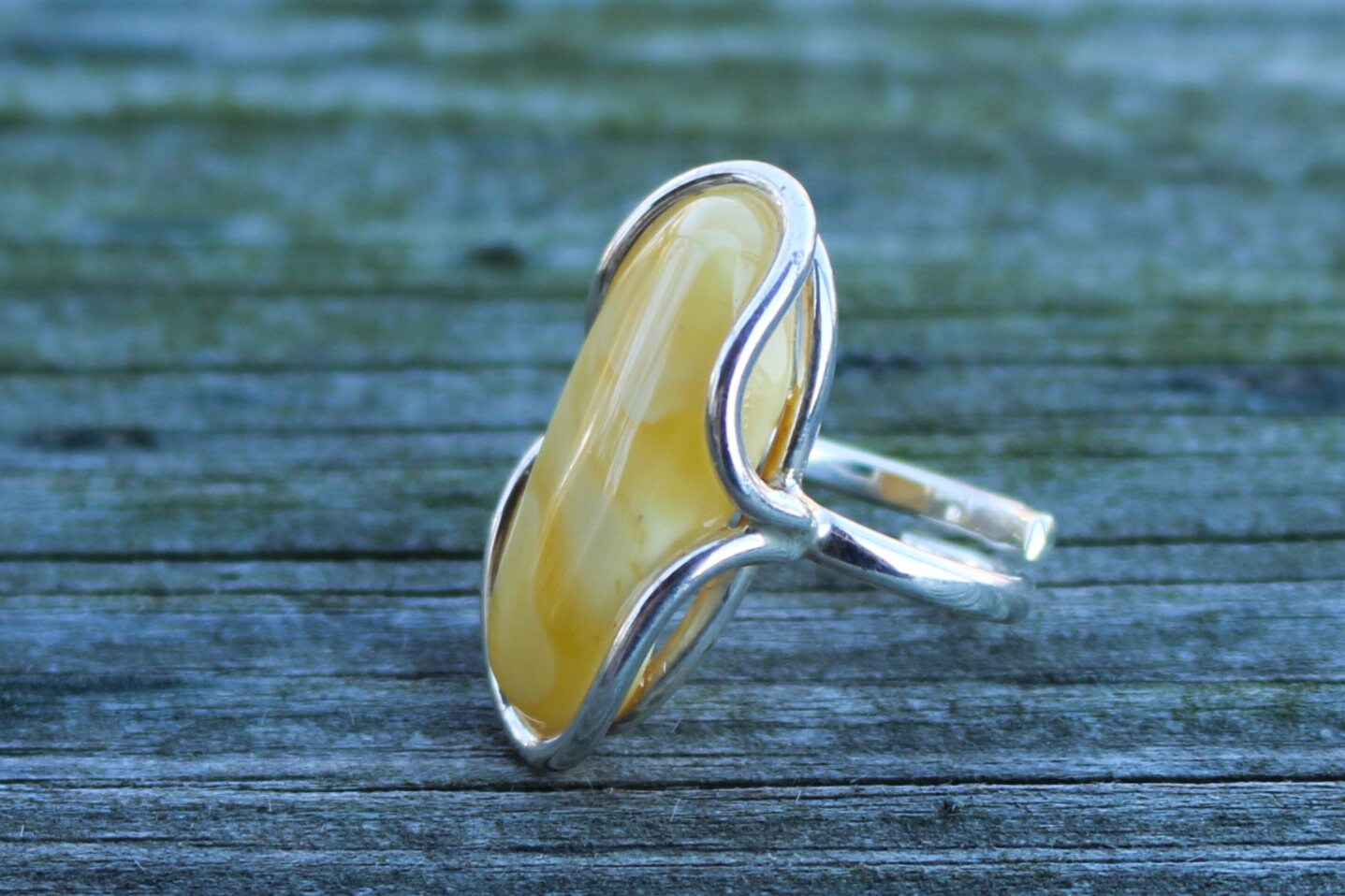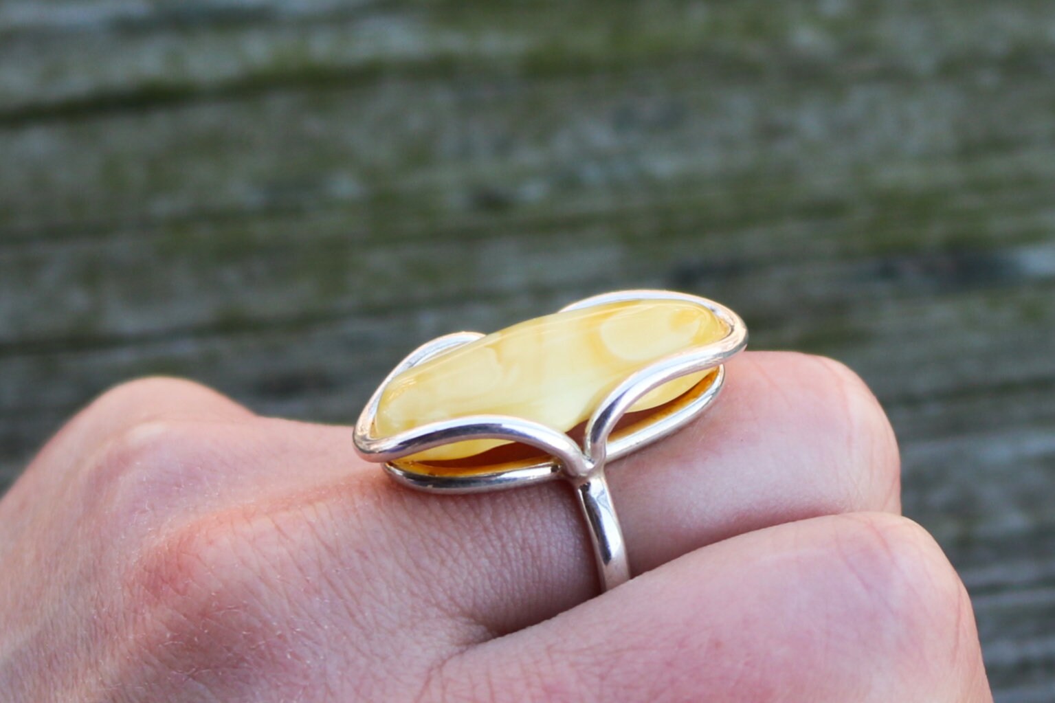 Baltic Amber ring in natural untreated butterscotch color with milky swirls. Set in 925 sterling silver.
