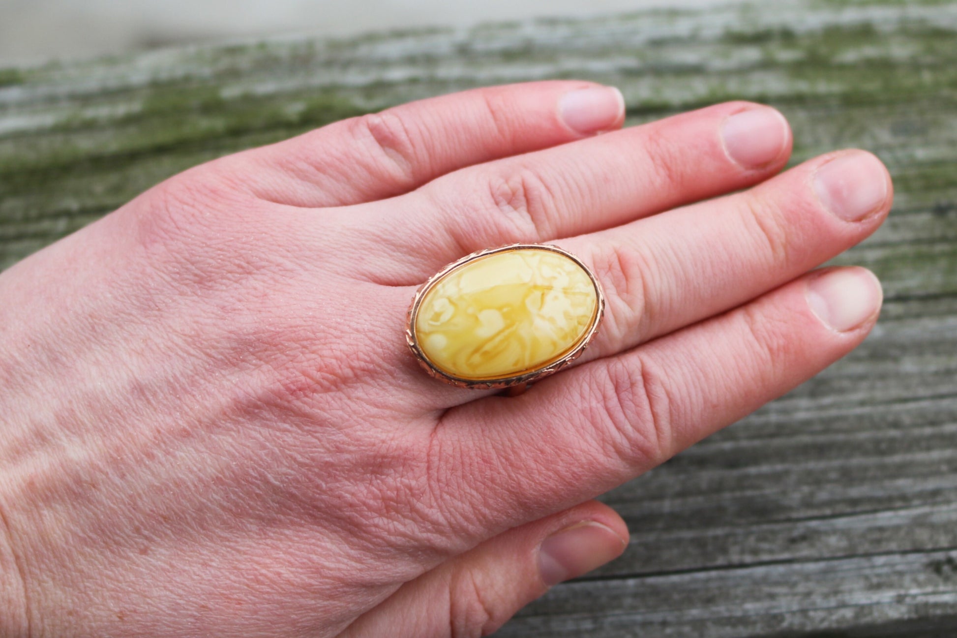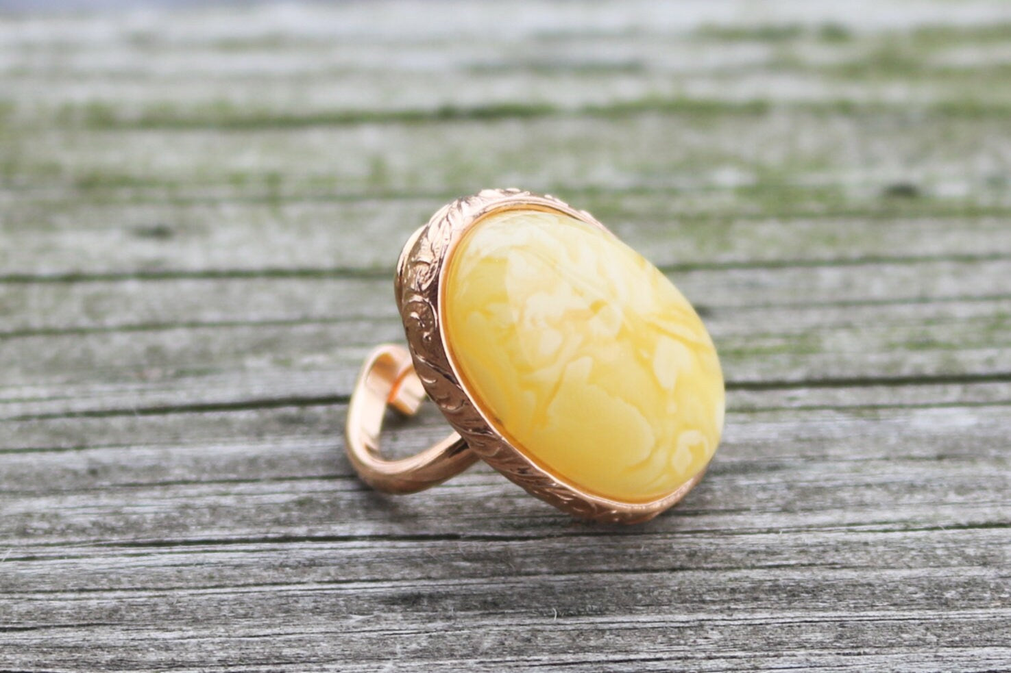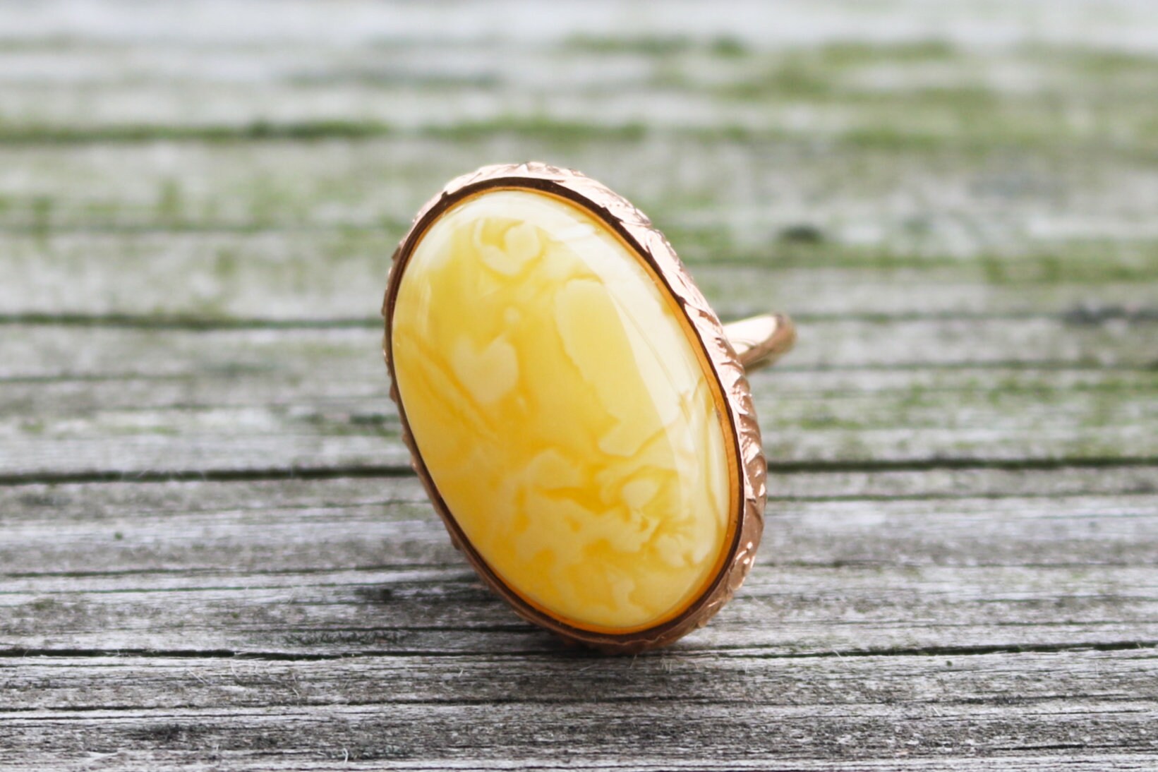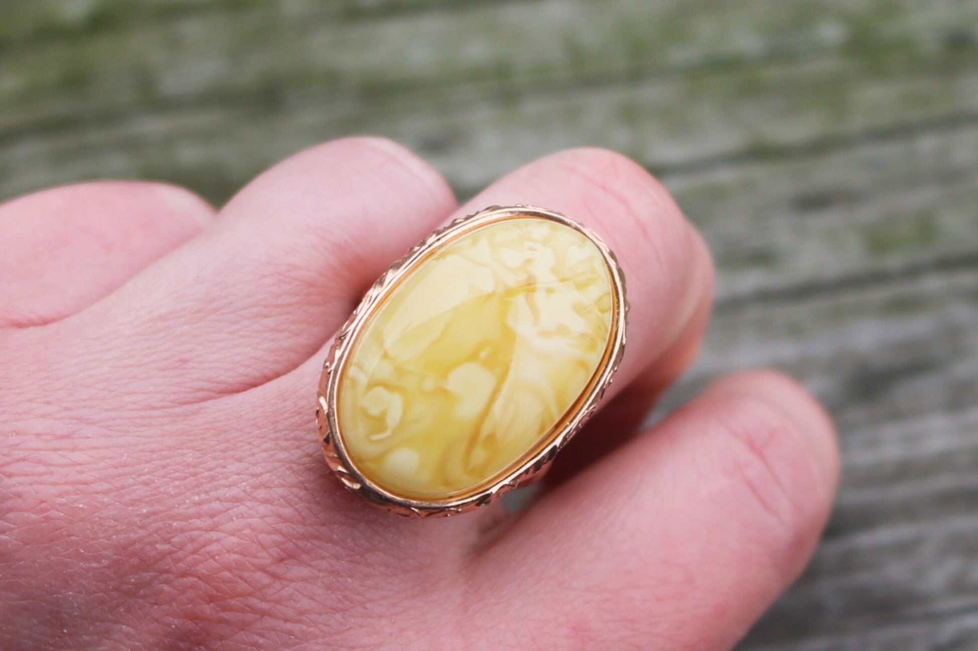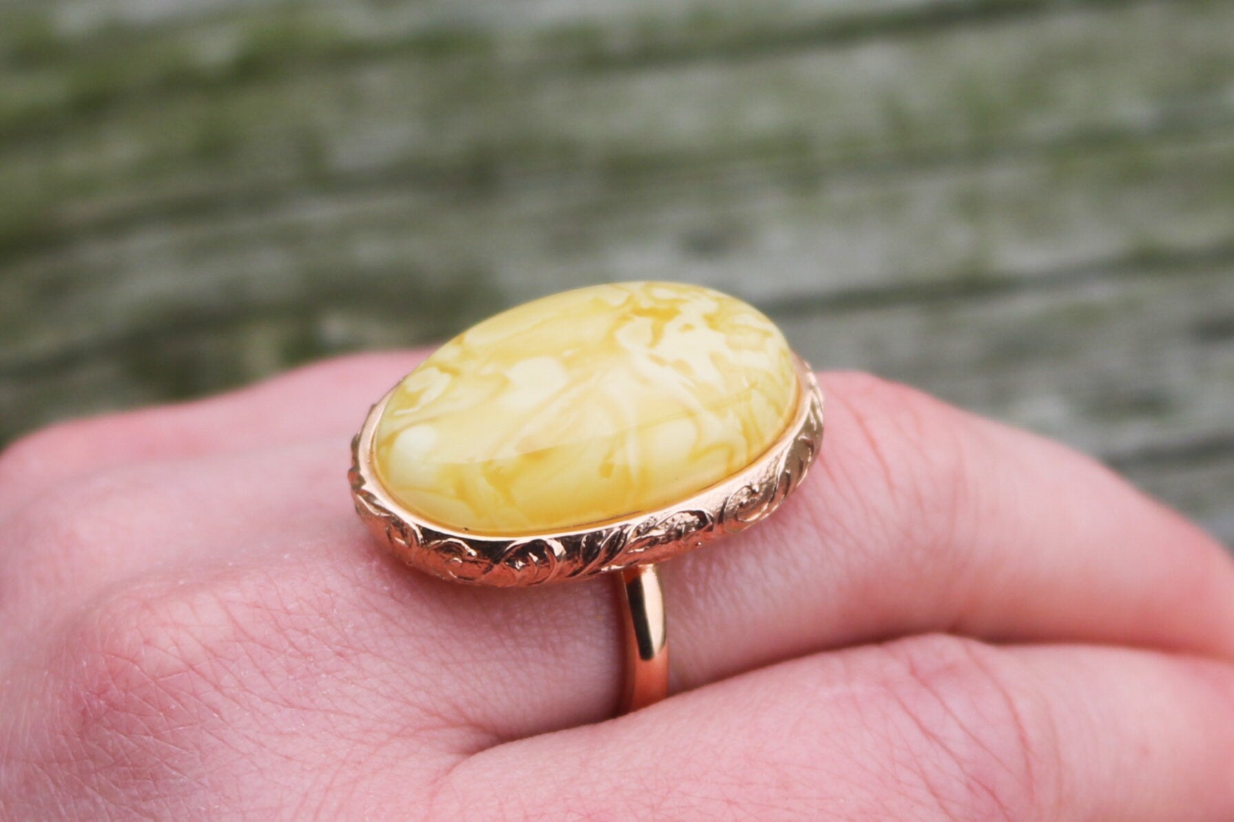 Unique Baltic Amber ring in natural untreated butterscotch color with milky swirls. Set in gold plated 925 sterling silver.