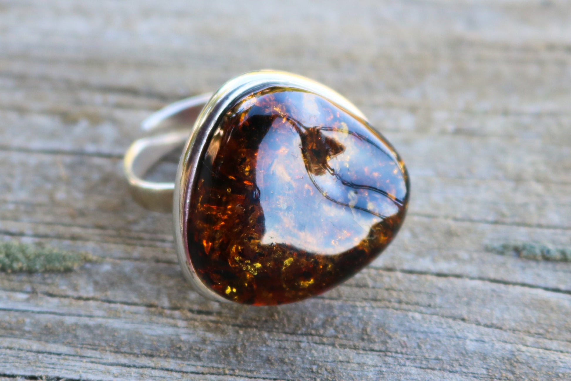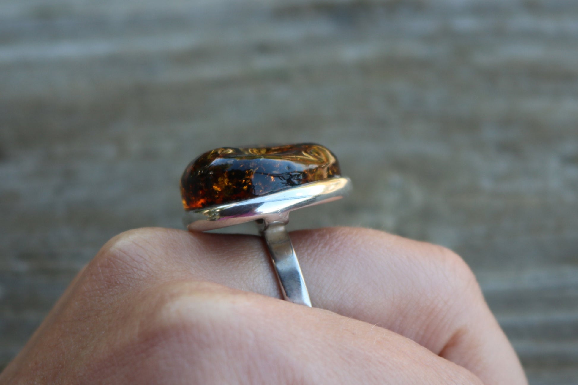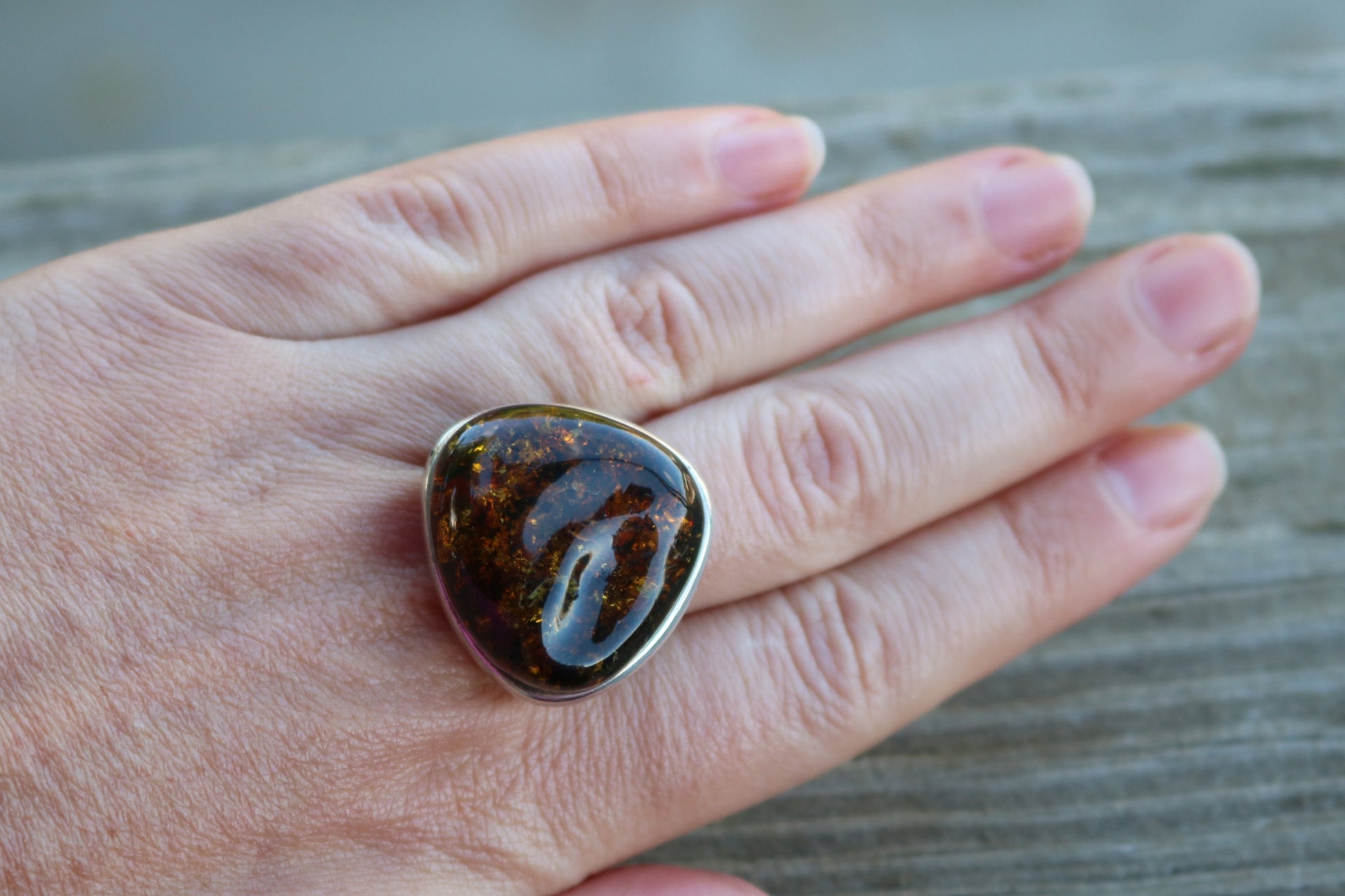 Baltic Amber ring in sparkling dark green color. Set in 925 sterling silver. Will fit any size.