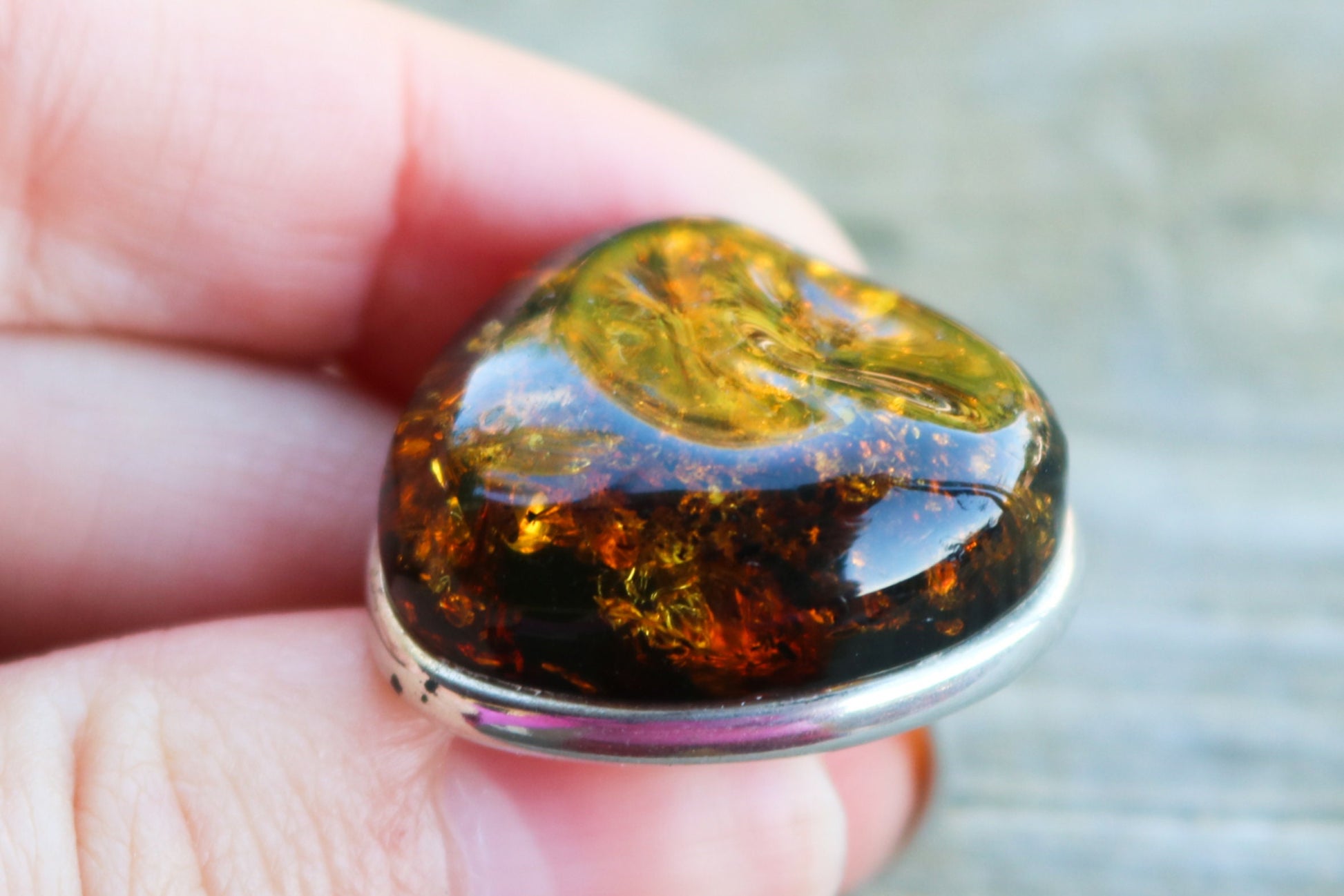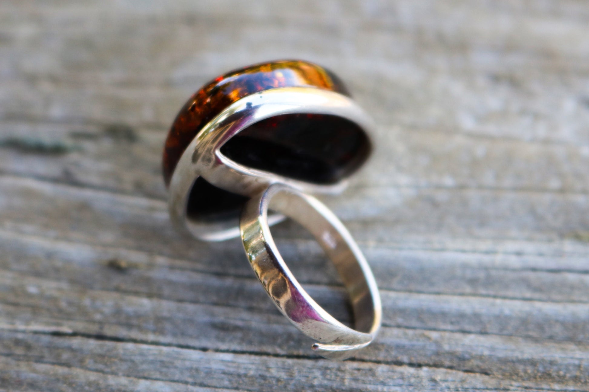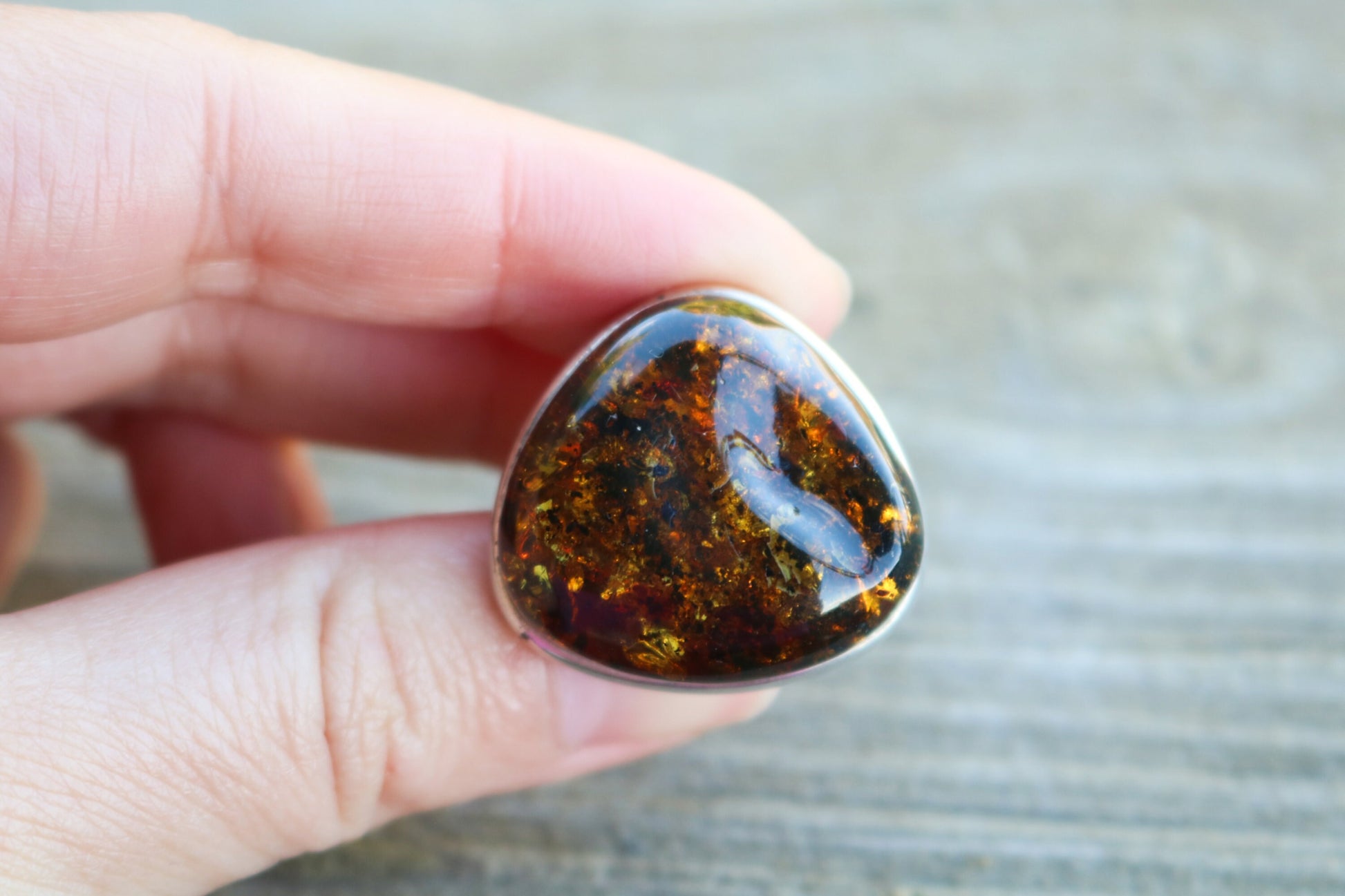 Baltic Amber ring in sparkling dark green color. Set in 925 sterling silver. Will fit any size.