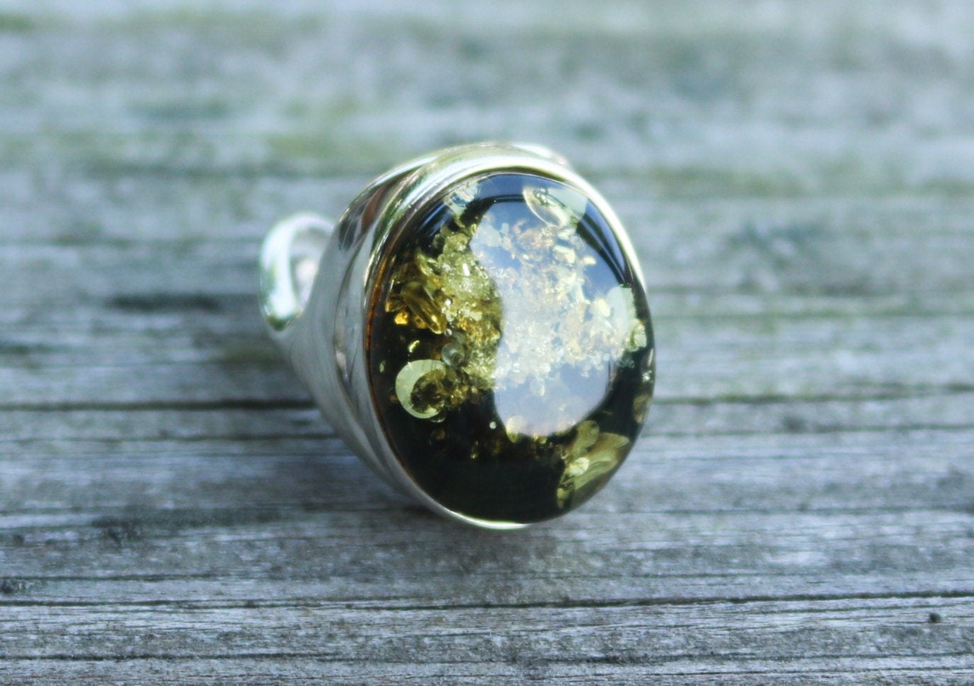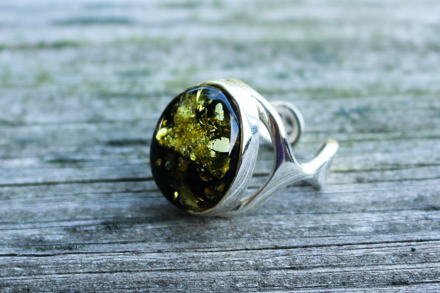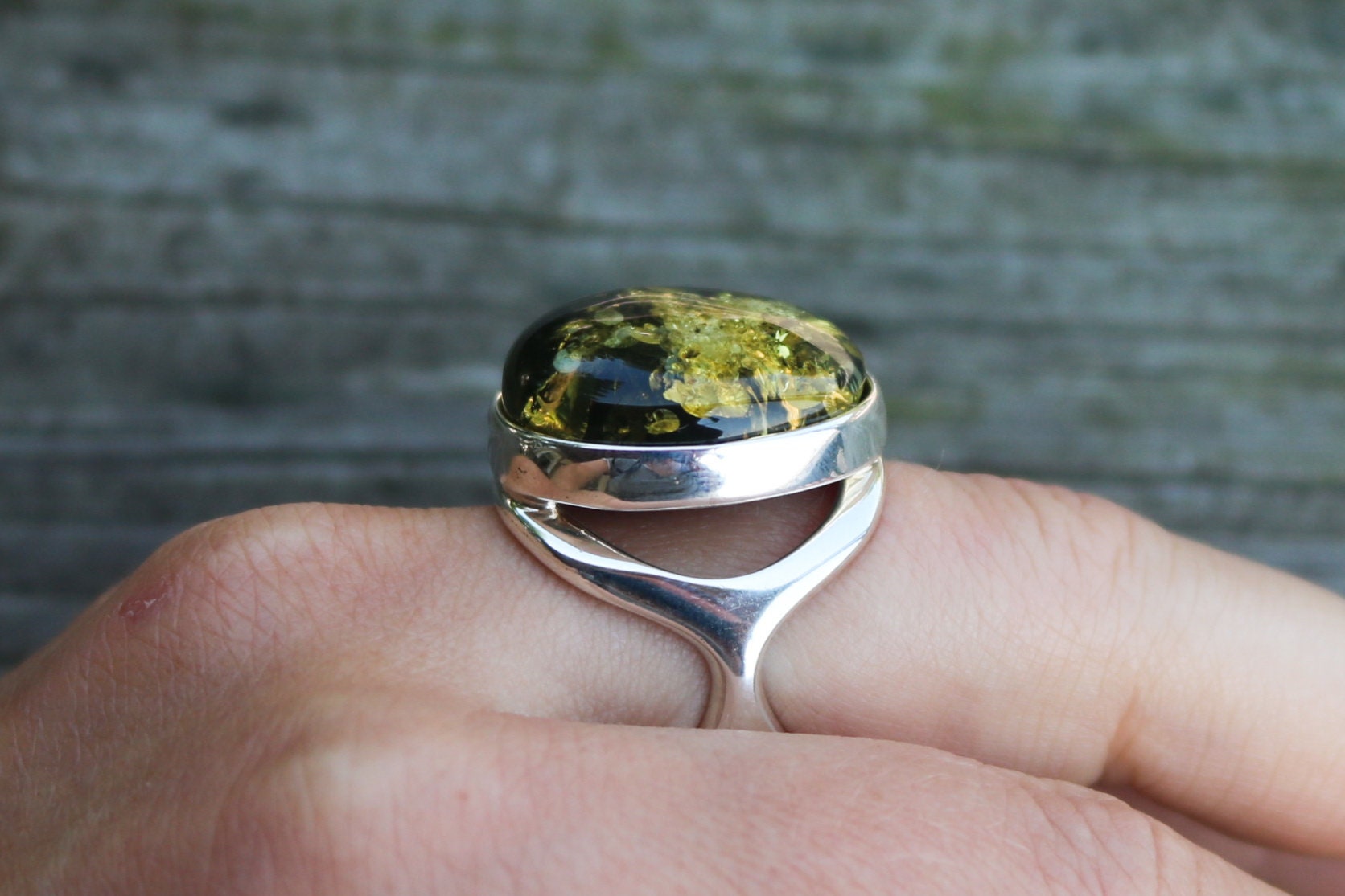 Baltic Amber oval ring in sparkling dark green color. Set in 925 sterling silver. Will fit any size.
