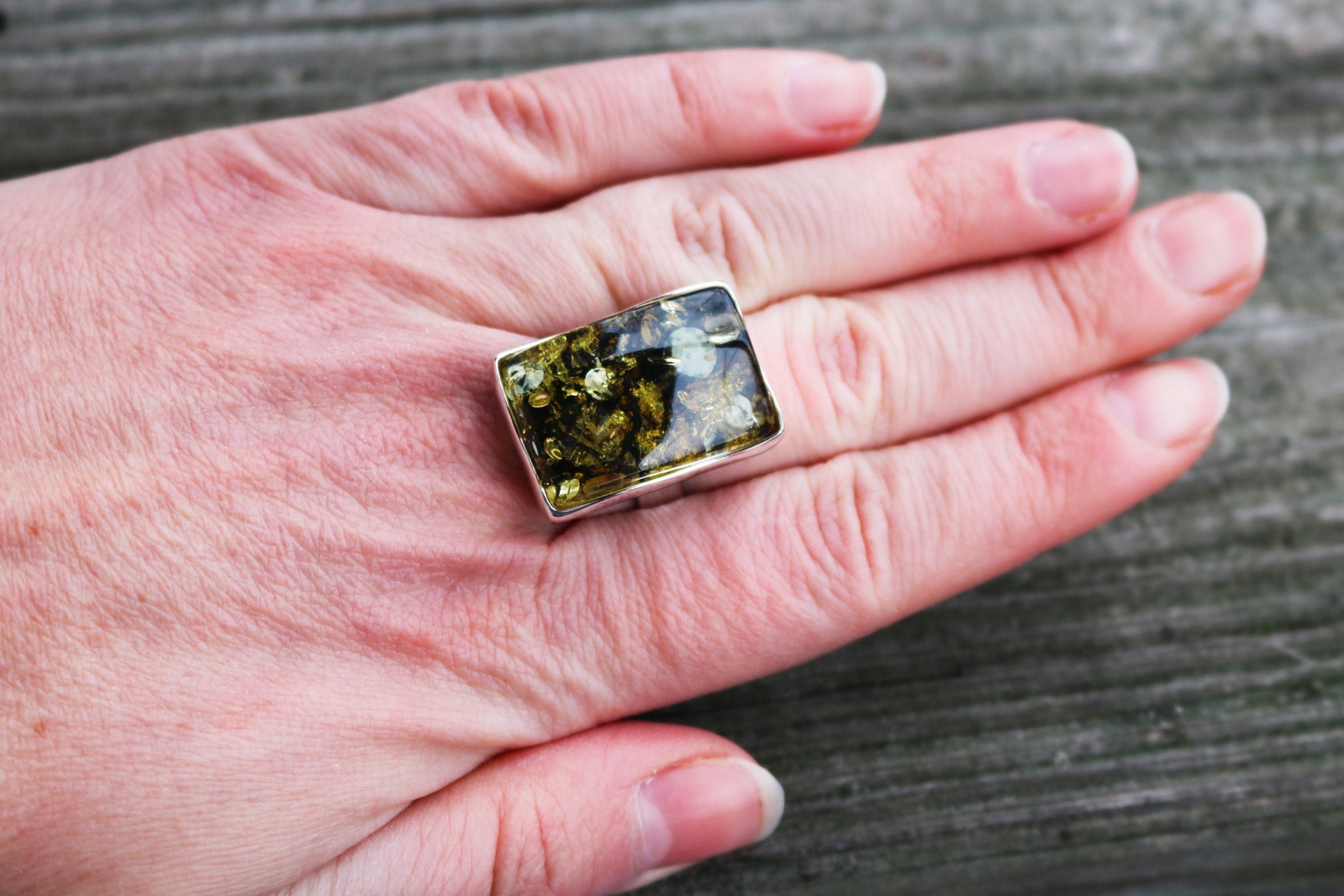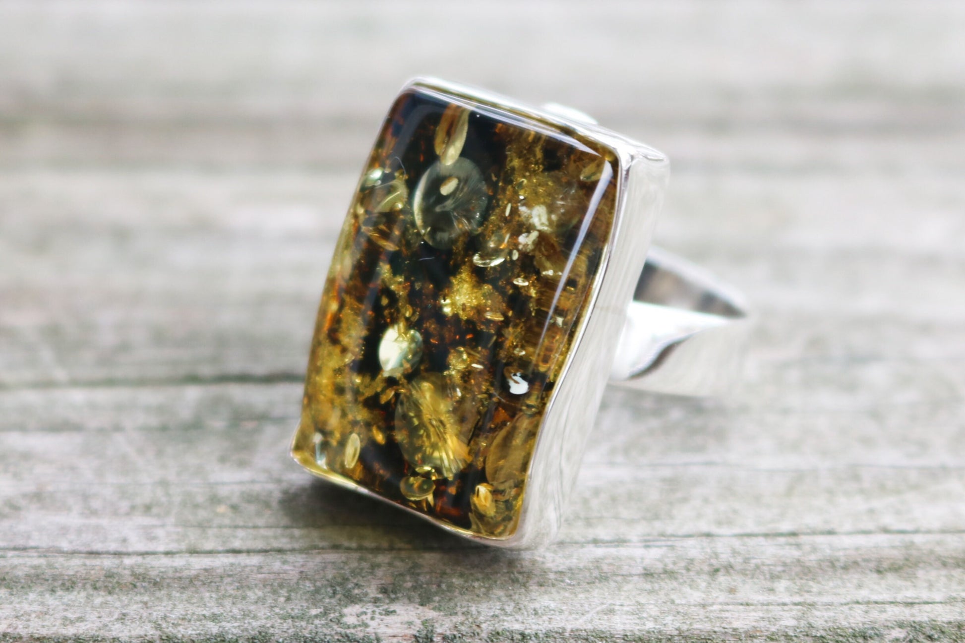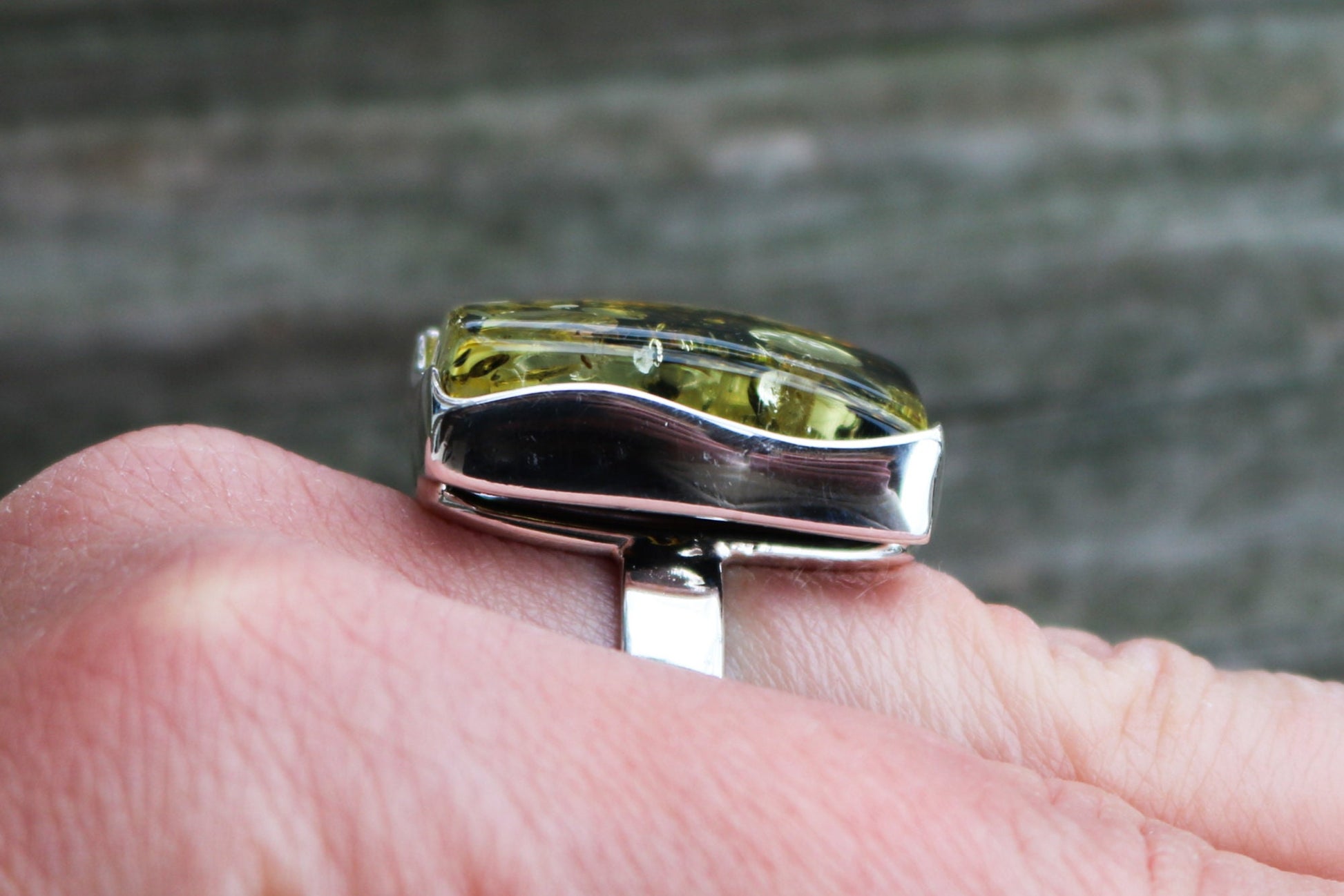Baltic Amber Ring Green Rectangle Adjustable Unisex 12.3 gram 925 Silver
