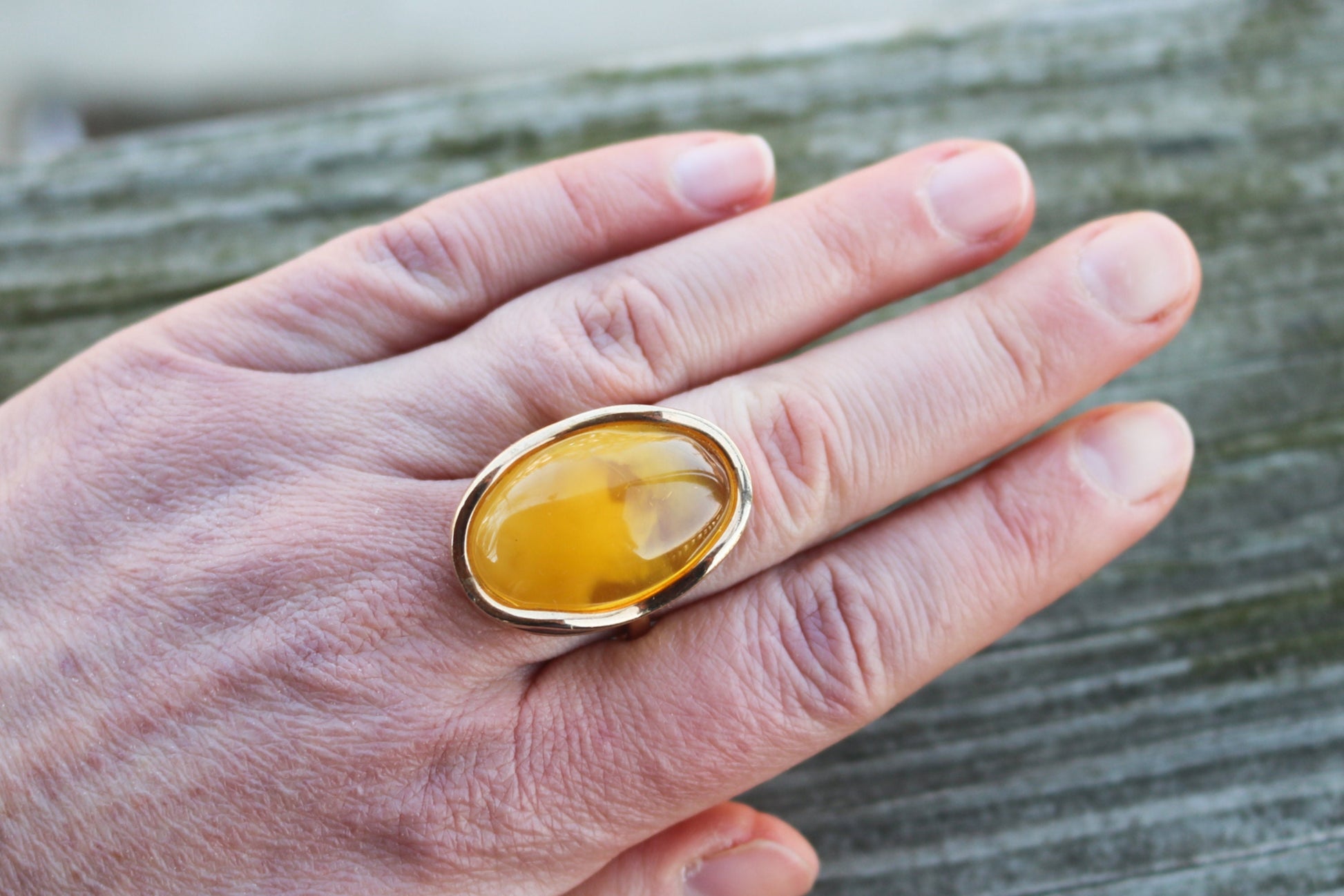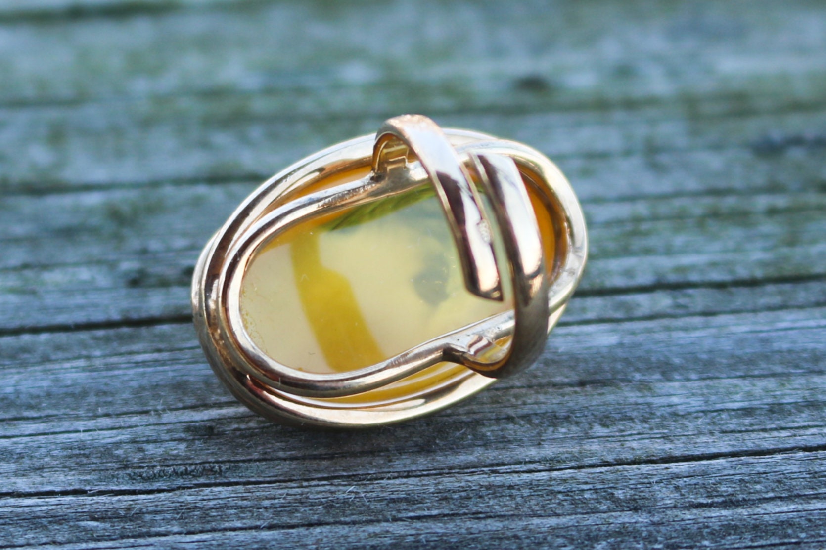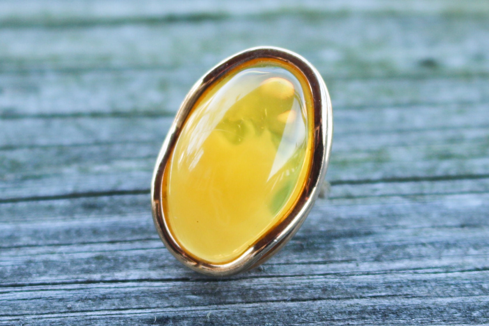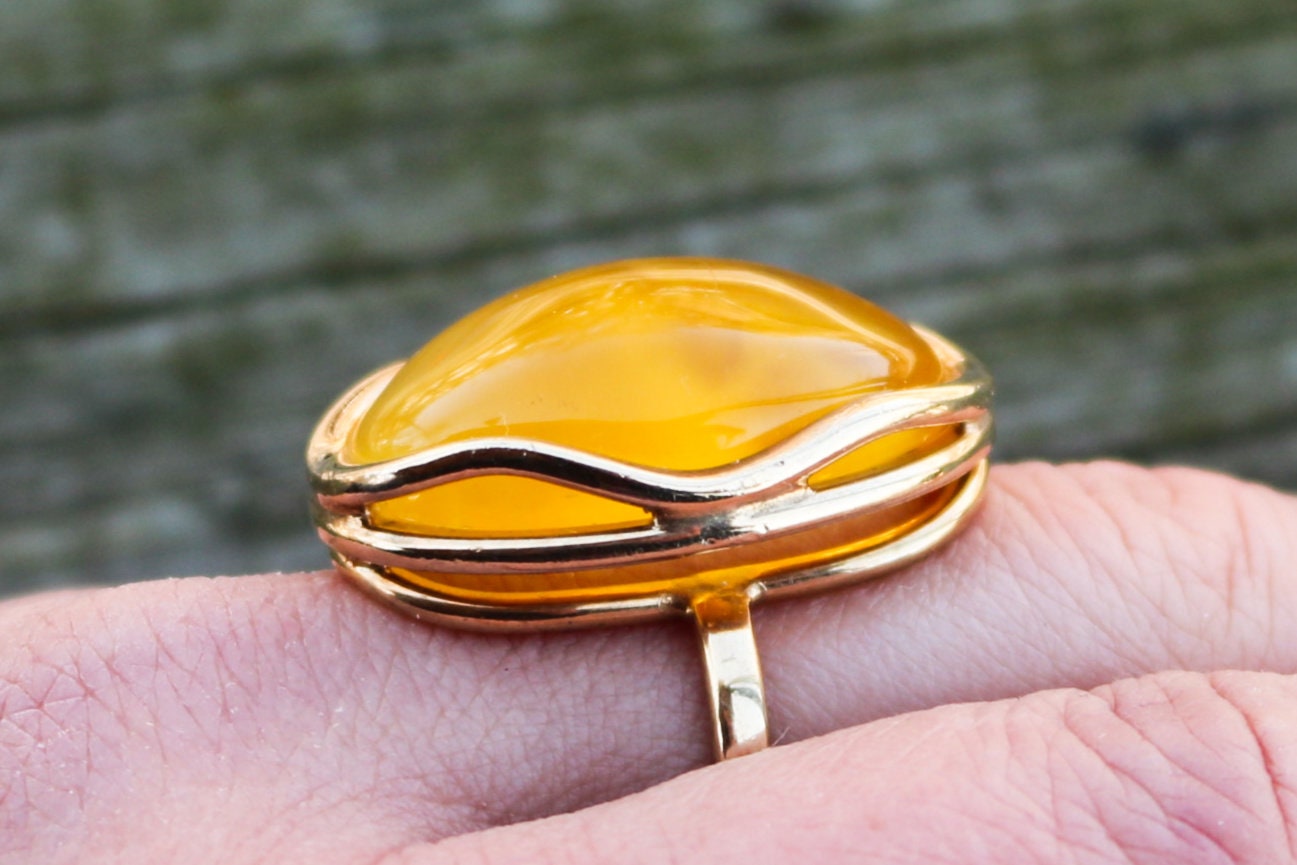 Unique Baltic Amber ring in natural untreated cloudy yellow color. Set in gold plated 925 sterling silver.