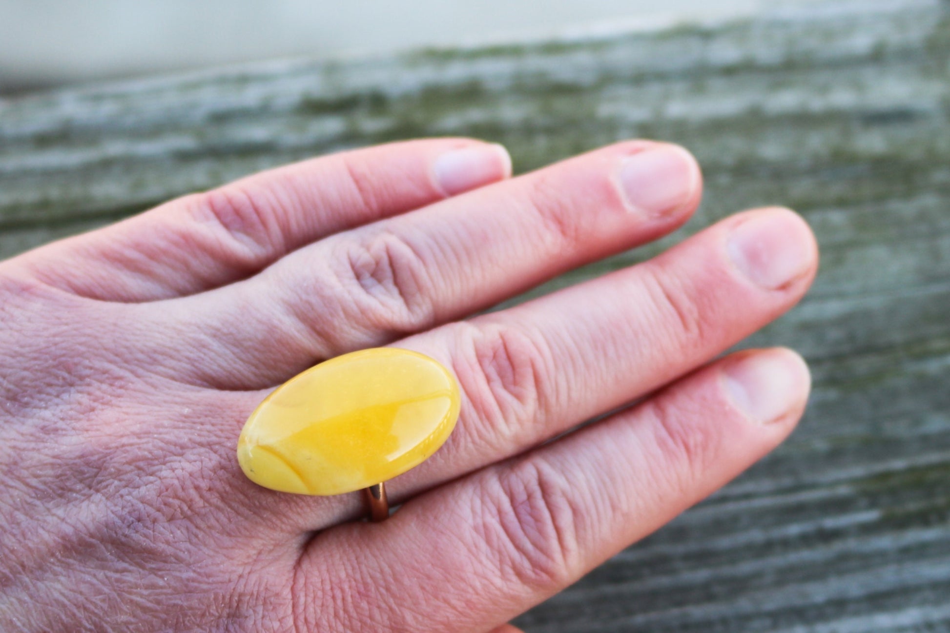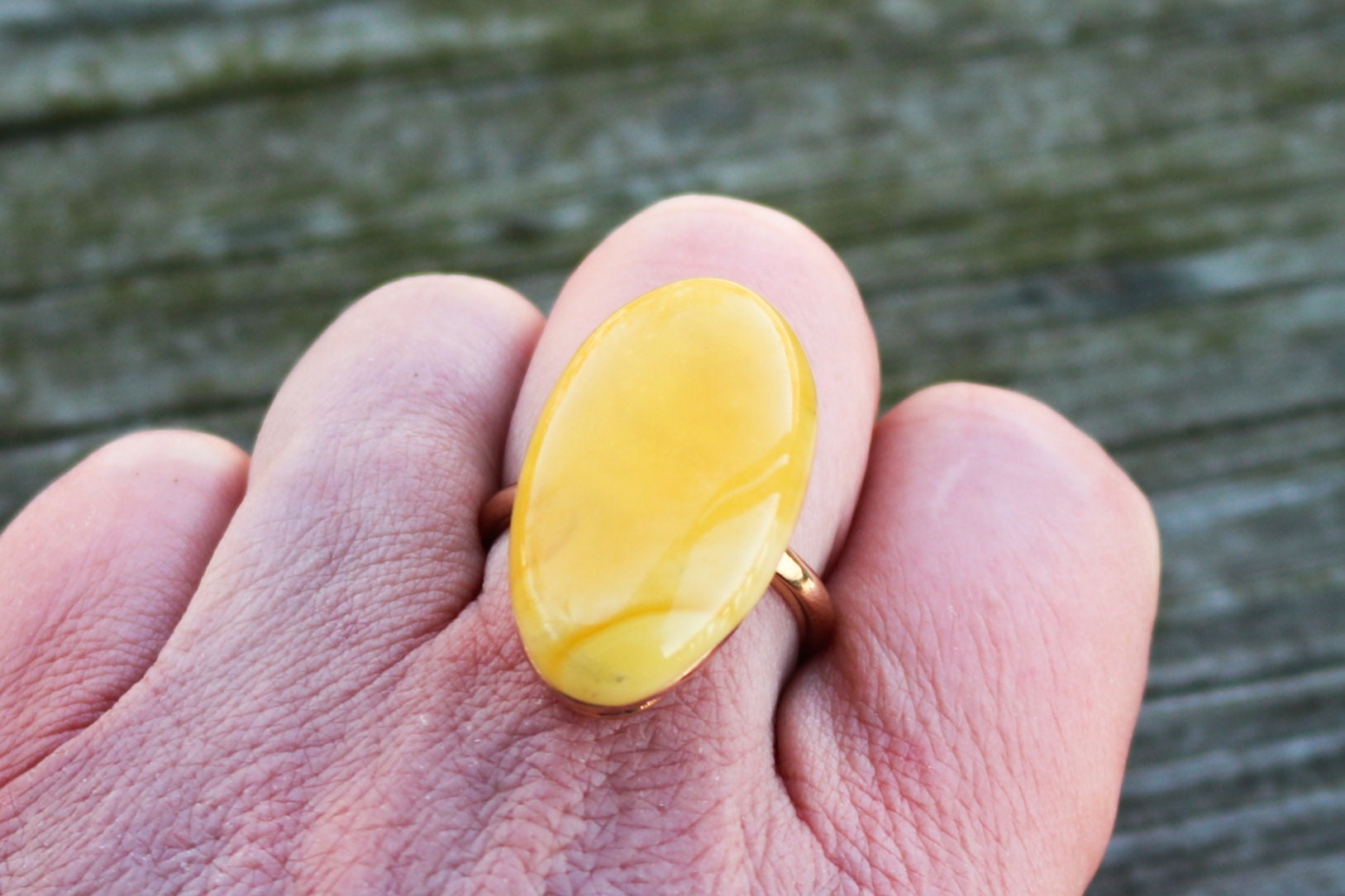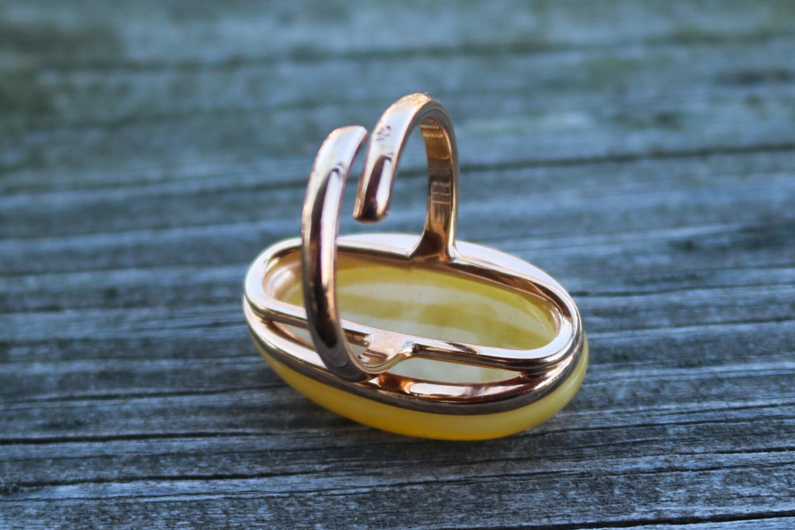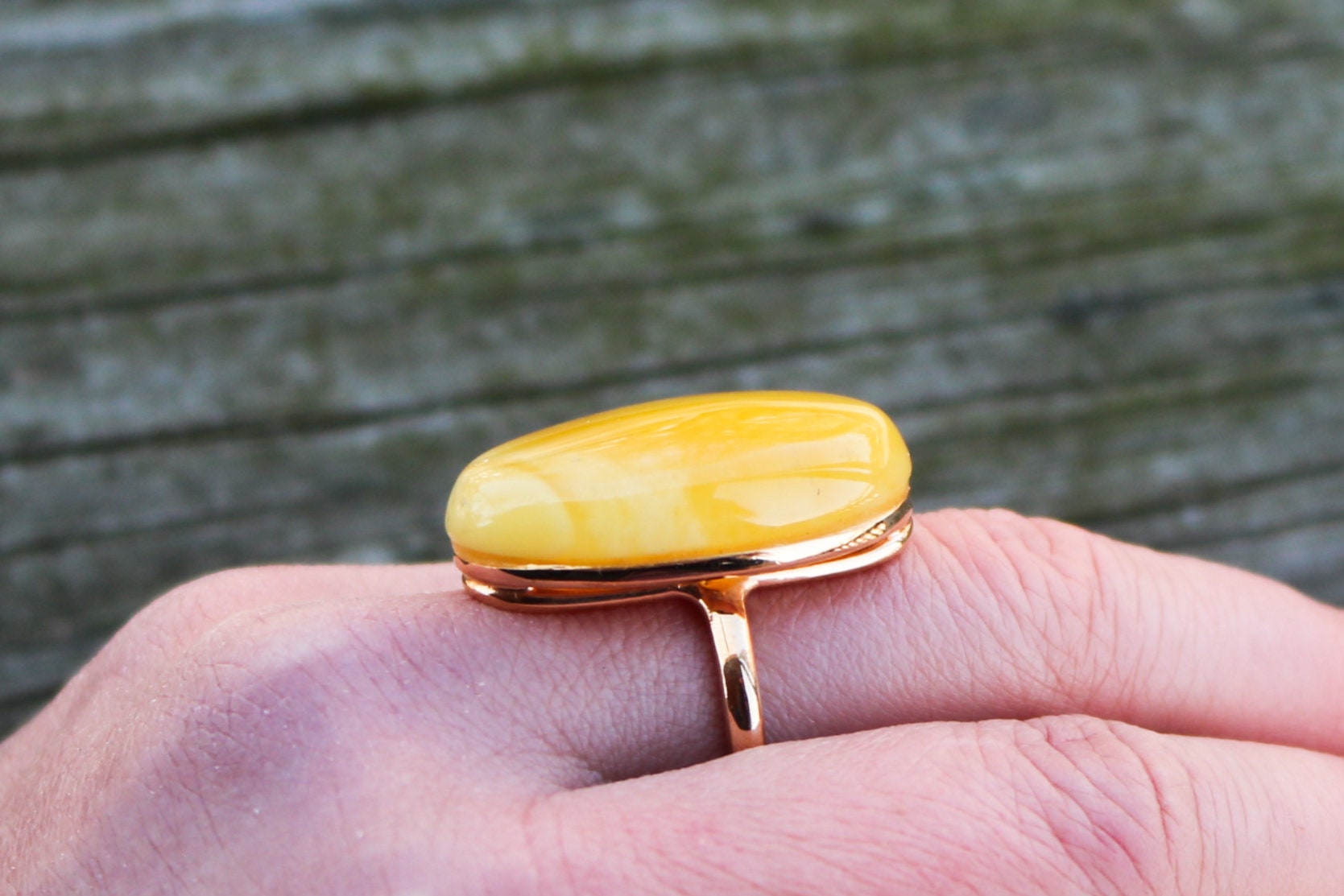 Unique Baltic Amber ring in natural untreated yellow color. Set in gold plated 925 sterling silver.