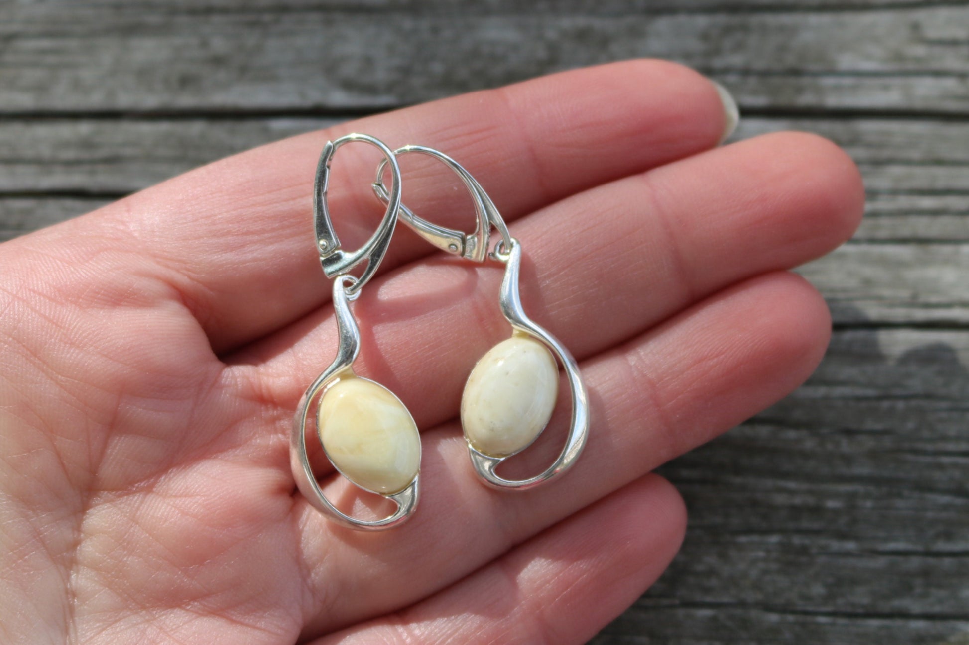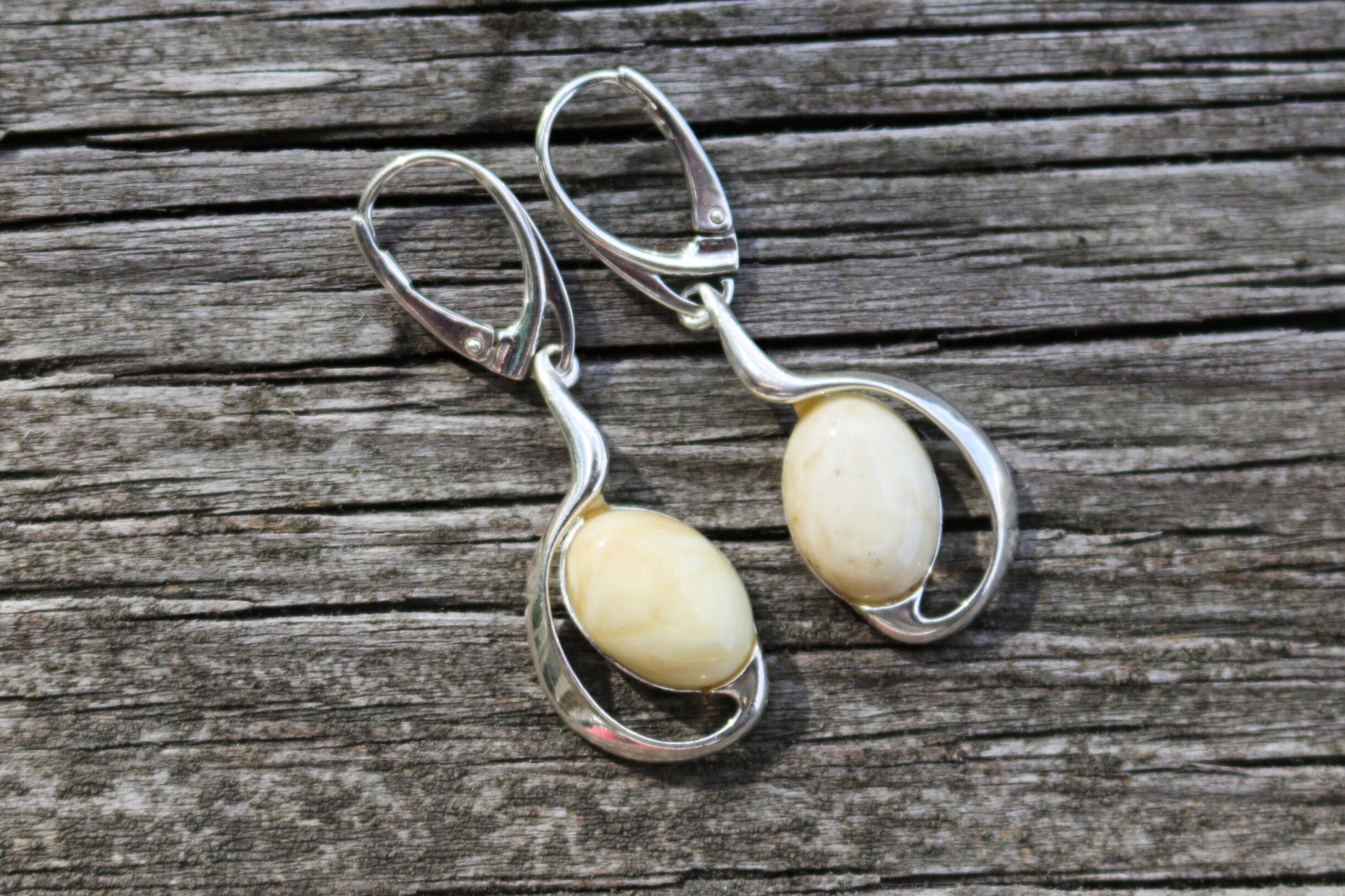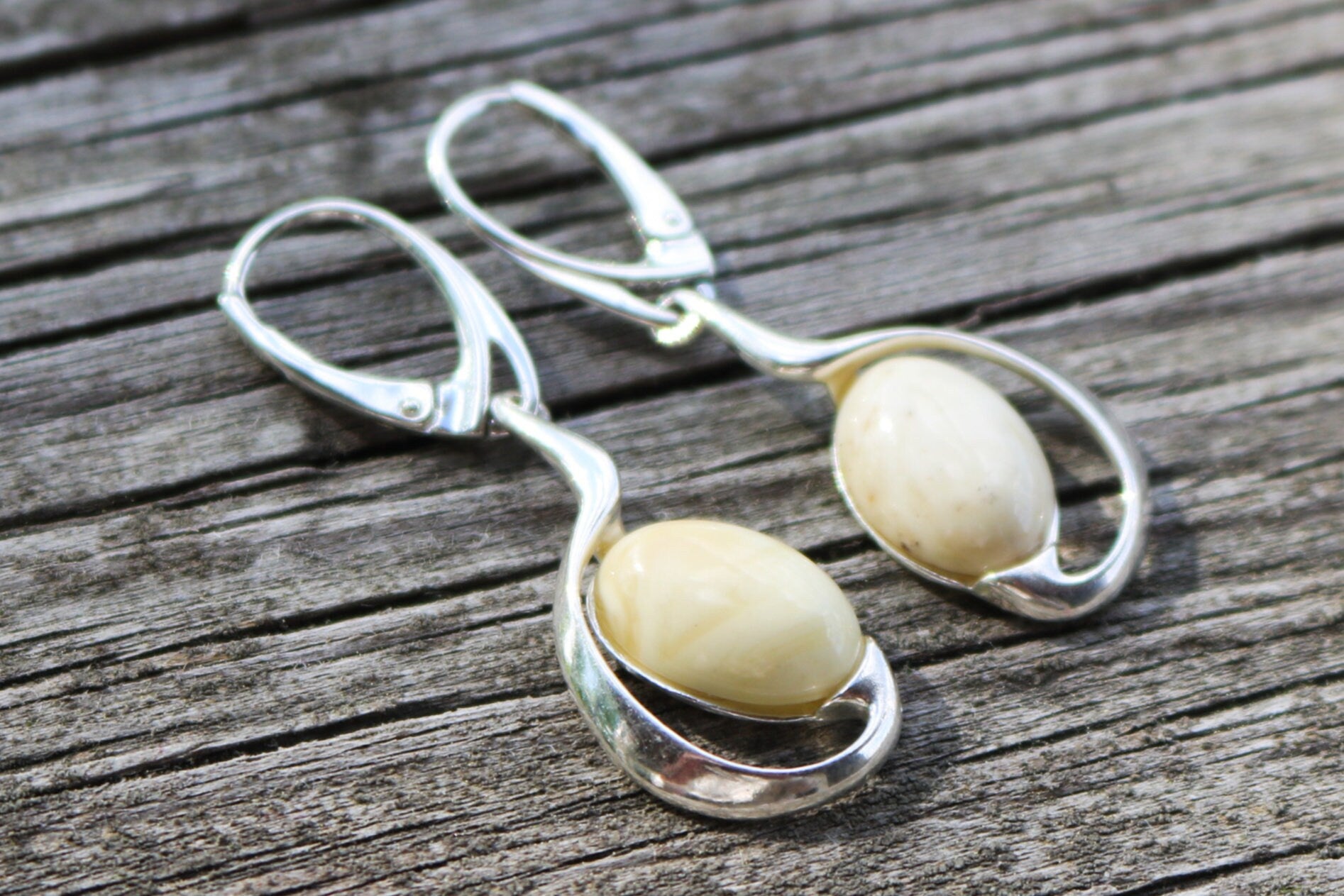 Baltic Amber earrings in milky Royal White color. This is natural untreated polished amber. Each bead is hand carved out of solid amber.