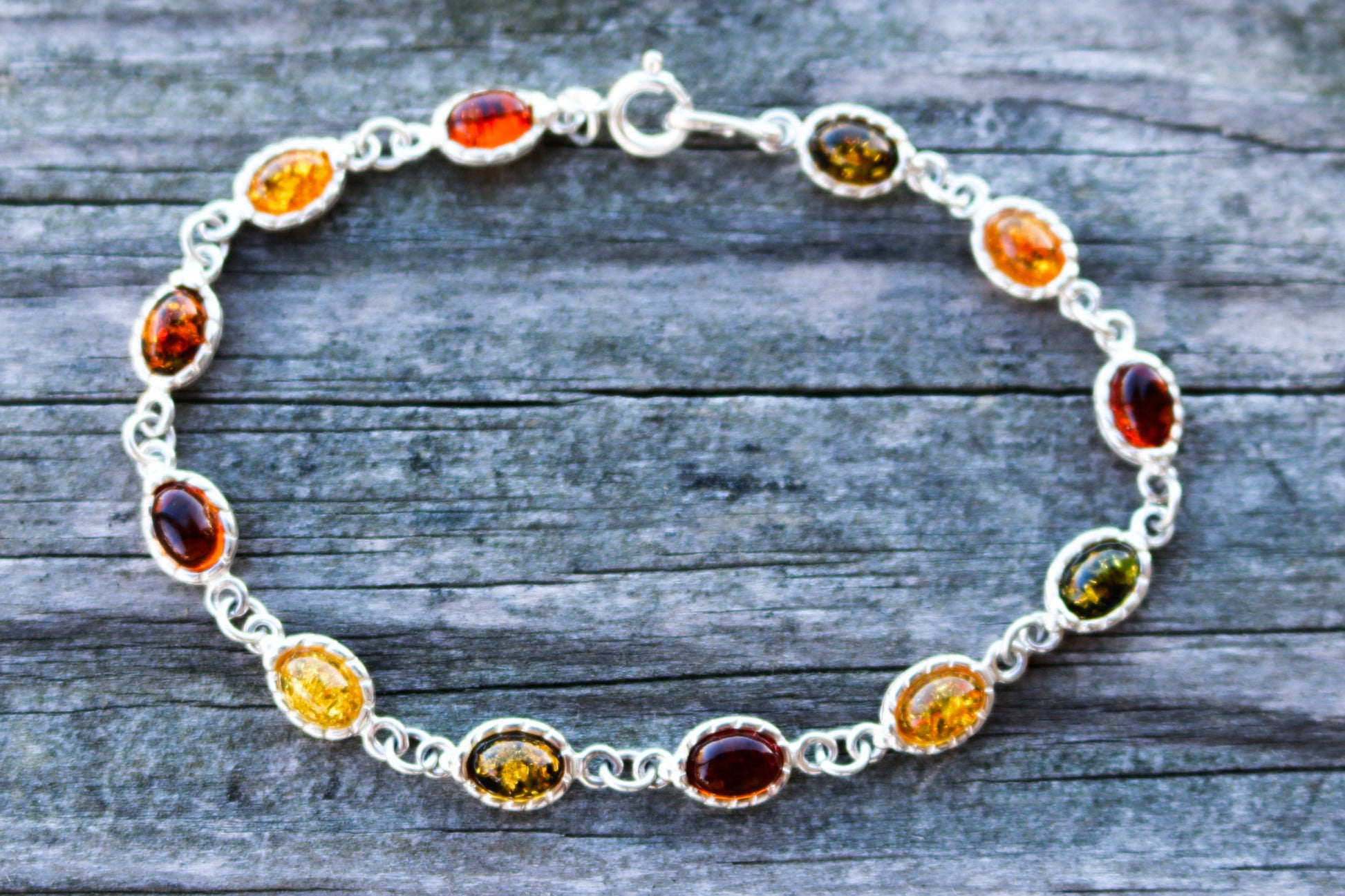 Baltic Amber bracelet made out of multicolor oval beads and set in 925 sterling silver.