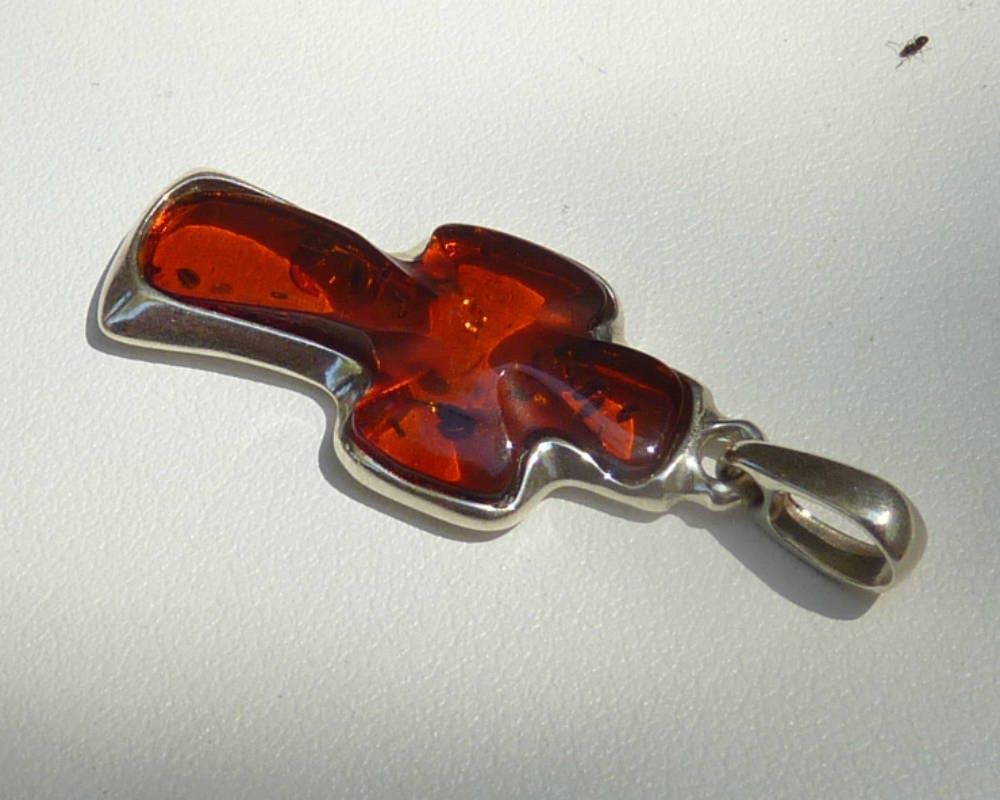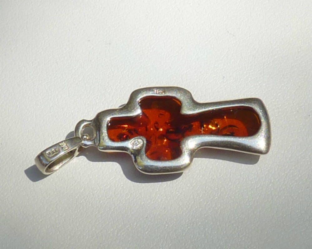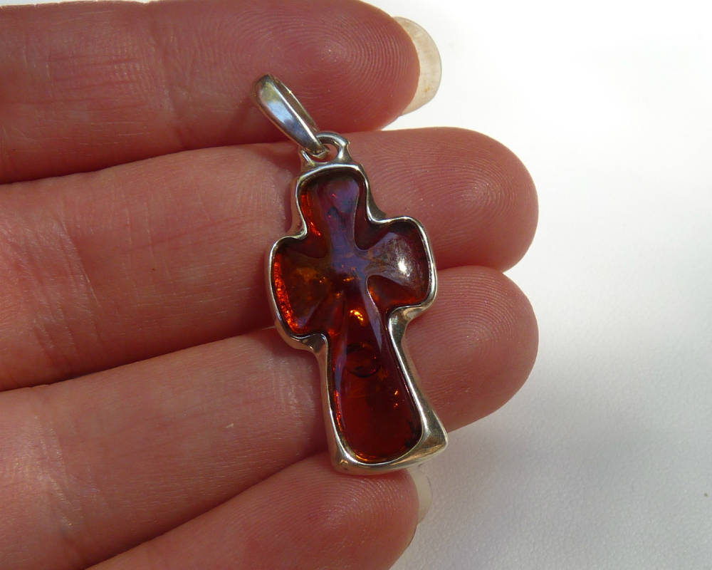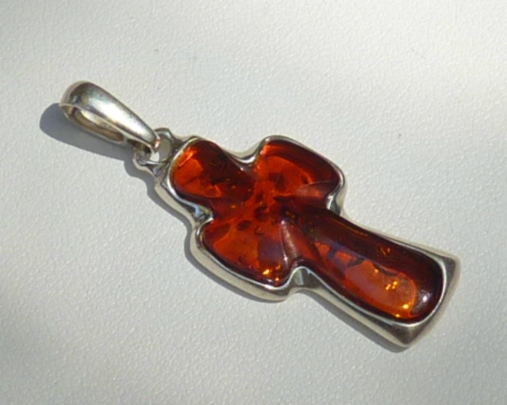 Baltic Amber handcrafted cognac color cross pendant in 925 sterling silver.
