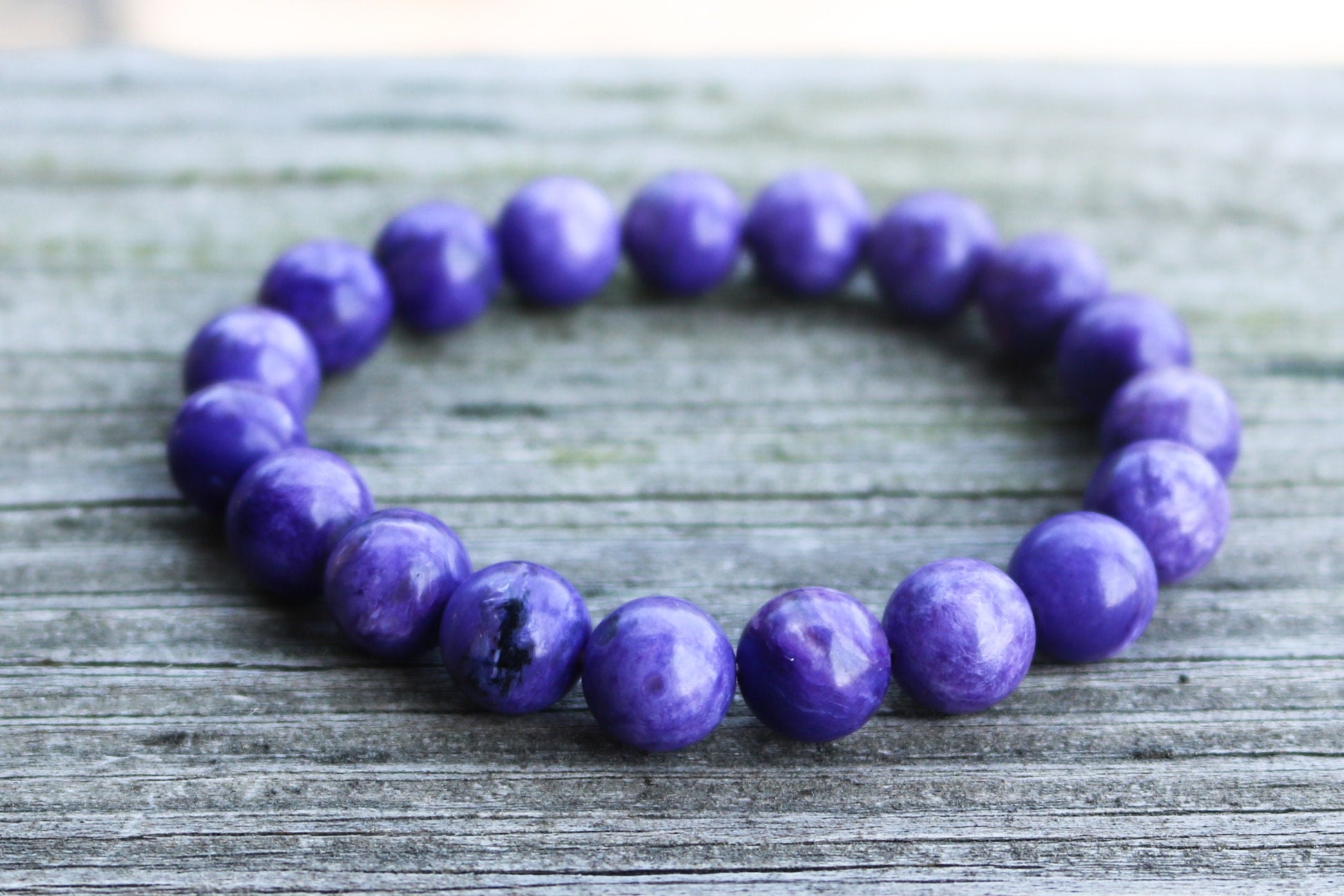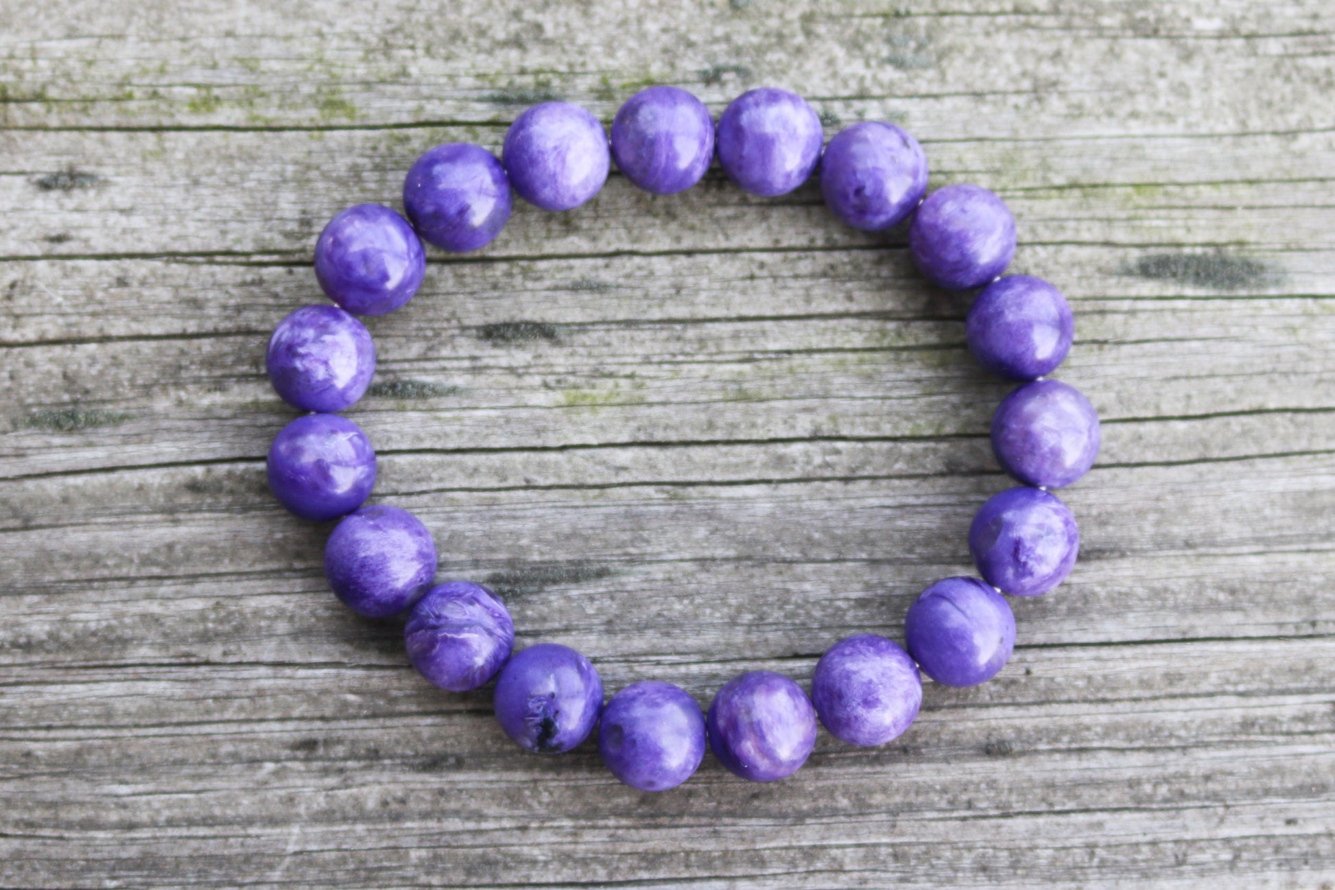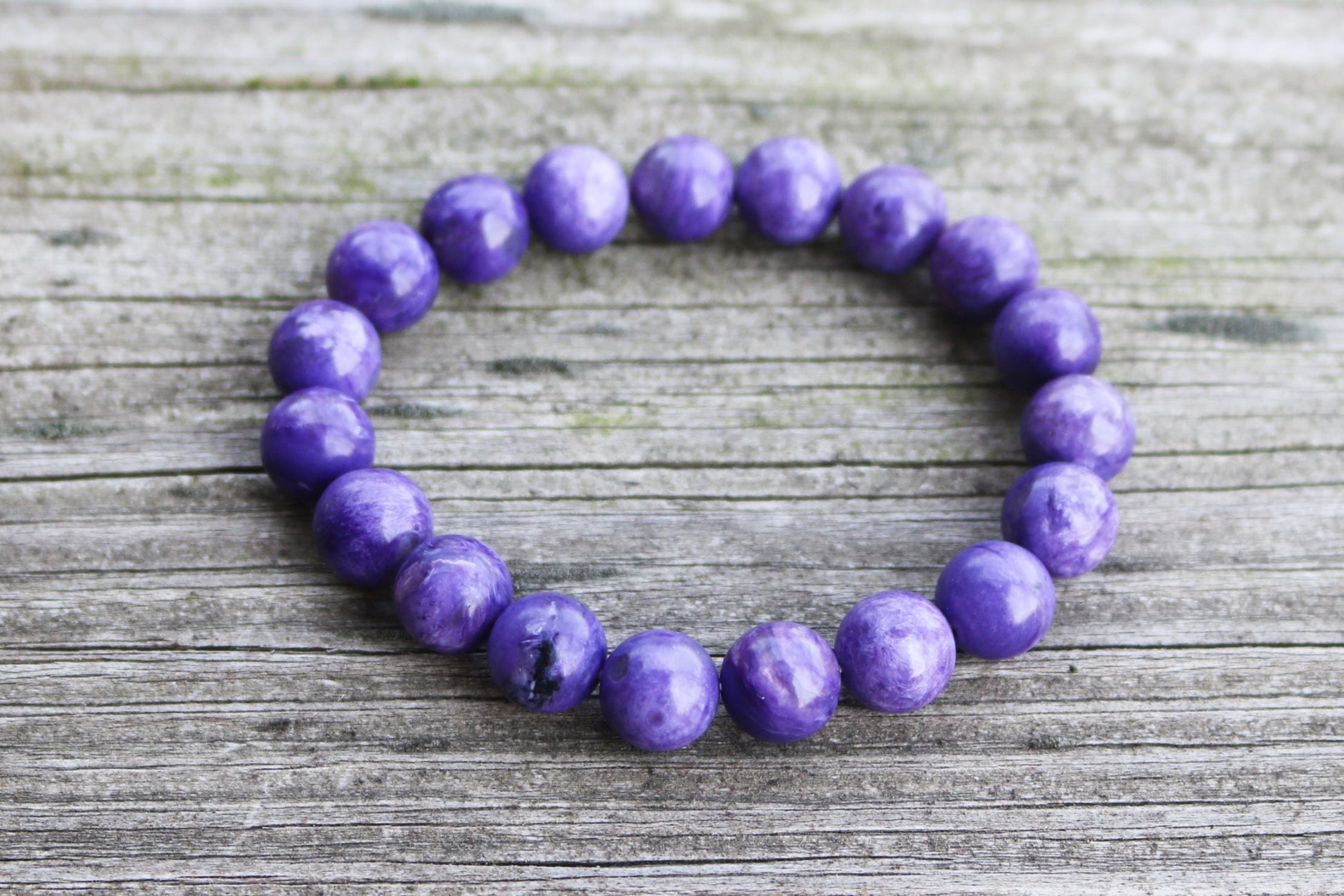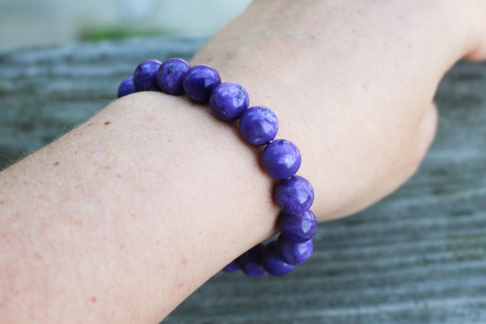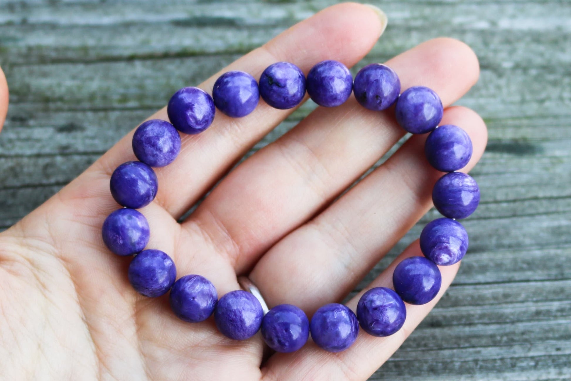 Natural charoite bracelet made out of ball beads 11 mm diameter each on elastic strand. 19 beads in total. The best grade AAA.
