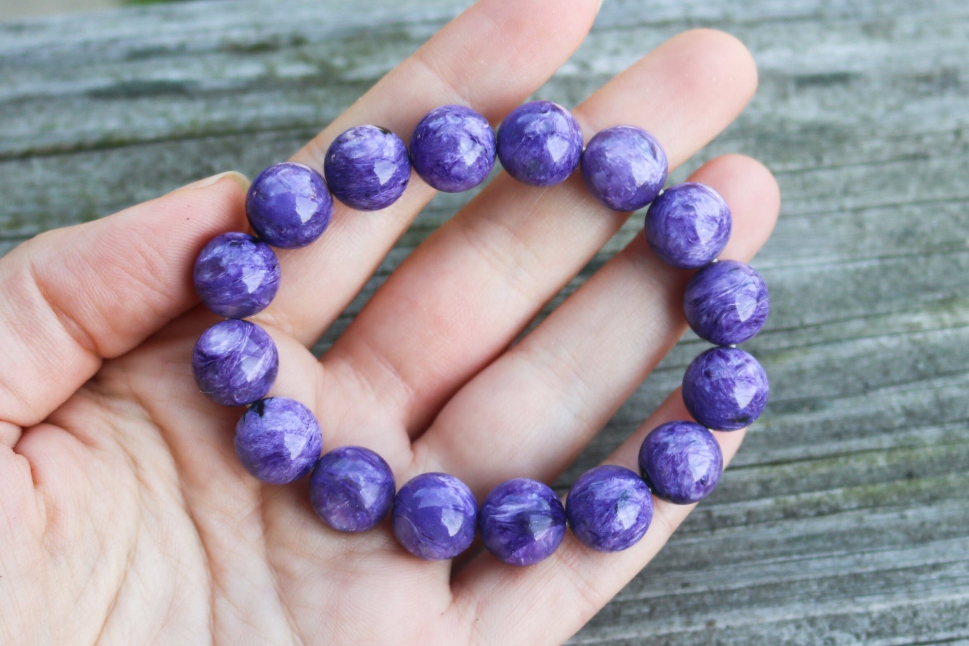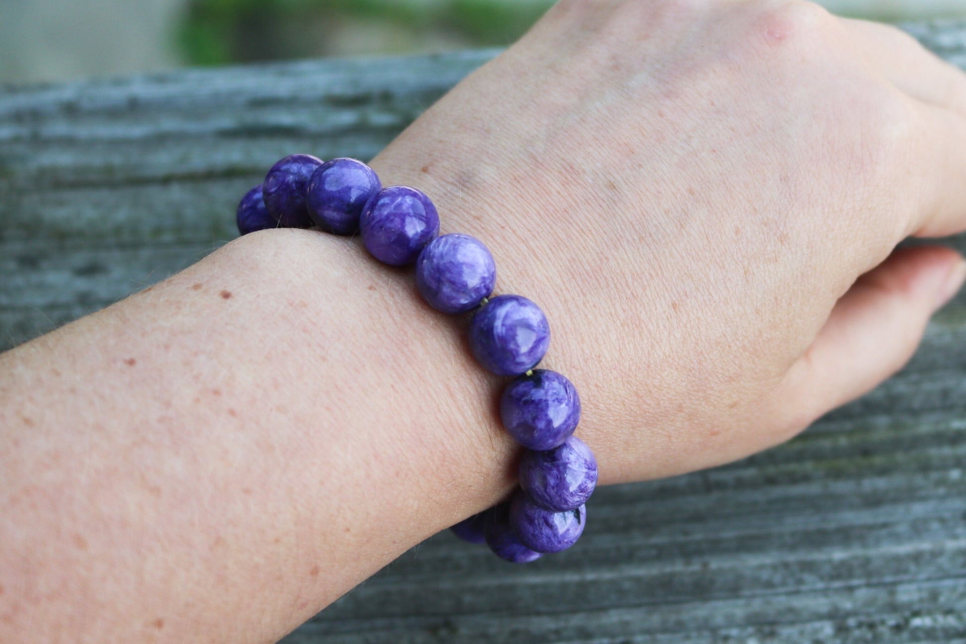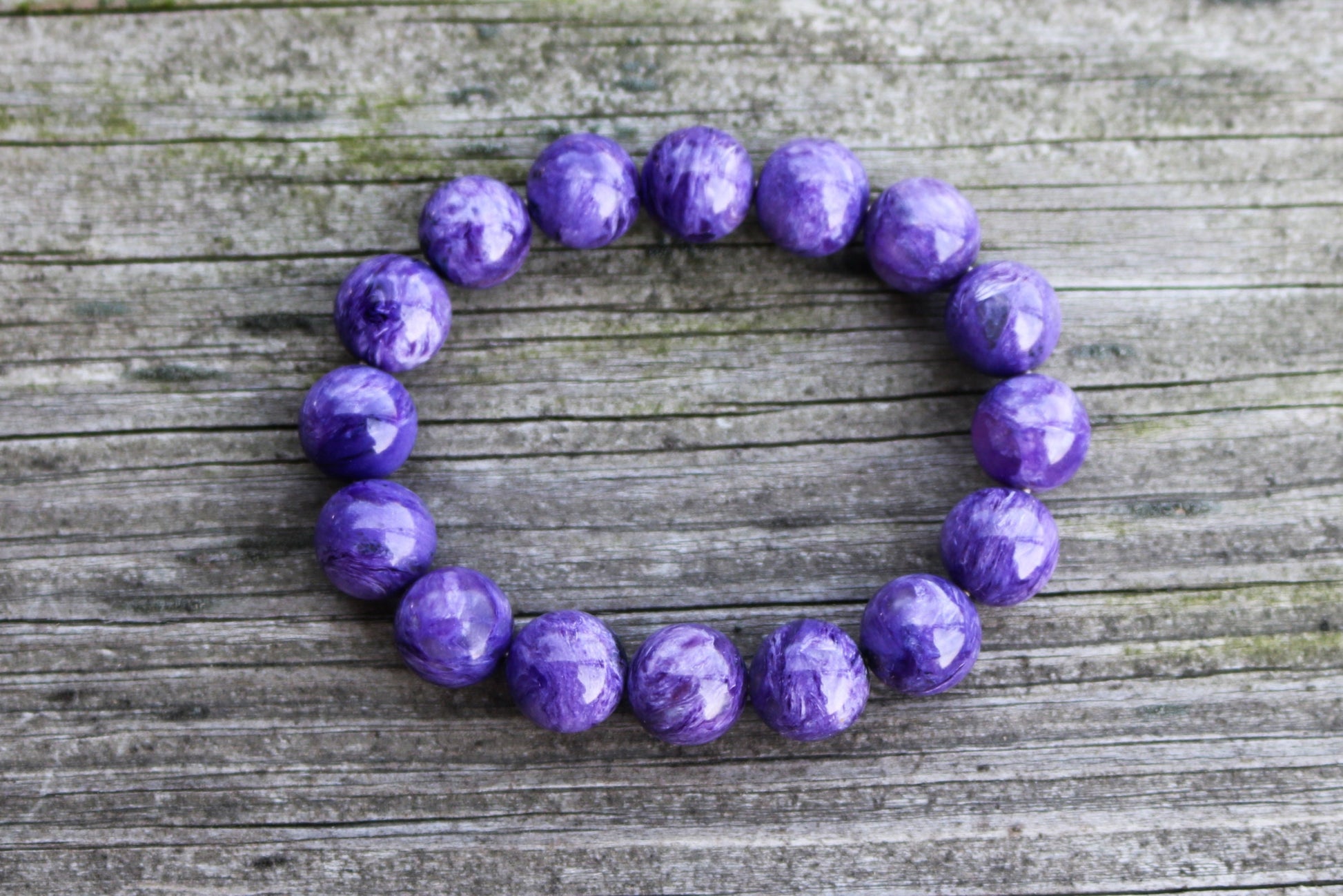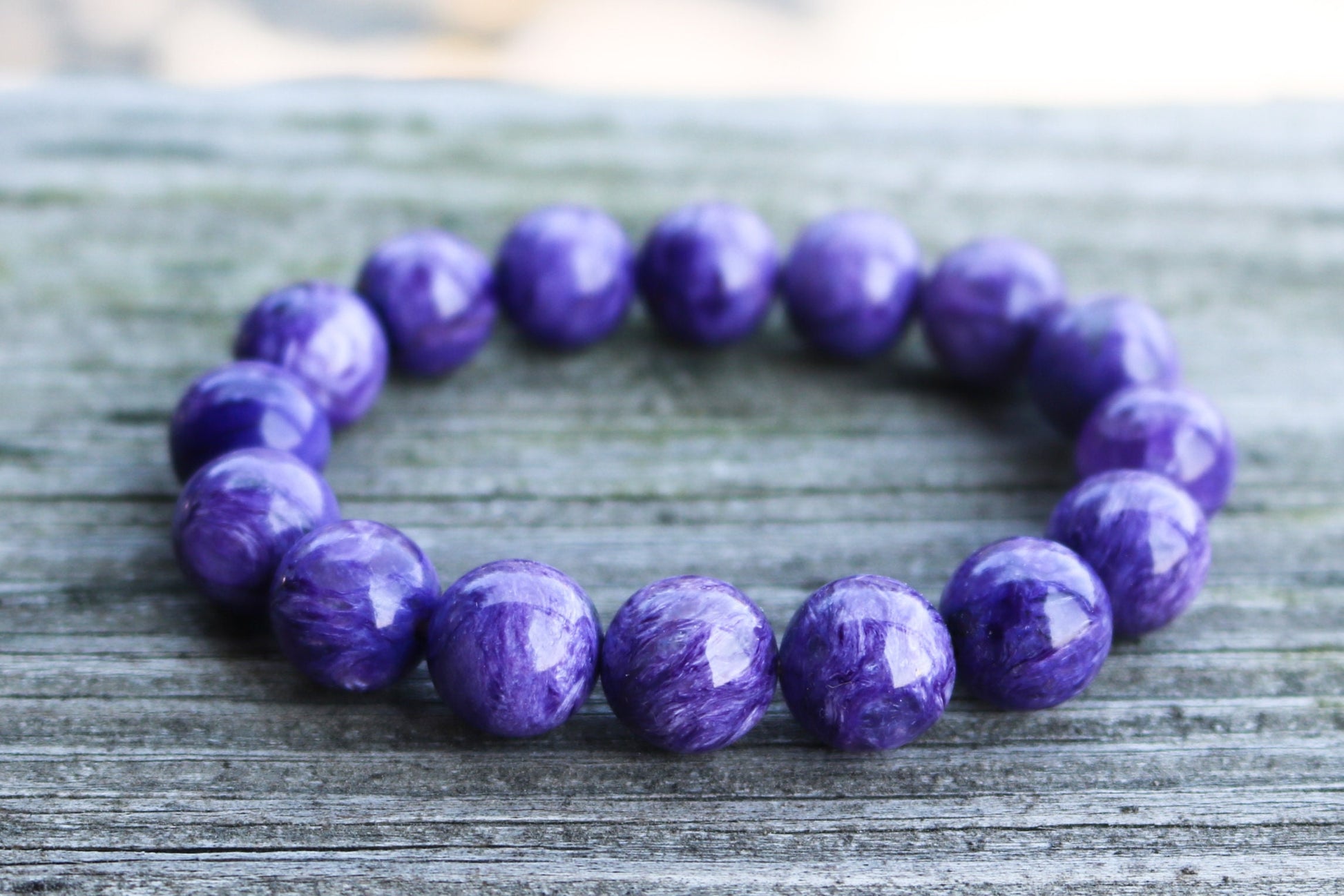 Natural charoite bracelet made out of ball beads 12.2 mm diameter each on elastic strand. 14 beads in total. The best grade AAA.