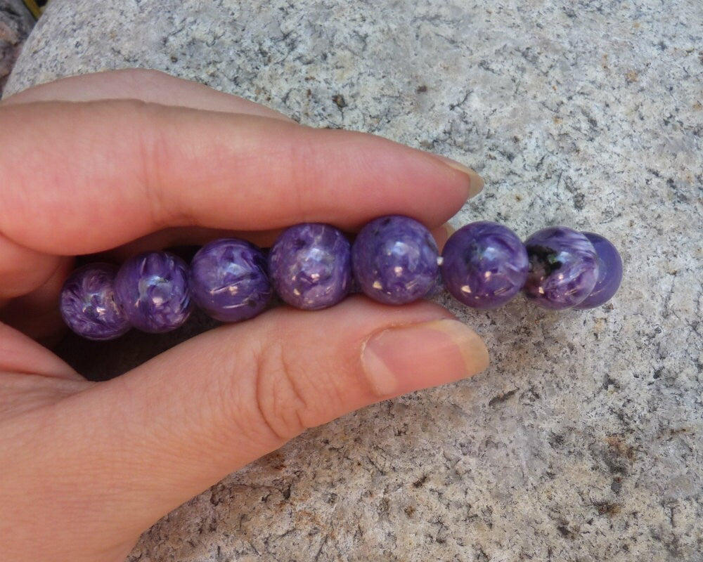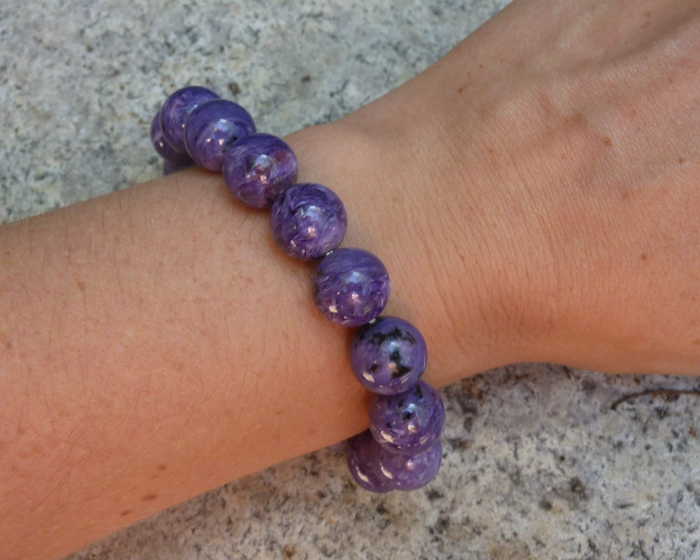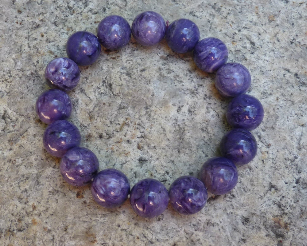 Natural charoite bracelet made out of ball beads 13 mm diameter each on elastic strand. 16 beads in total. The best grade AAA.