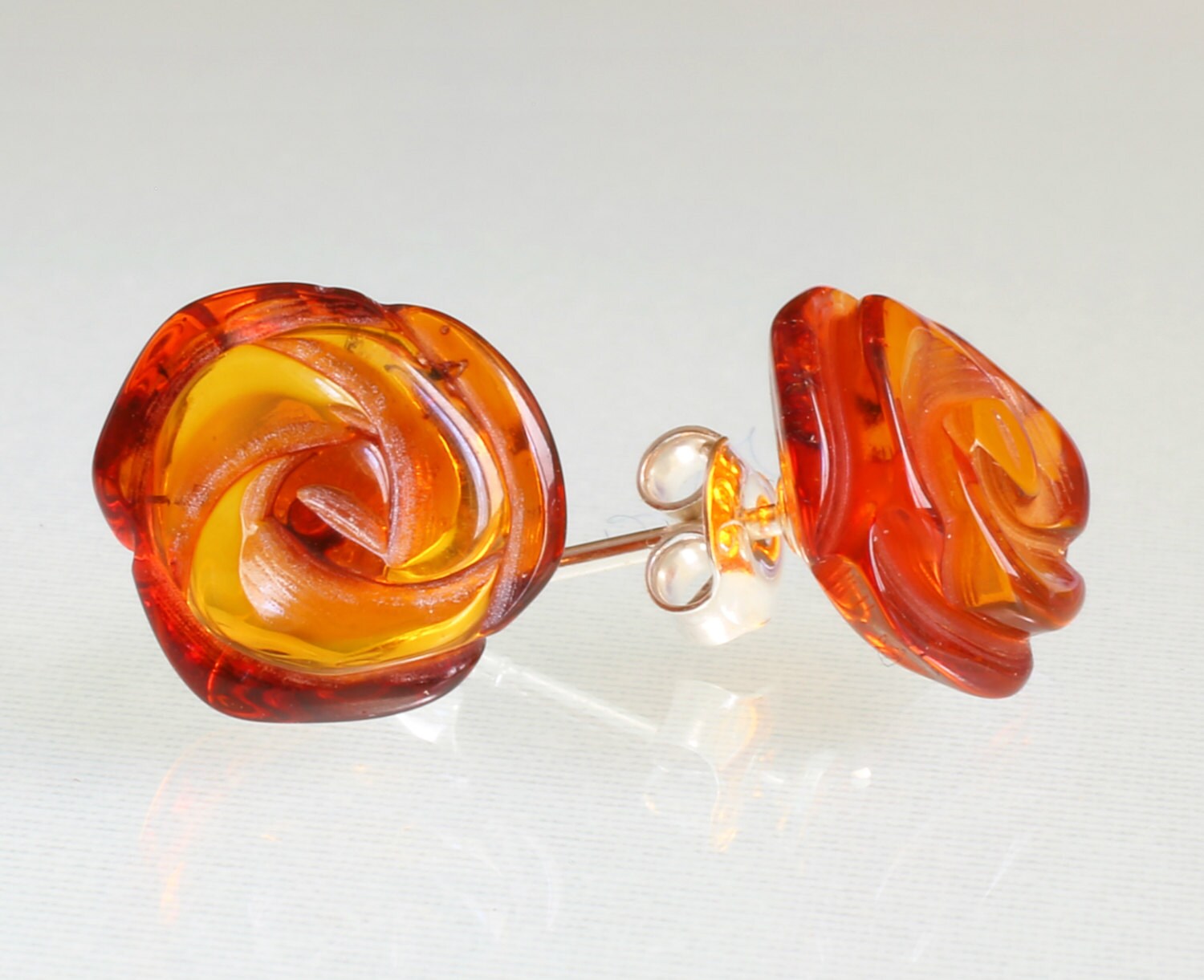 Hand carved rose shape Baltic Amber studs. Natural translucent cognac color. Set in 925 sterling silver.