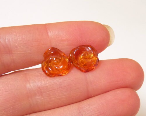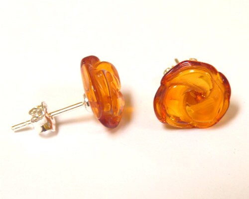 Hand carved rose shape Baltic Amber studs. Natural translucent honey color. Set in 925 sterling silver.